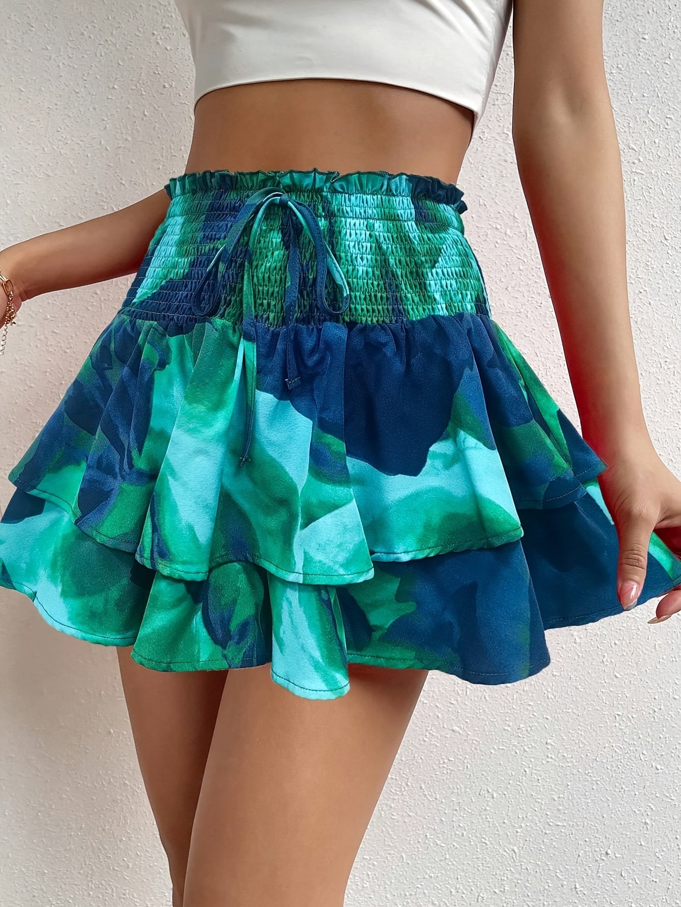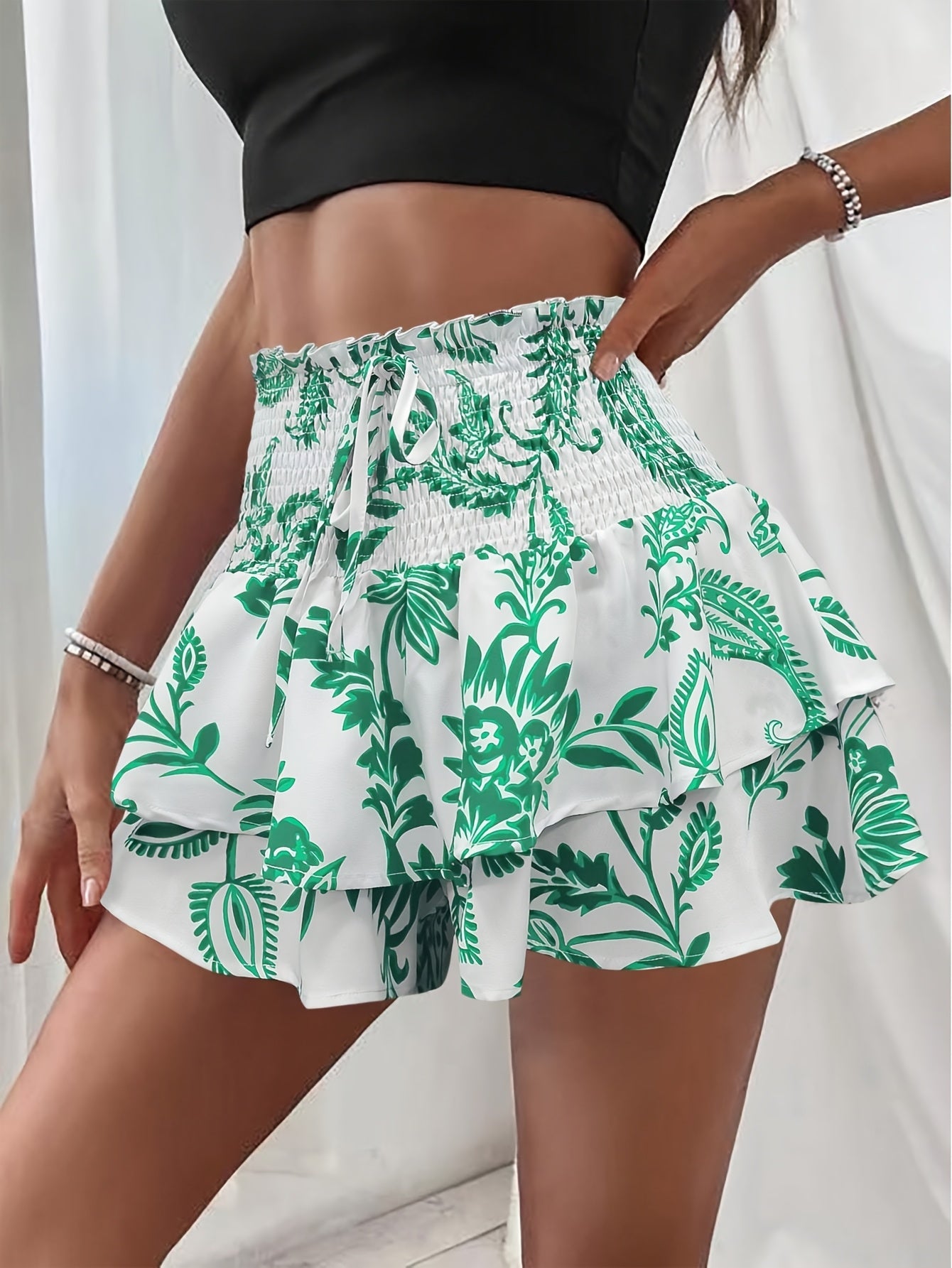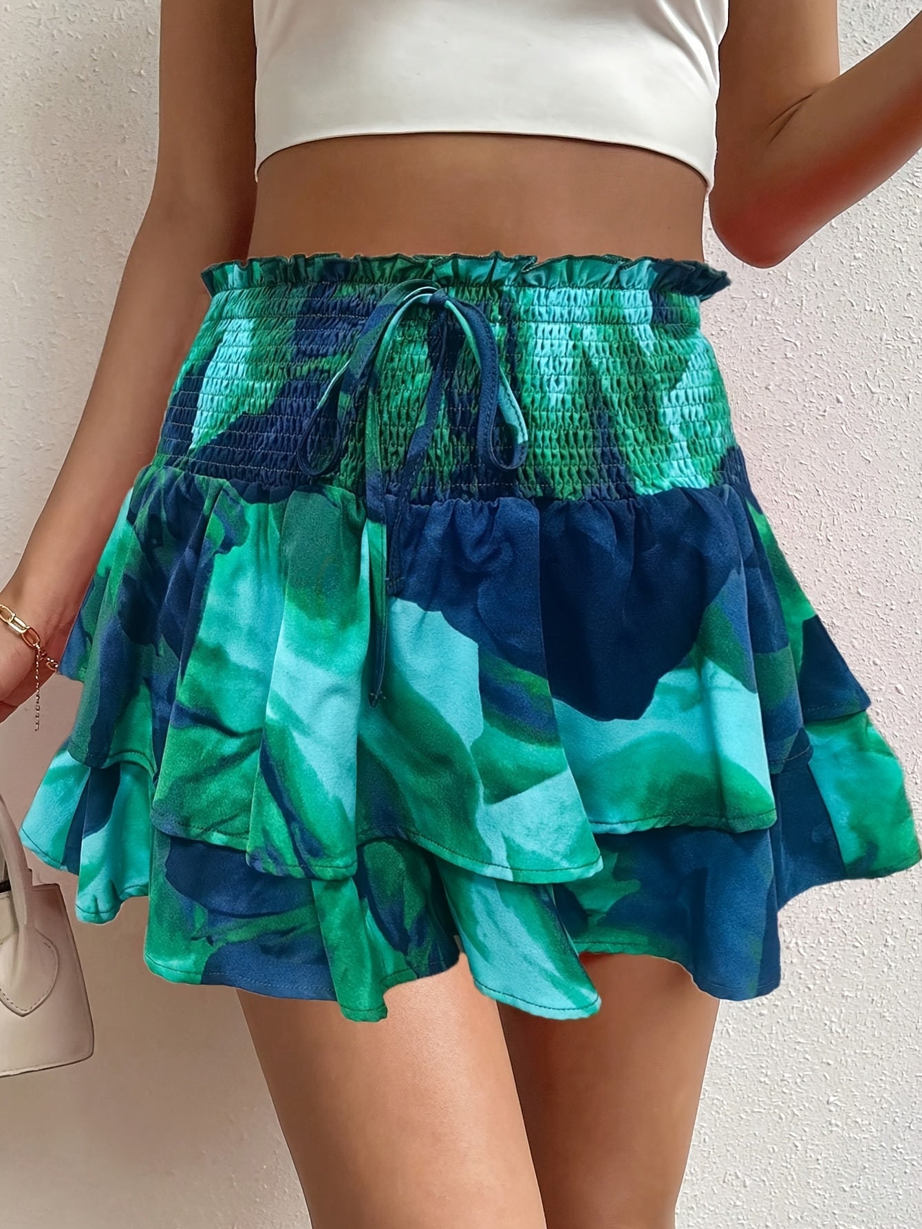 Shorts de cintura alta para mujer: elegante detalle de lazo frontal y estampado abstracto
