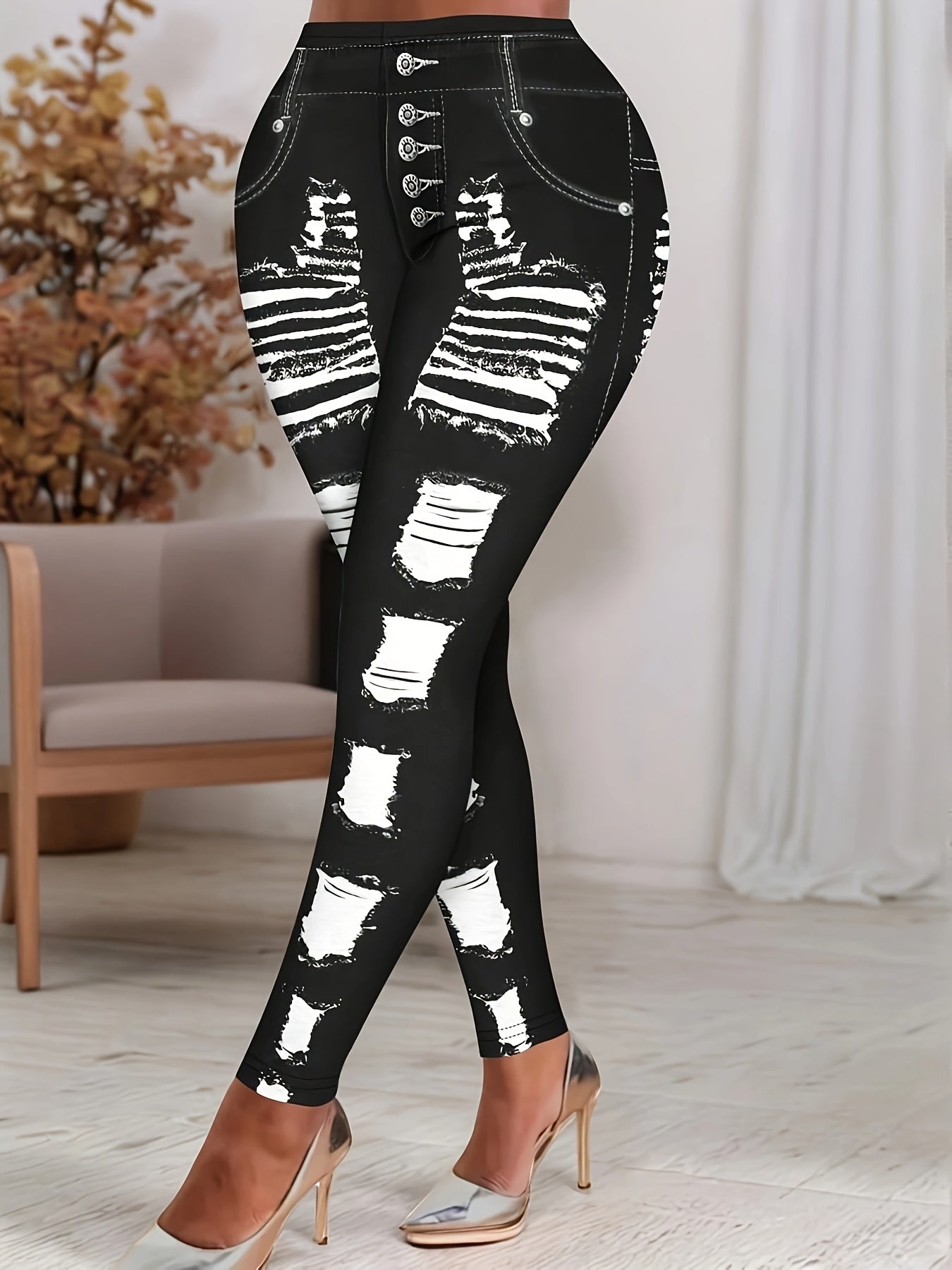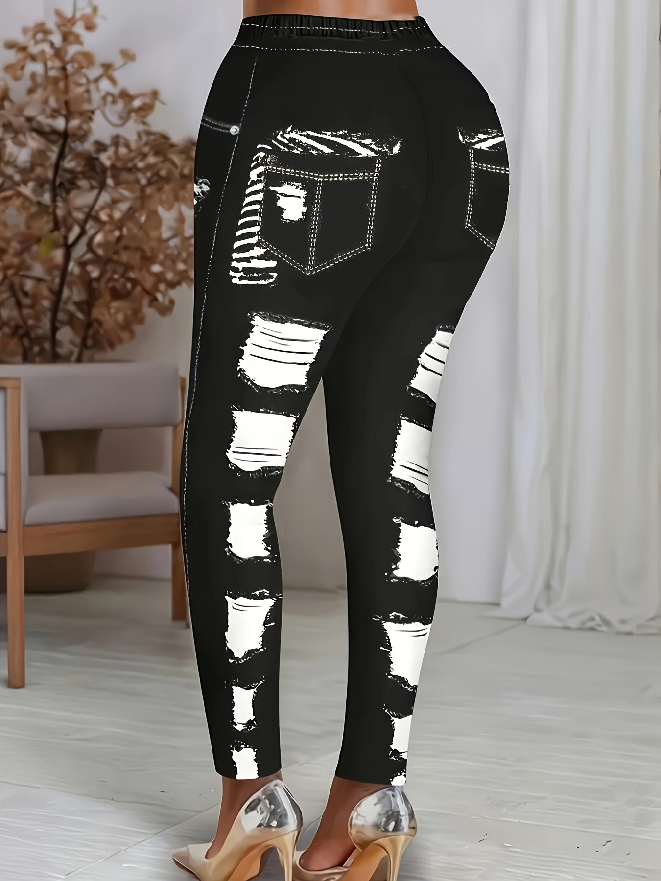 Pantalones negros de cintura alta con efecto denim para mujer: estampado roto y corte elástico.