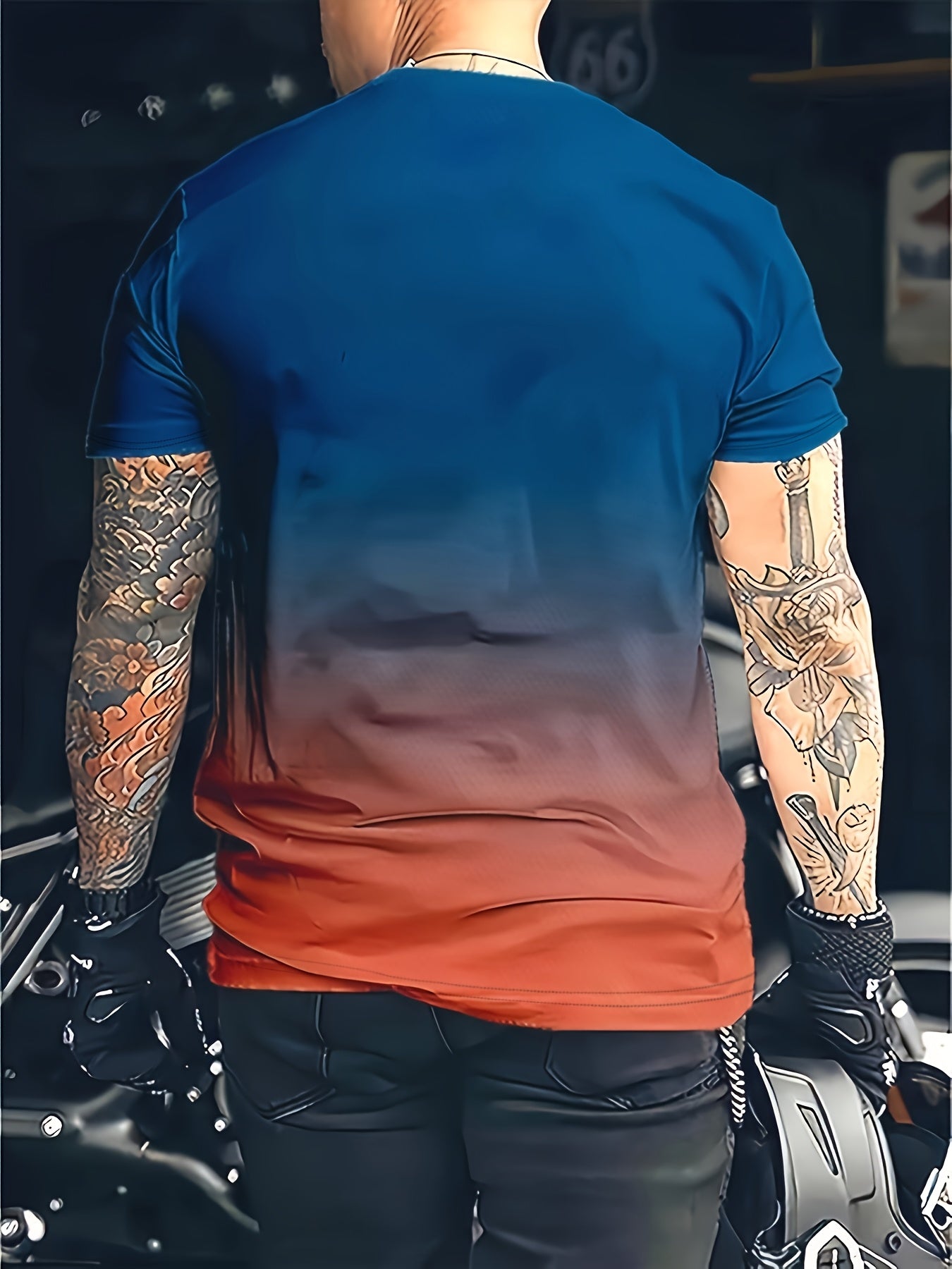 Luce con estilo con nuestra camiseta de color degradado para hombre, una adición versátil a tu estilo casual. Su diseño único y su tejido cómodo la convierten en una prenda imprescindible para quienes buscan la moda. Perfecta para combinar con jeans o shorts, esta camiseta está diseñada para el hombre moderno que valora tanto la estética como la funcionalidad.