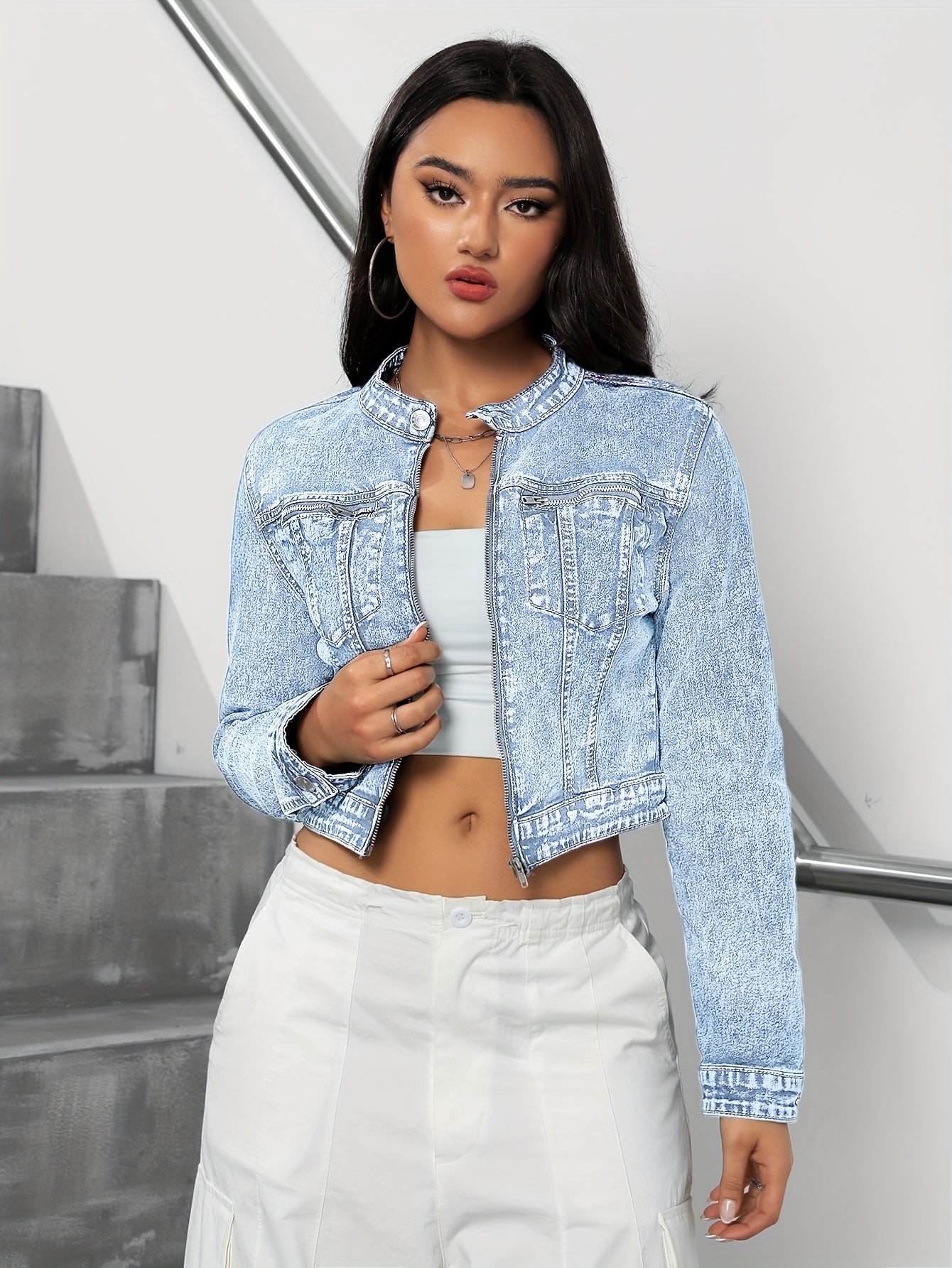 Chaqueta vaquera azul claro para mujer - Manga larga, cierre de cremallera, estilo informal