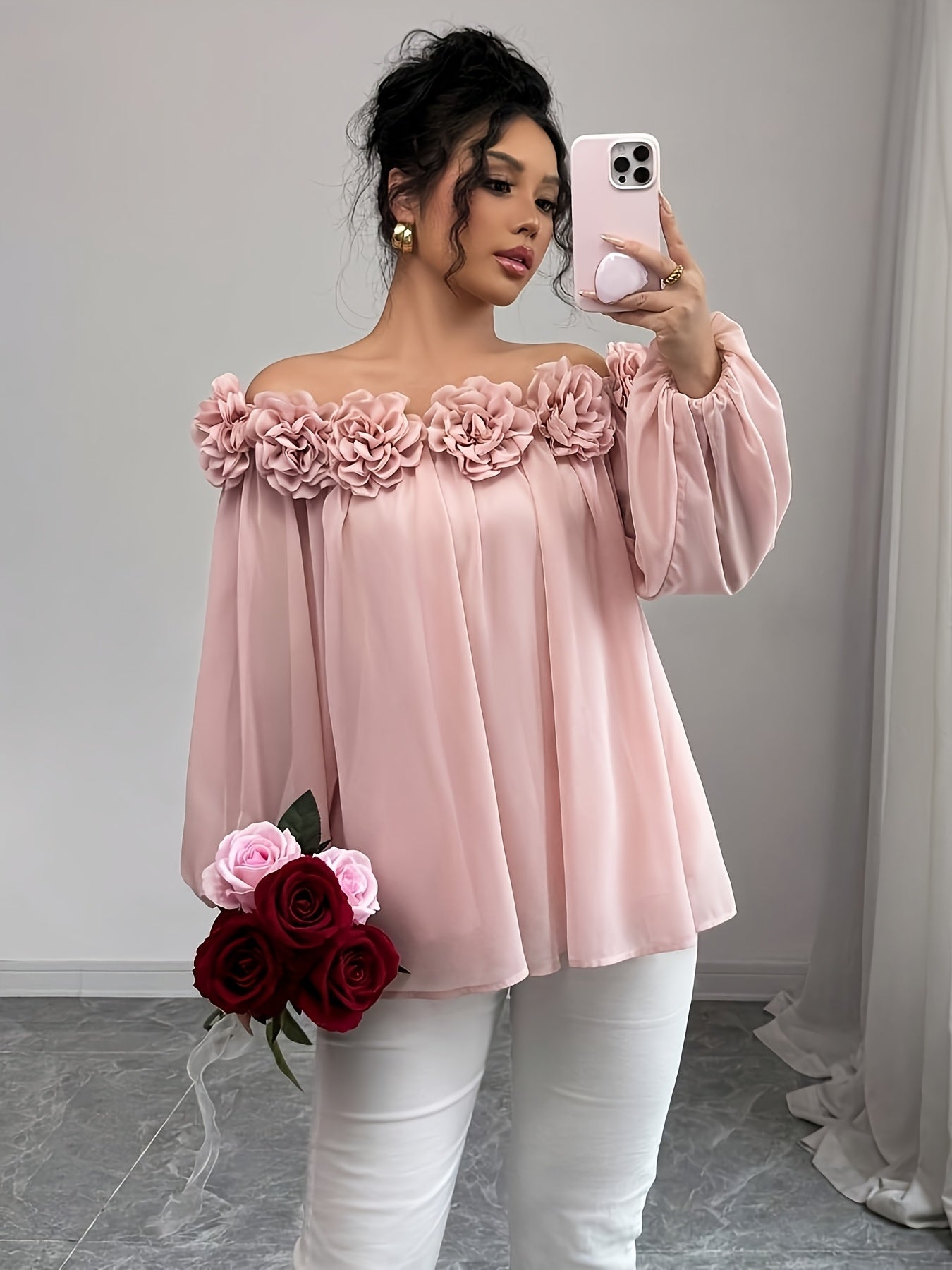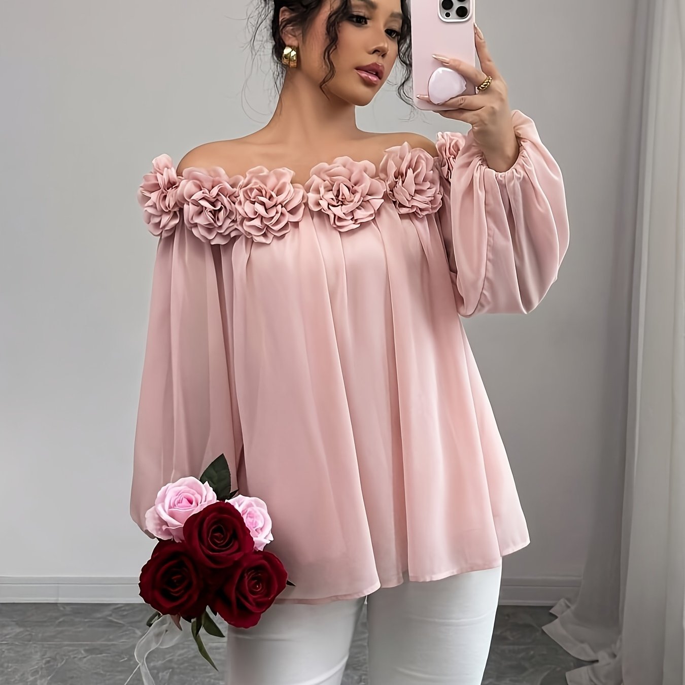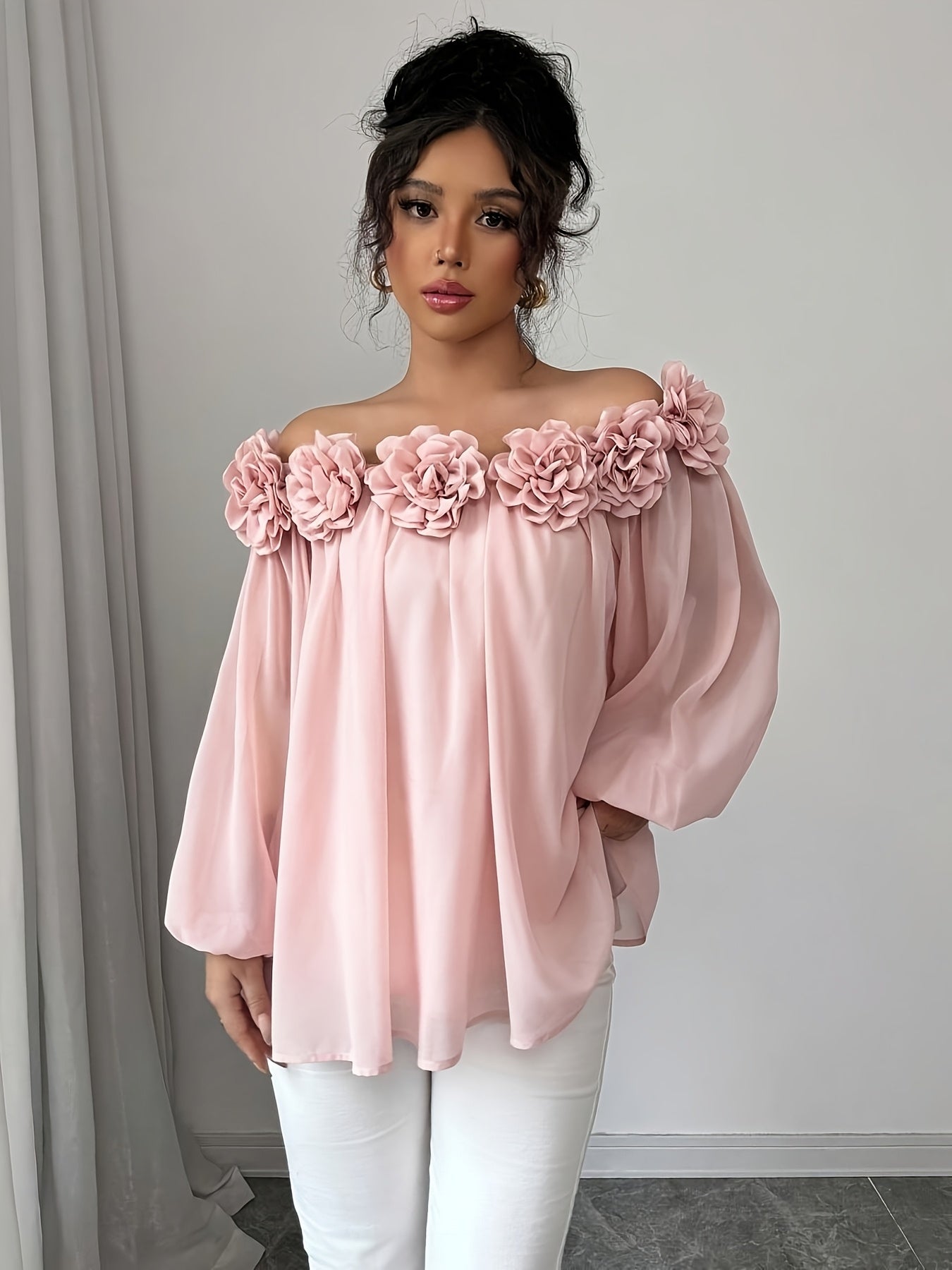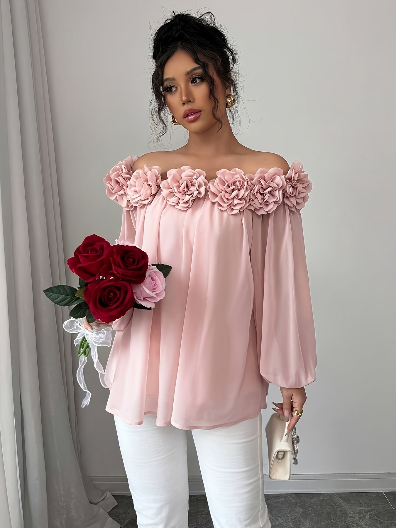 Elegante blusa de gasa con hombros descubiertos - Diseño floral 3D, para uso diario
