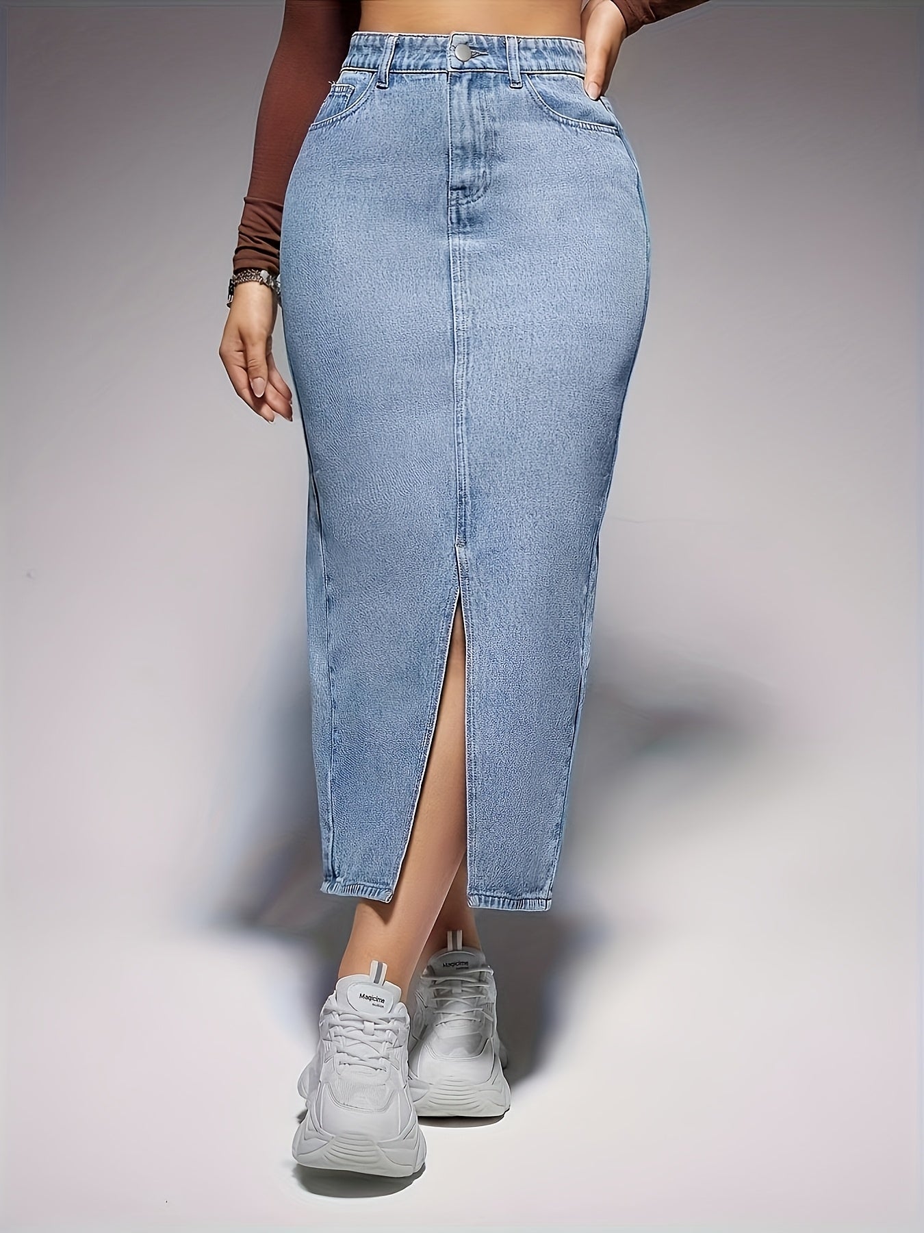 Falda vaquera elástica de cintura alta estilo sirena para mujer - Azul lavado
