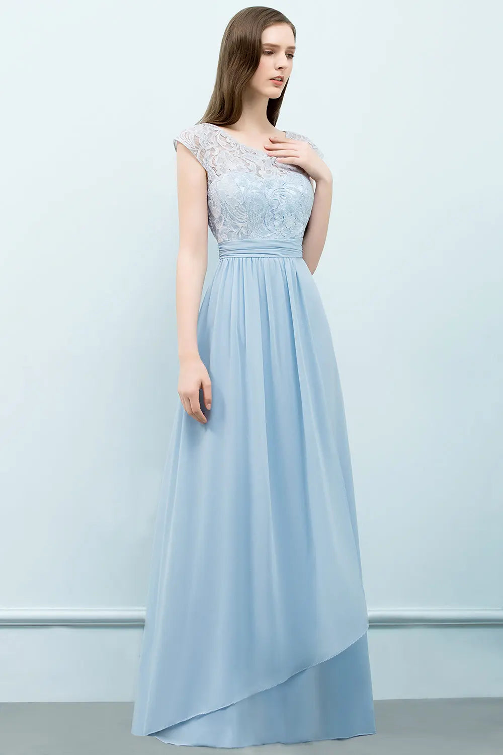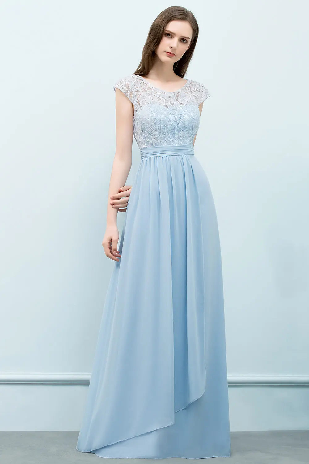 Descubre el encantador vestido de dama de honor de gasa azul claro BABYONLINE, elaborado con maestría para brindar elegancia y sofisticación. Este vestido largo hasta el suelo presenta delicadas mangas cortas y una favorecedora silueta en forma de A, perfecto para todas las edades y ocasiones especiales, sin químicos dañinos.