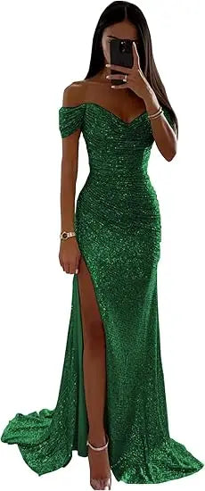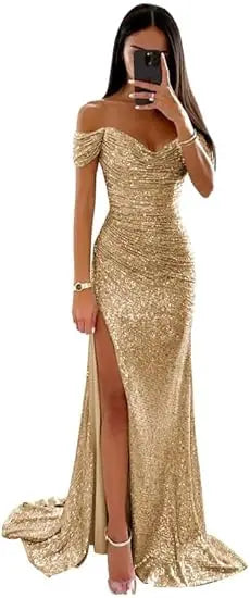Realza tu ocasión especial con el vestido de dama de honor sirena con lentejuelas y hombros descubiertos, diseñado para combinar elegancia y sofisticación a la perfección. Este impresionante vestido largo hasta el suelo presenta un escote corazón y mangas con hombros descubiertos, lo que lo convierte en la opción perfecta para bodas, graduaciones y fiestas elegantes.