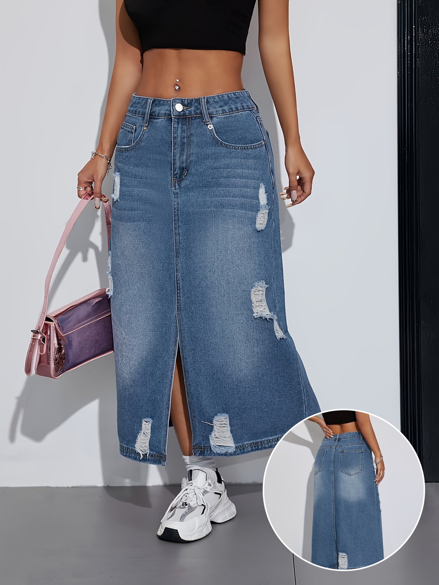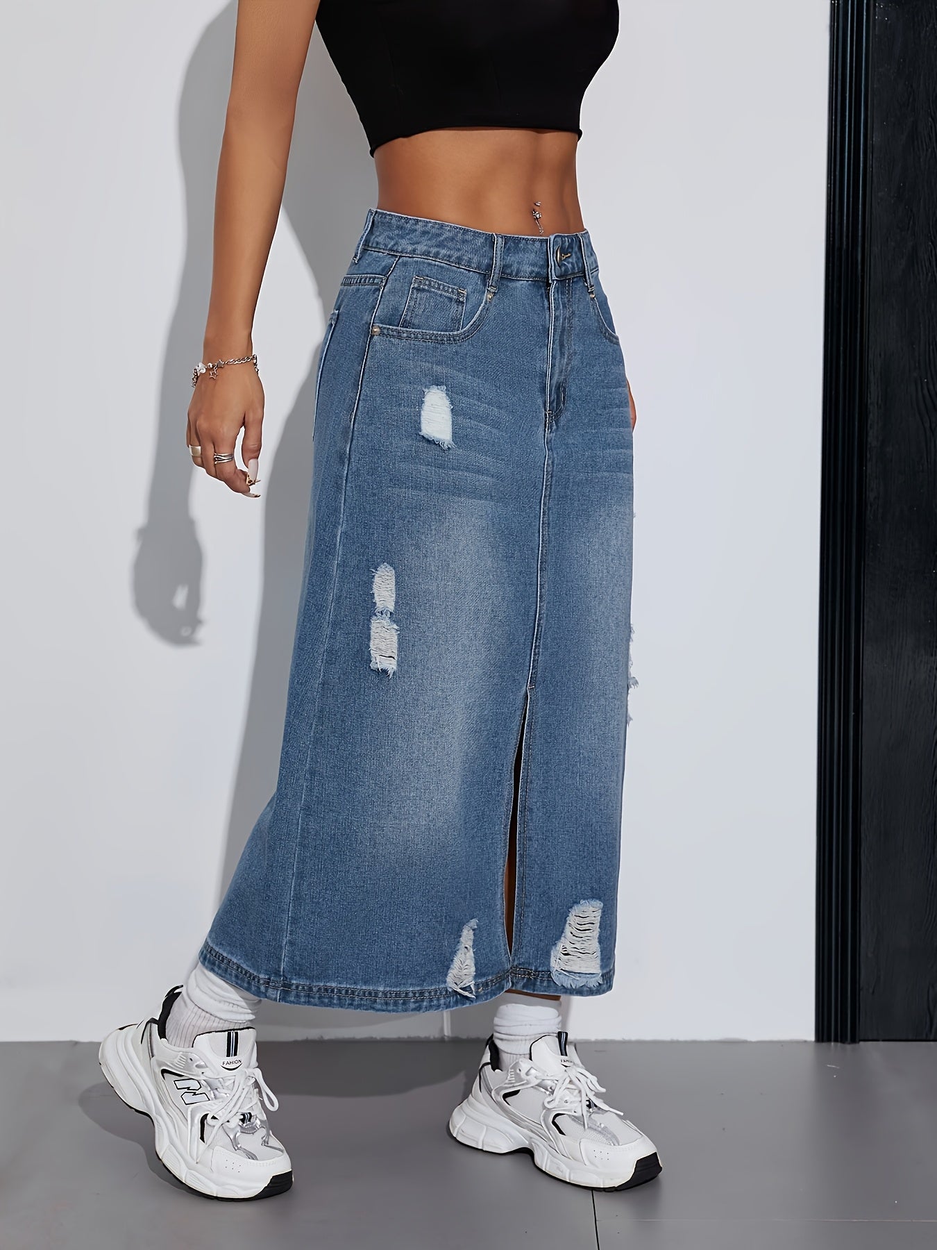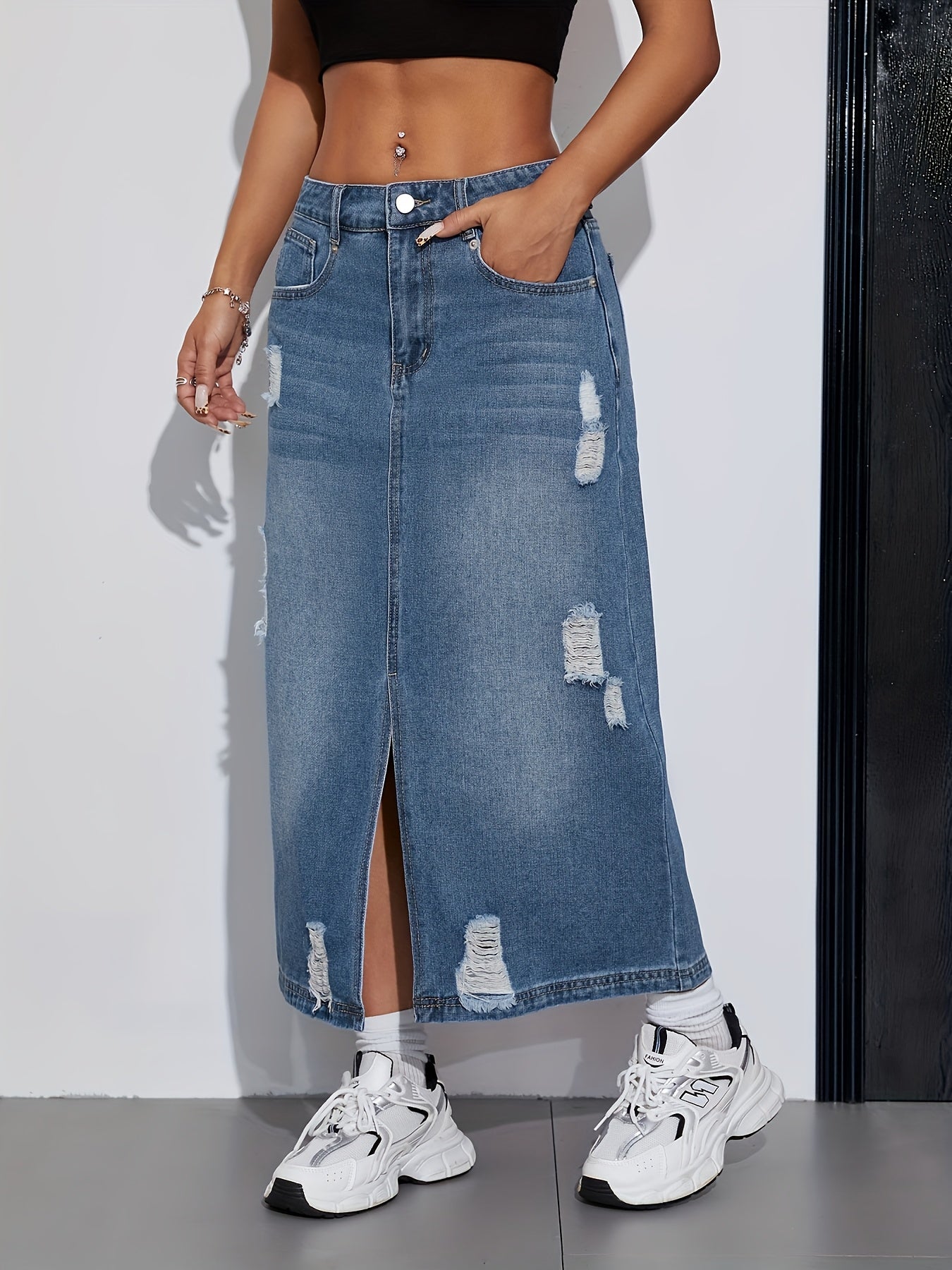 Falda vaquera elegante para mujer - Diseño de corte A con abertura y rotos