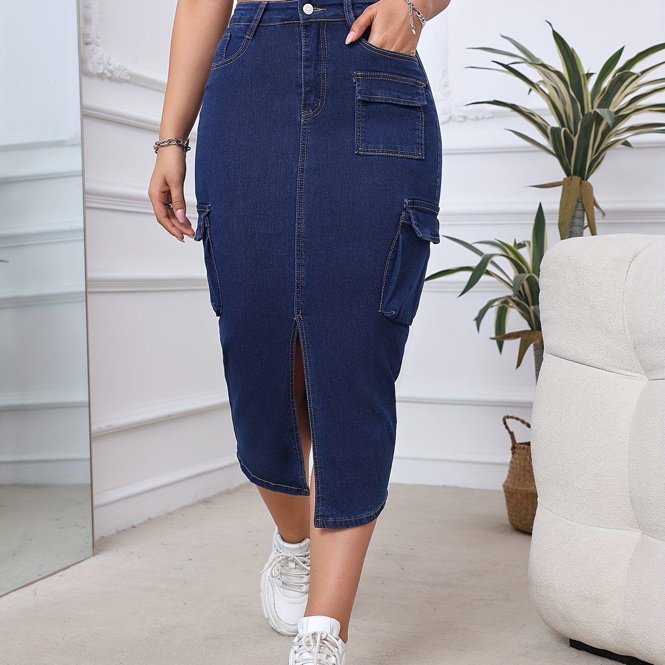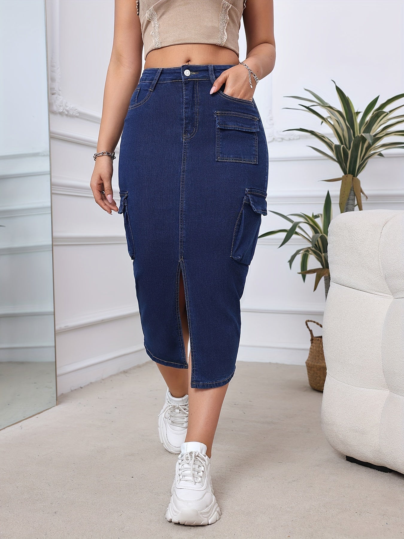 Falda vaquera midi de cintura alta para mujer con bolsillos cargo - Corte ajustado
