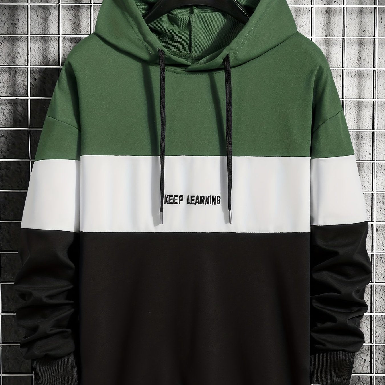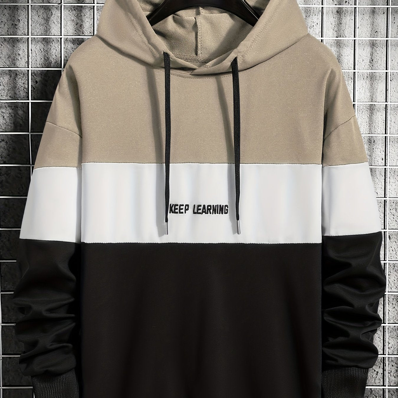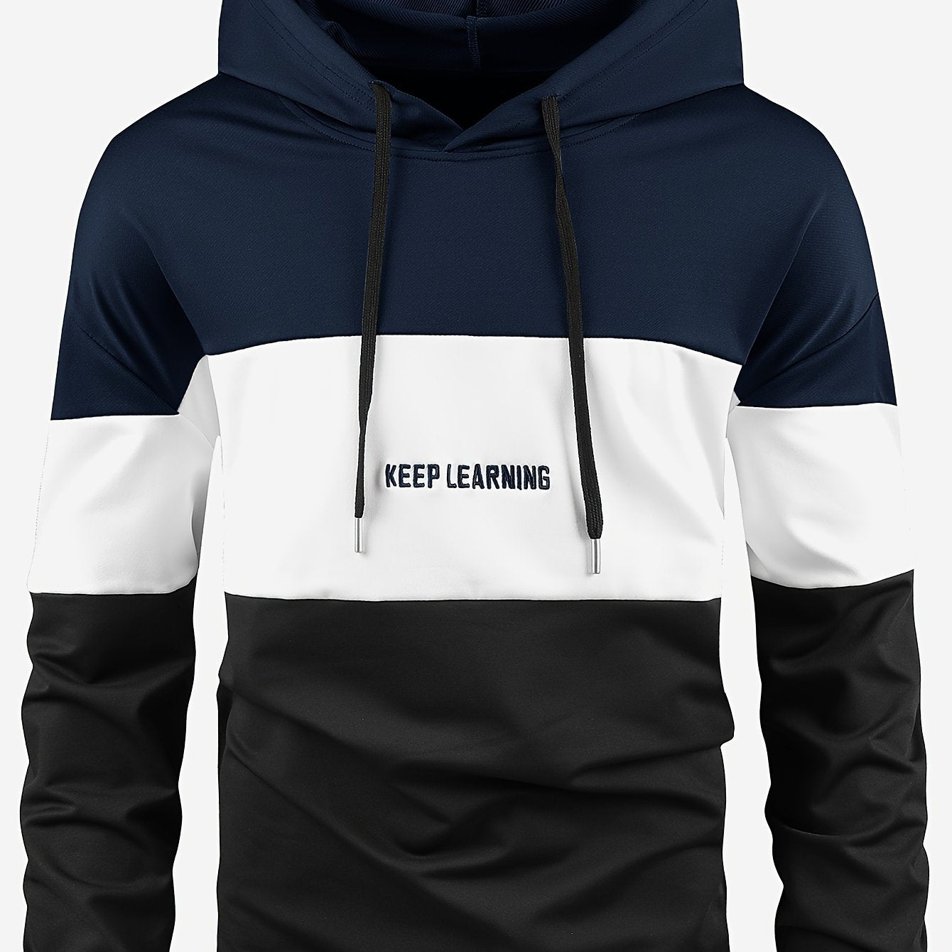 ‘Keep Learning’ Print Patchwork Hoodie, Hoodies For Men, Men’s Casual Pullover Hooded Thin Sweatshirt With Kangaroo Pocket For Spring Fall, As Gifts