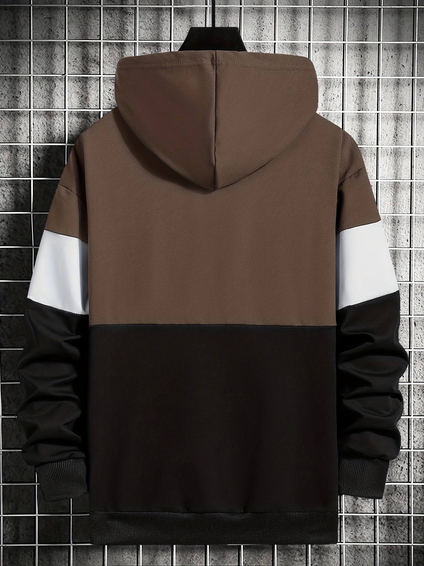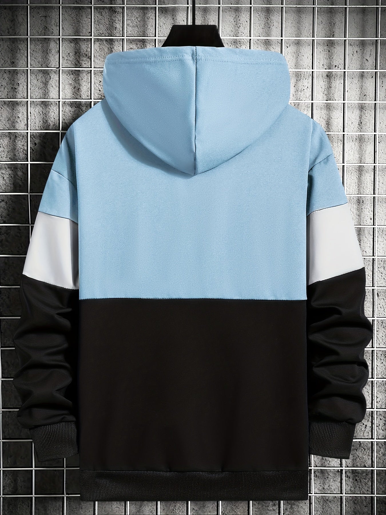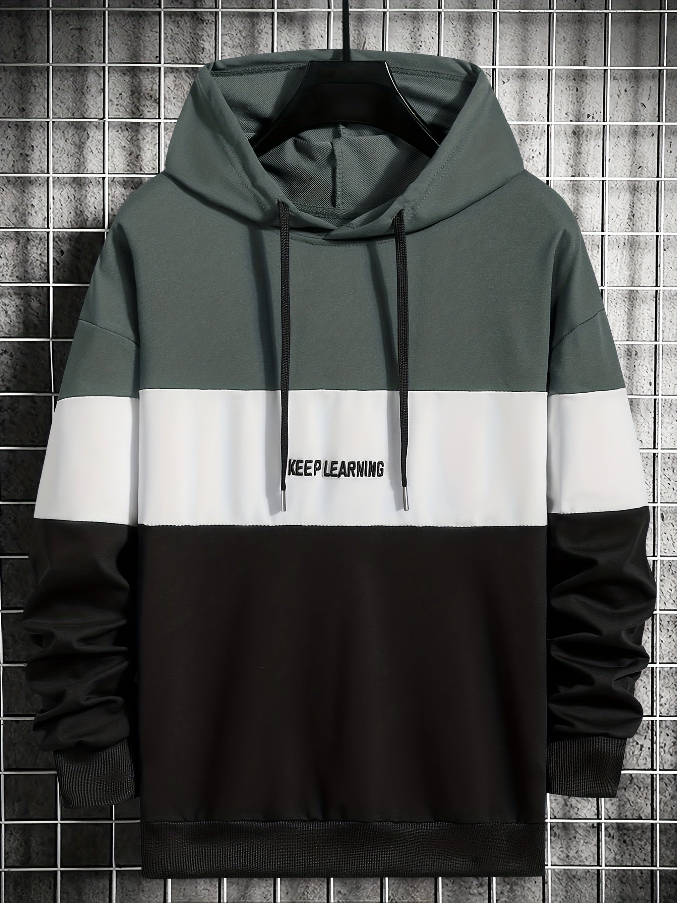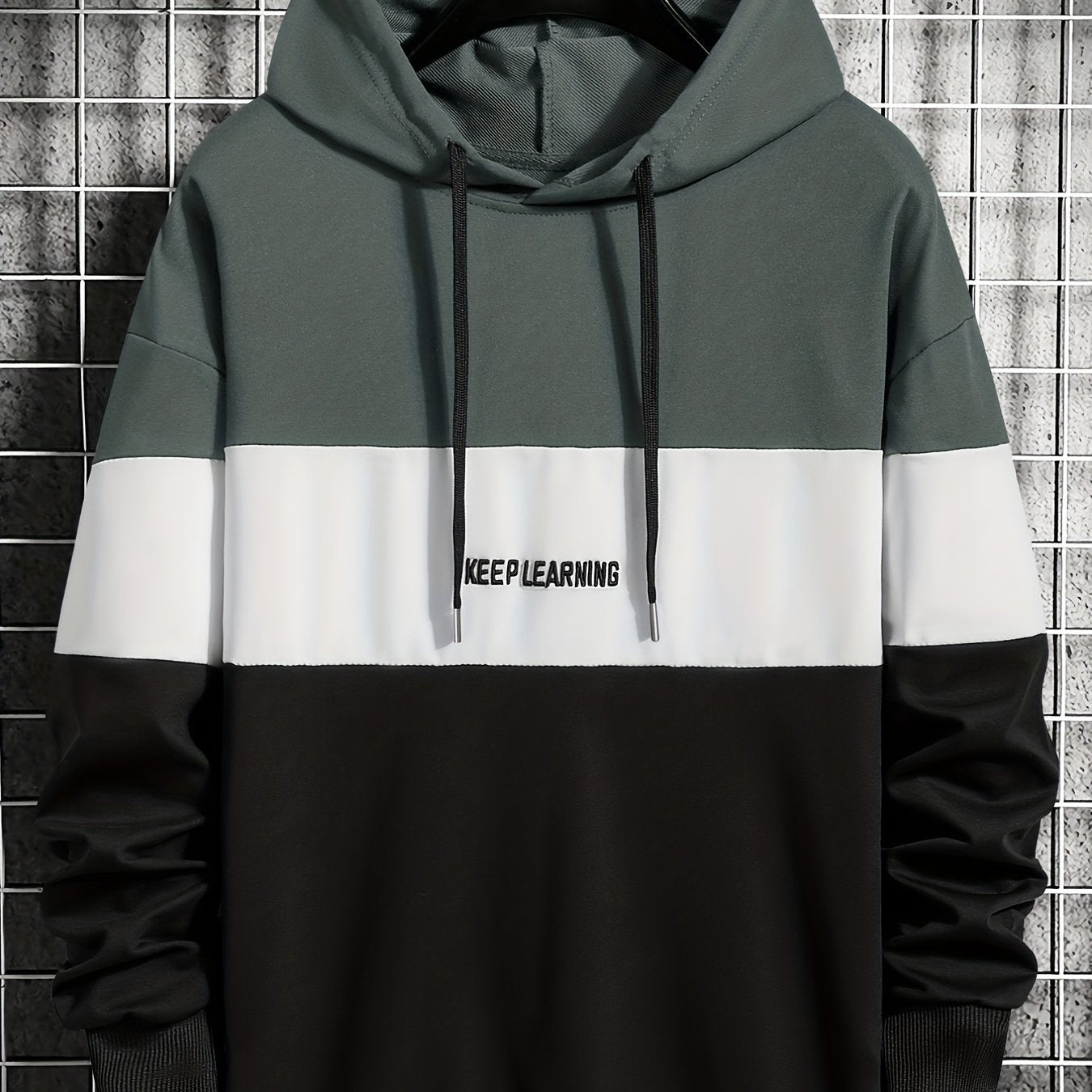 ‘Keep Learning’ Print Patchwork Hoodie, Hoodies For Men, Men’s Casual Pullover Hooded Thin Sweatshirt With Kangaroo Pocket For Spring Fall, As Gifts
