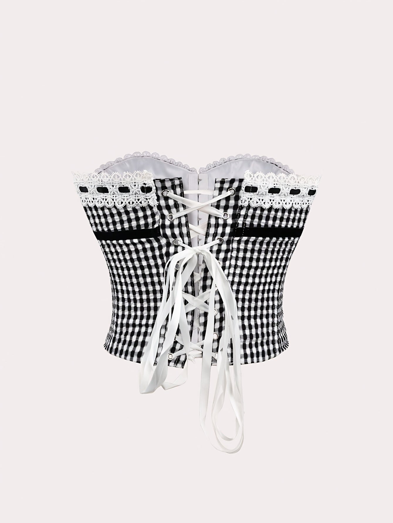 Sumérgete en un mundo de fantasía y elegancia con el Top Corsé Vintage Y2K para Mujer, con un encantador estampado de cuadros vichy y un delicado ribete de encaje. Este elegante corsé es perfecto para mujeres a la moda que buscan añadir un toque retro a su vestuario.