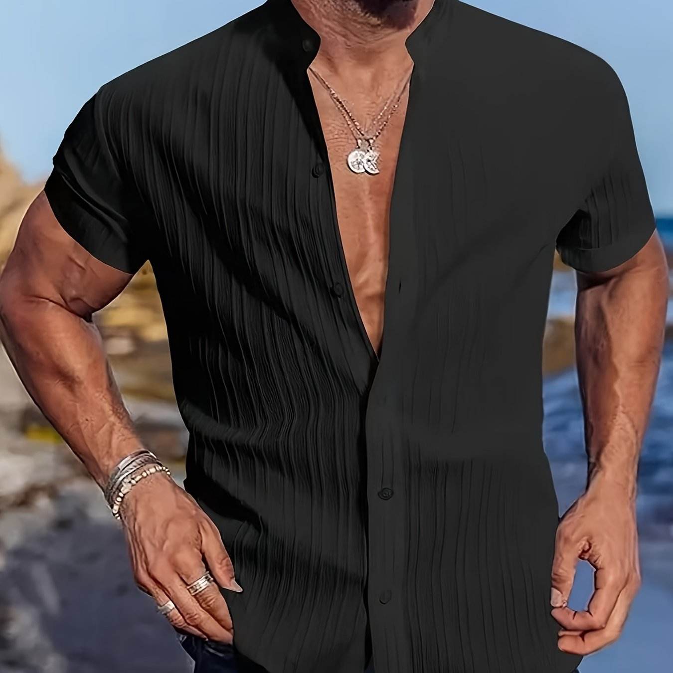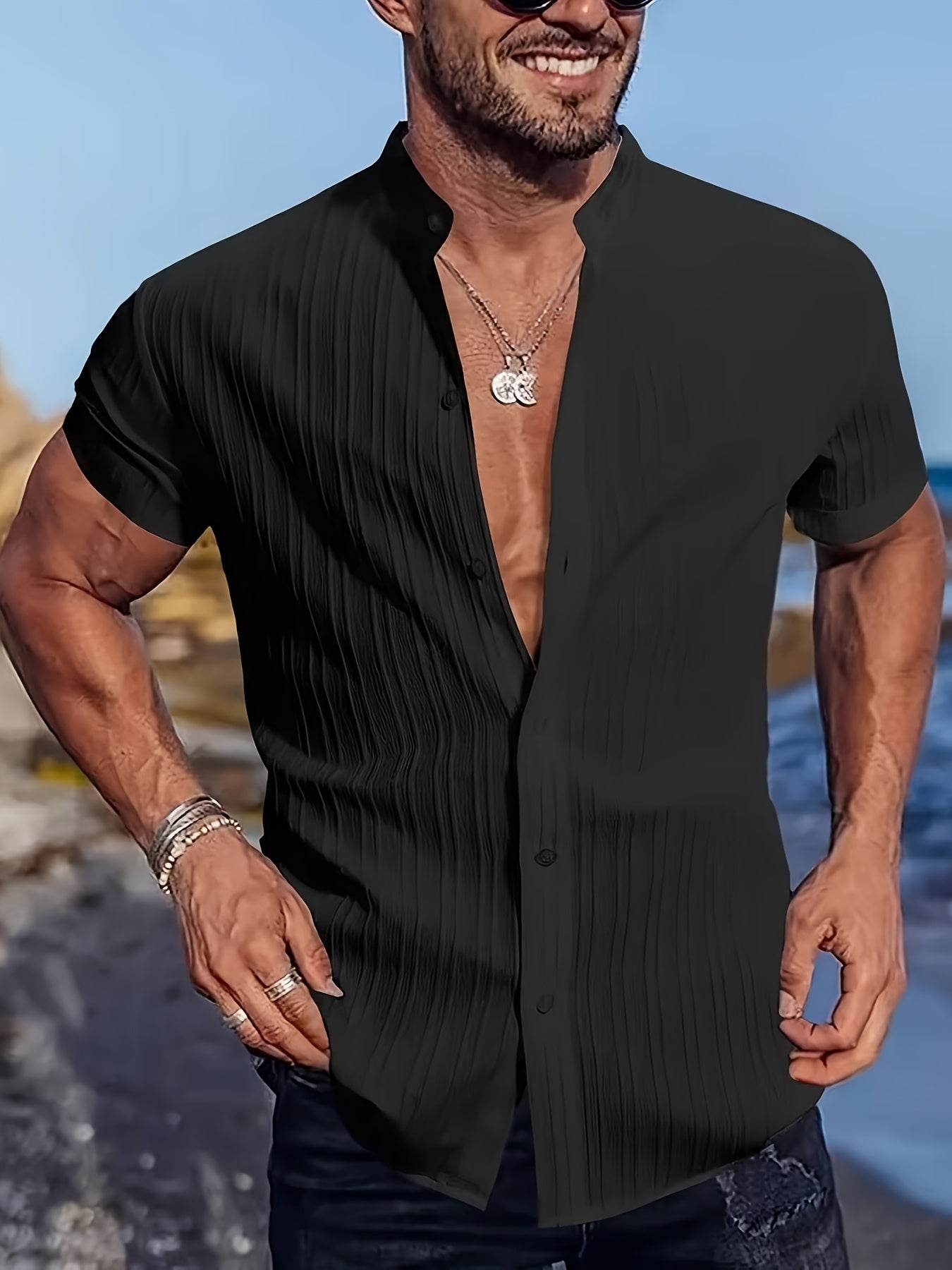 Camisa informal de manga corta a rayas para hombre - Cuello mandarín - Top de verano