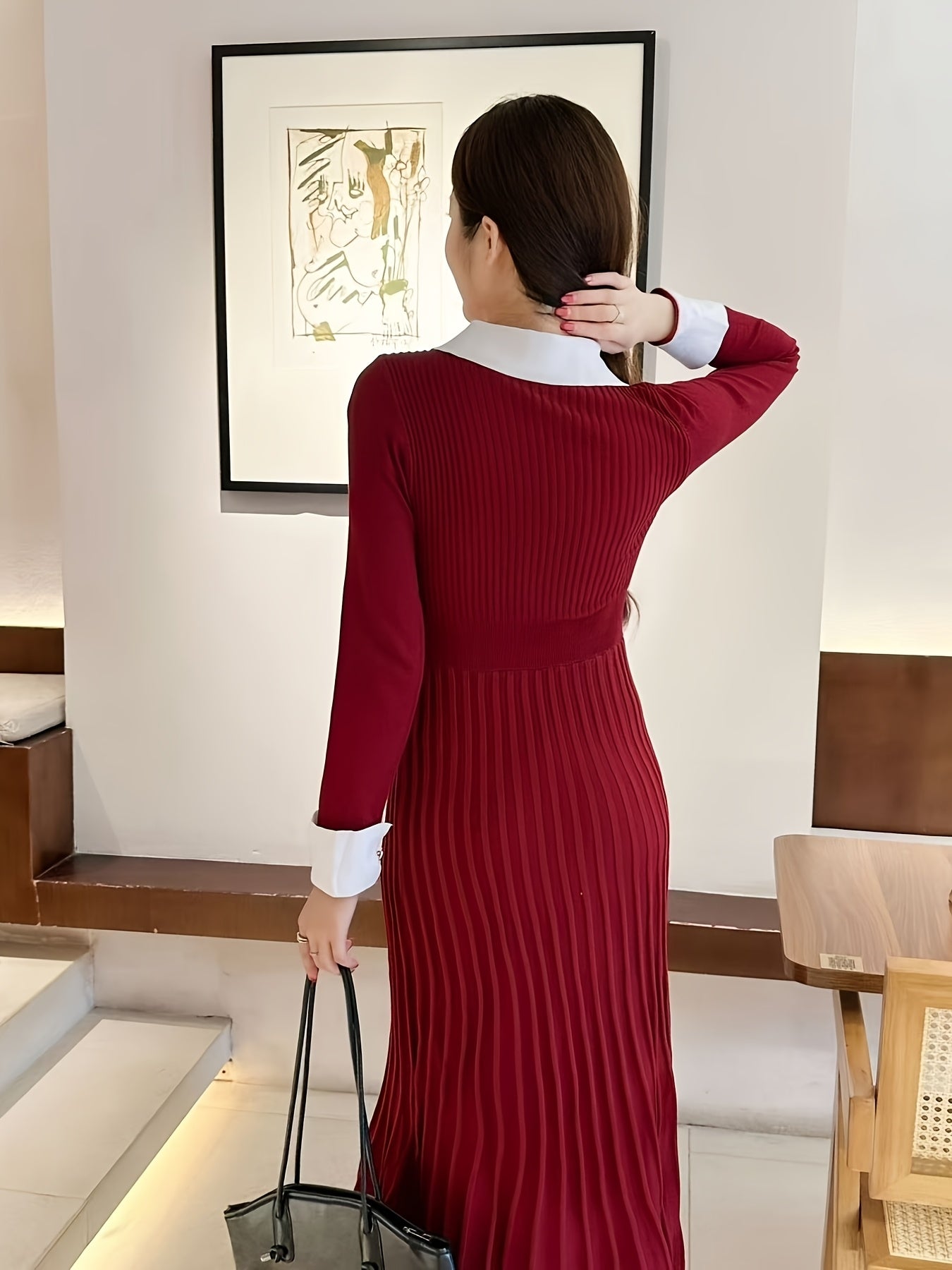 Elegante vestido francés retro con bloques de color - Manga larga estilo otoño