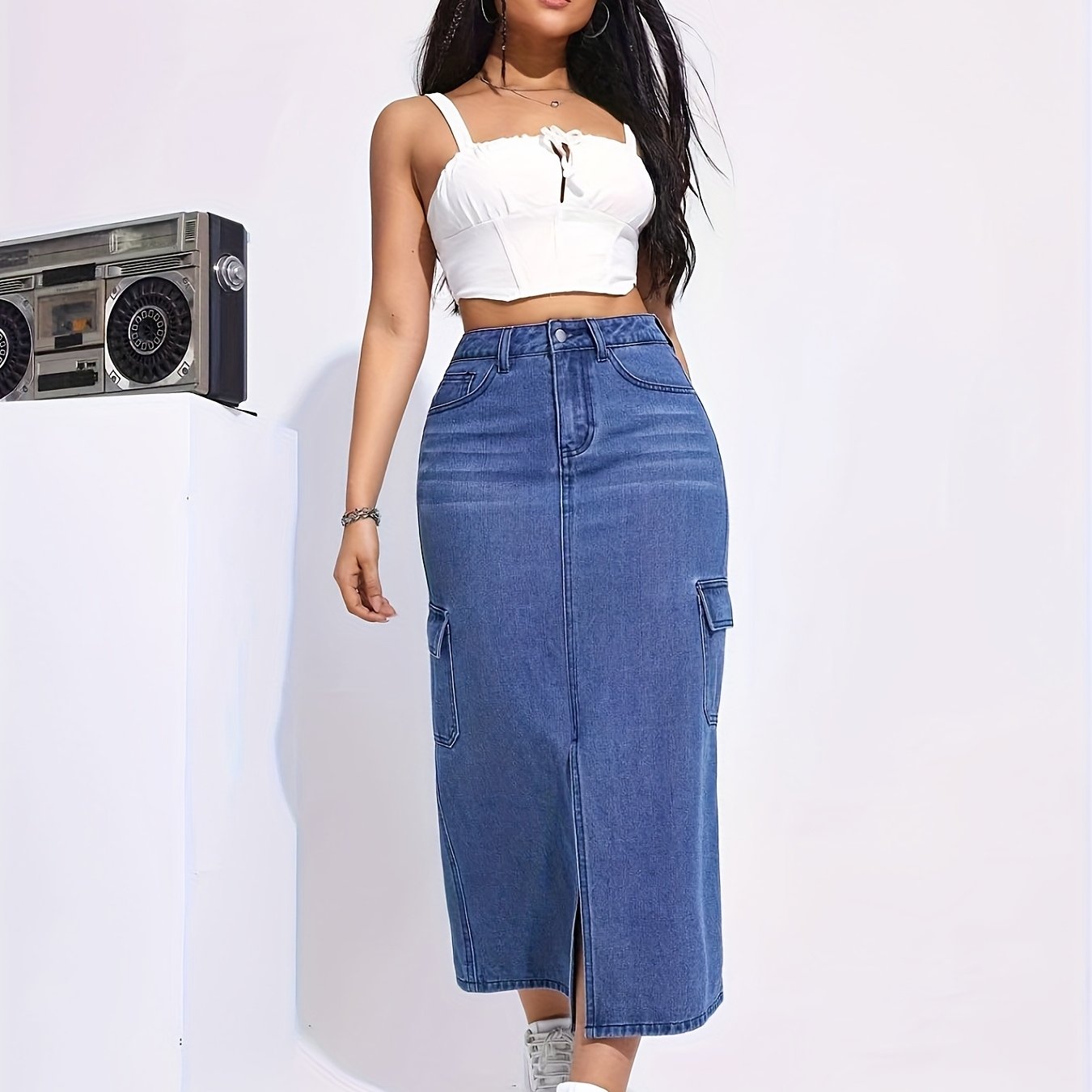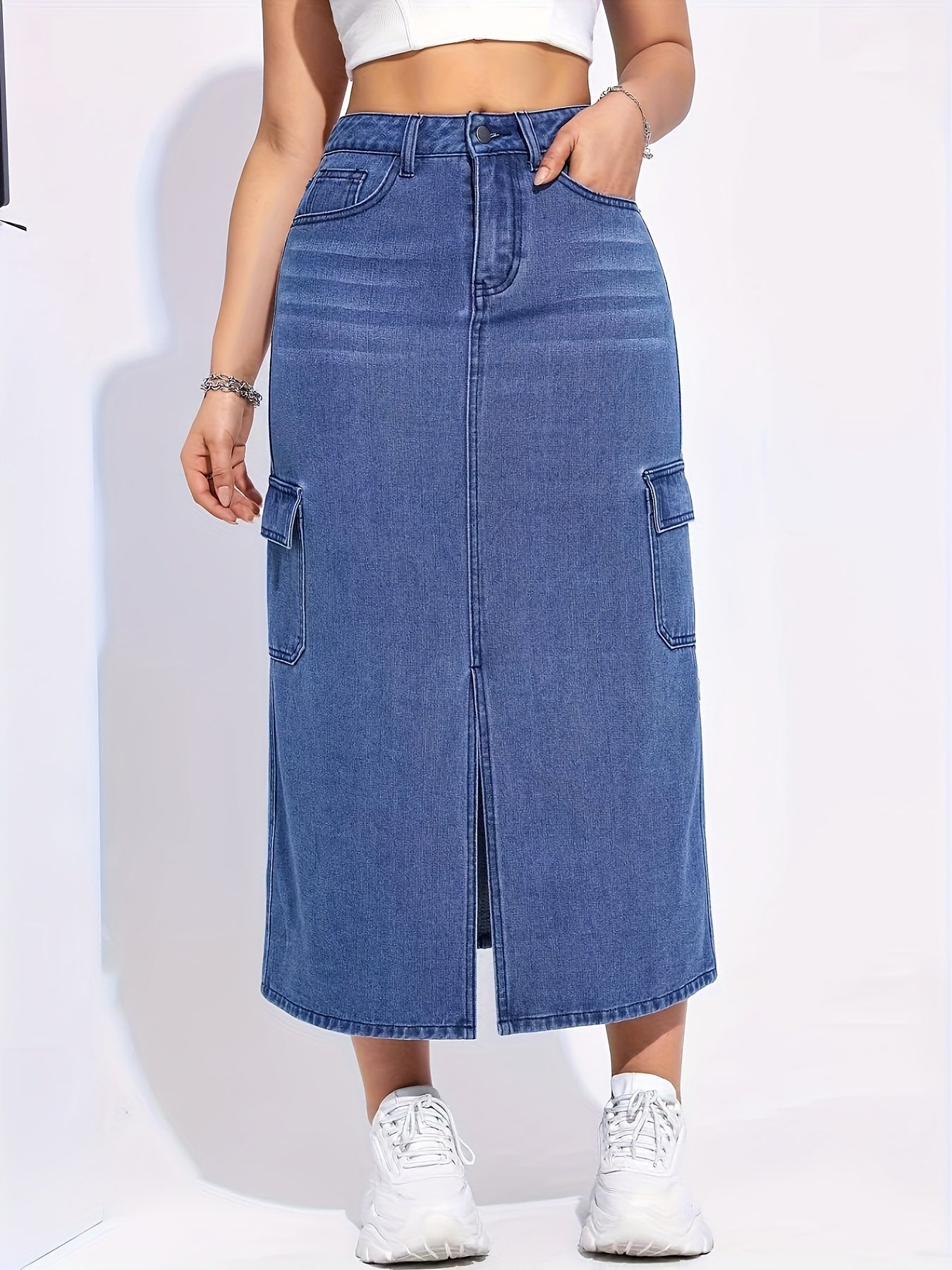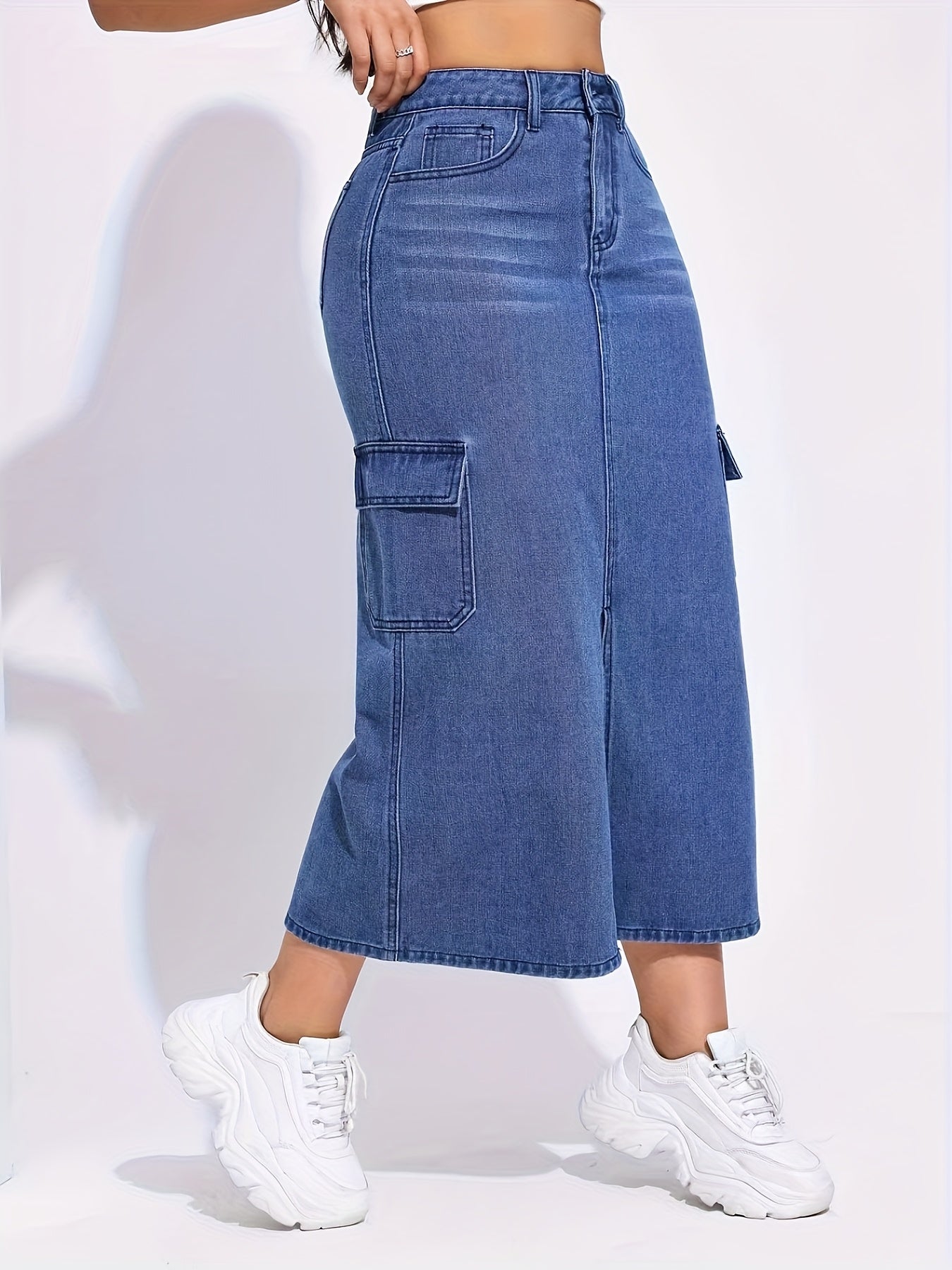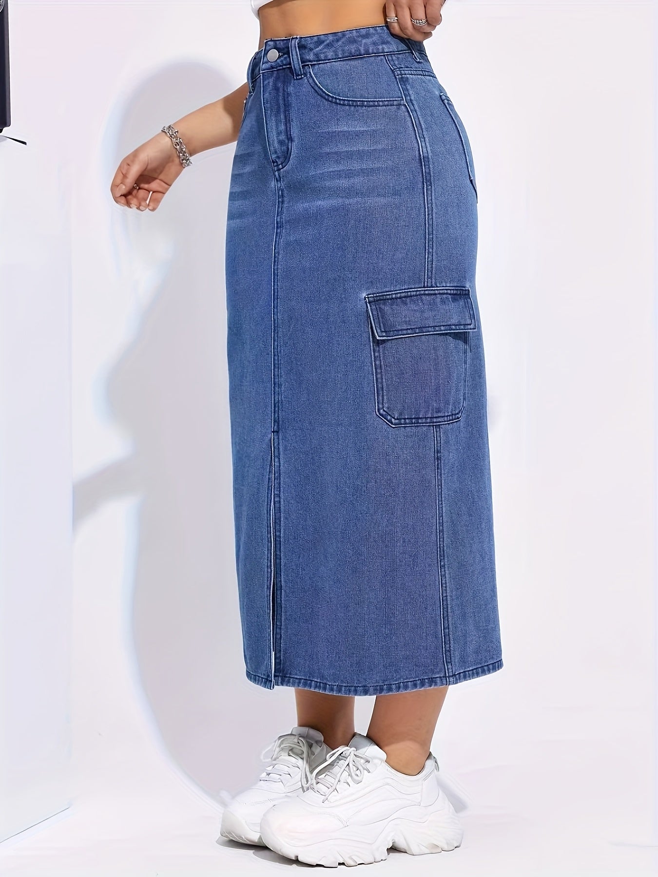 Falda vaquera elástica de cintura alta para mujer - Abertura informal con bolsillos