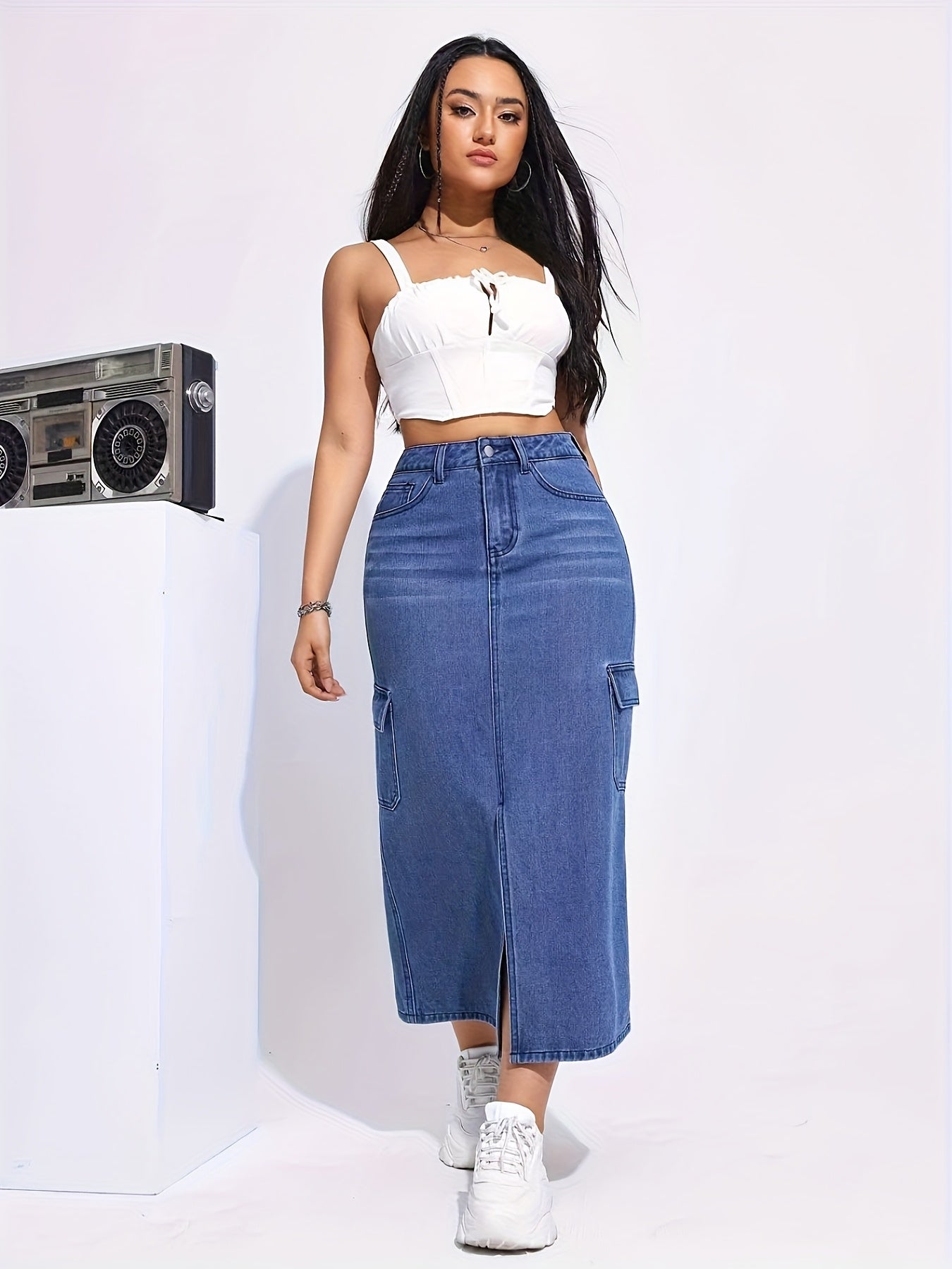 Presentamos la falda vaquera elástica de cintura alta para mujer, una combinación perfecta de estilo y comodidad. Confeccionada en 75 % algodón con elasticidad media, esta falda larga presenta un moderno diseño de abertura y prácticos bolsillos, lo que la convierte en la opción ideal para salidas informales de primavera, verano y otoño.