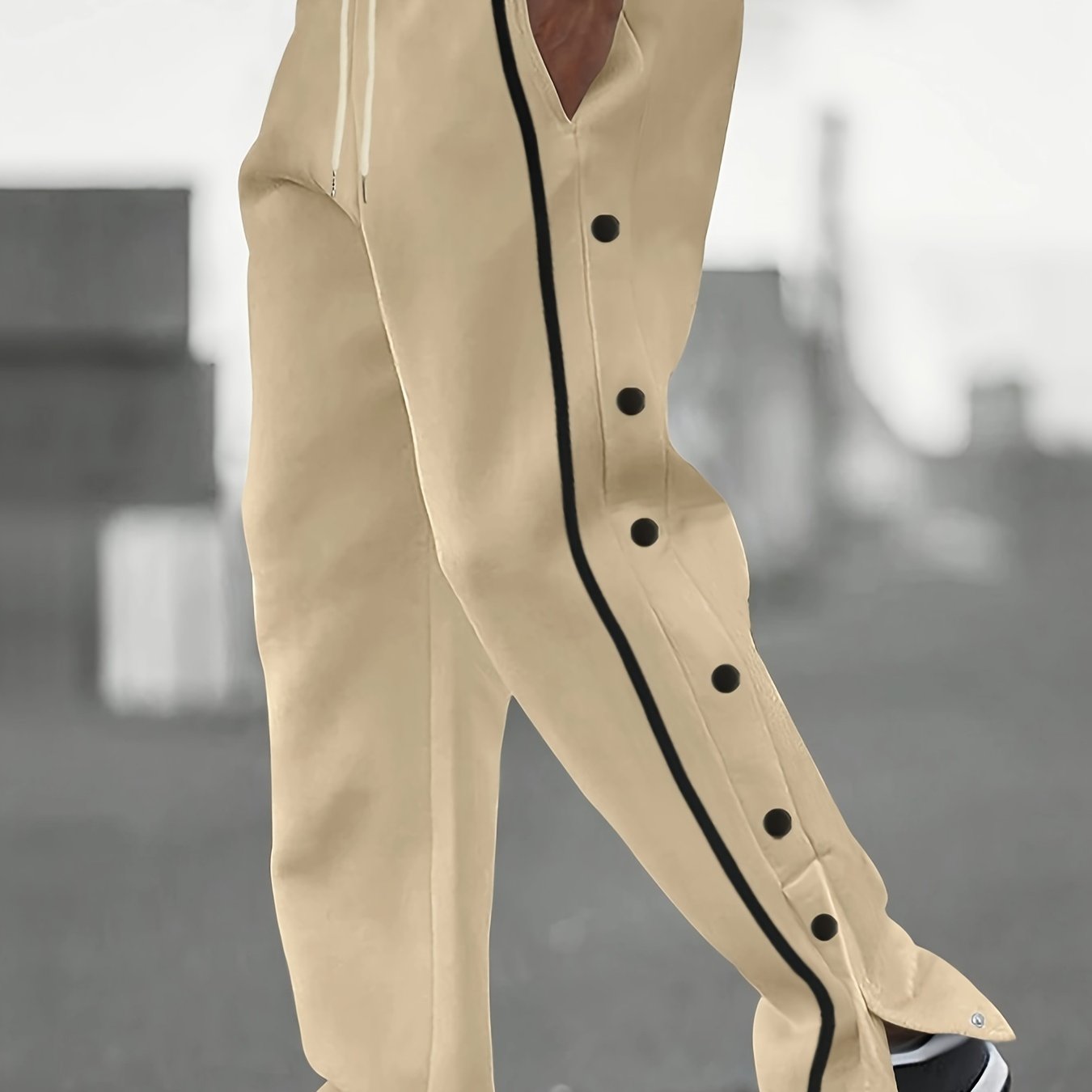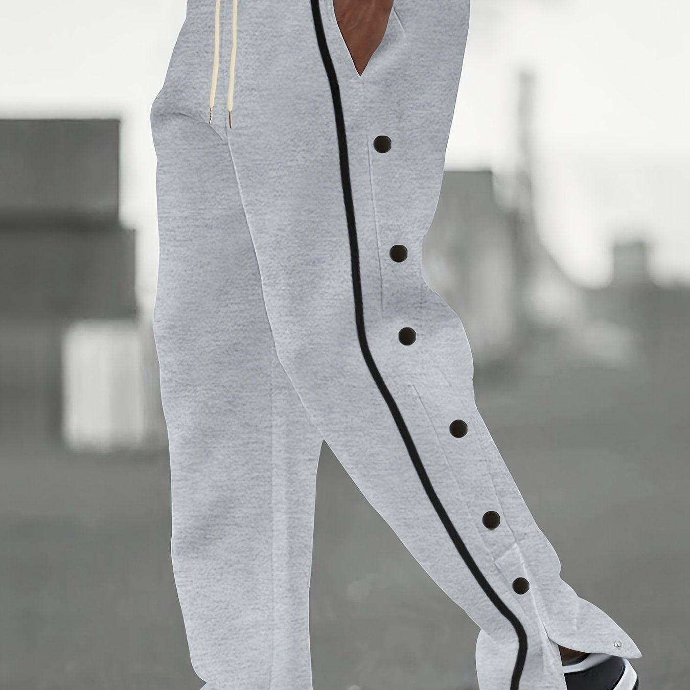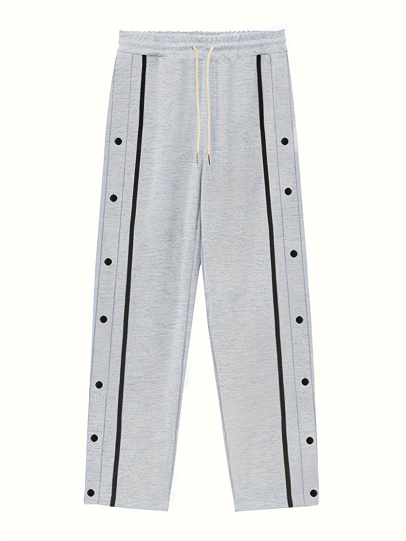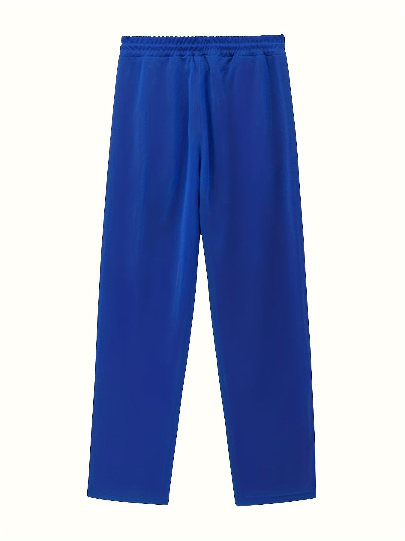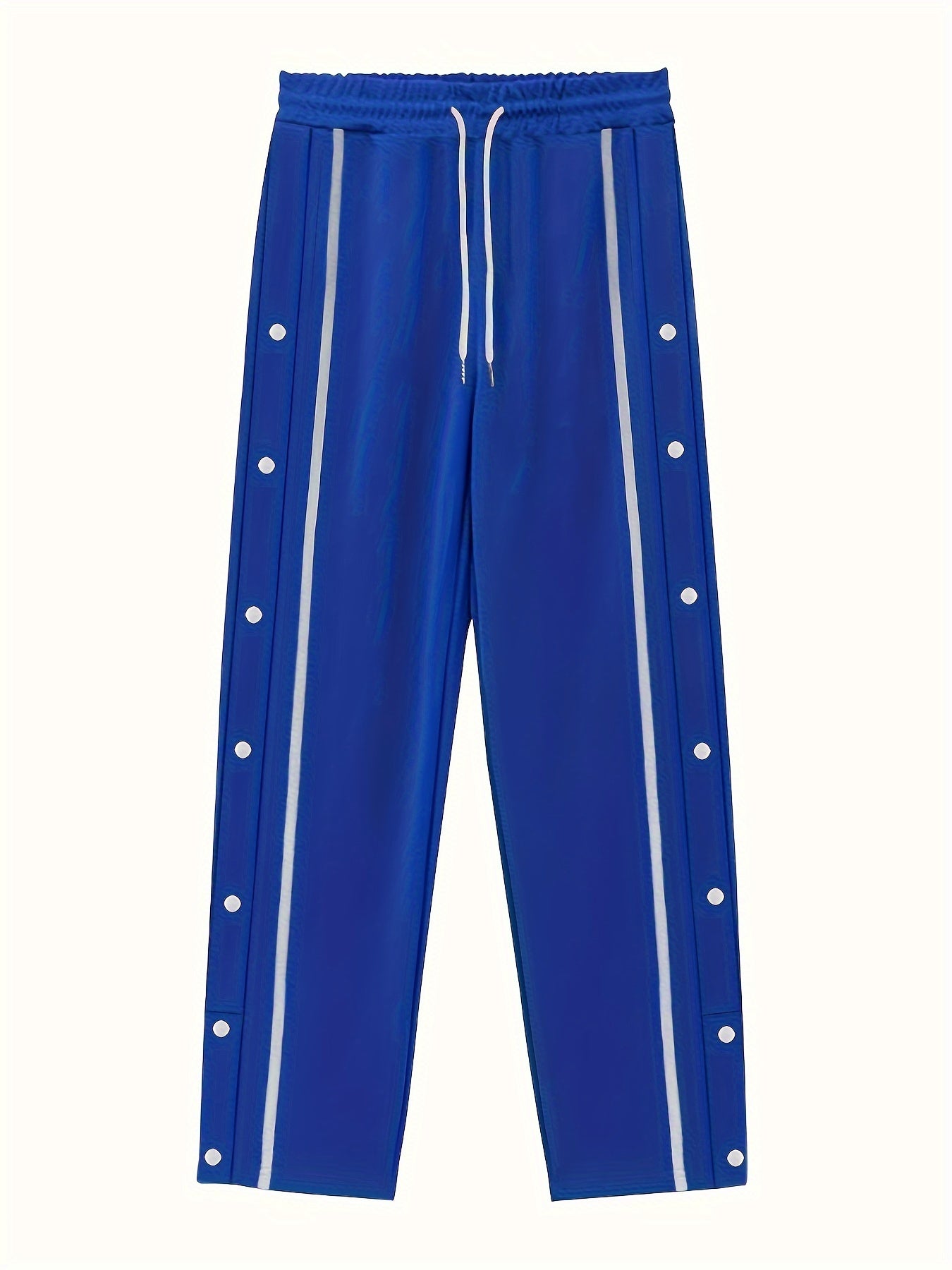 Pantalones deportivos casuales azules para hombre con cintura blanca con cordón ajustable, botones y bolsillos laterales. Pantalones cómodos para todas las estaciones, ideales para uso casual.