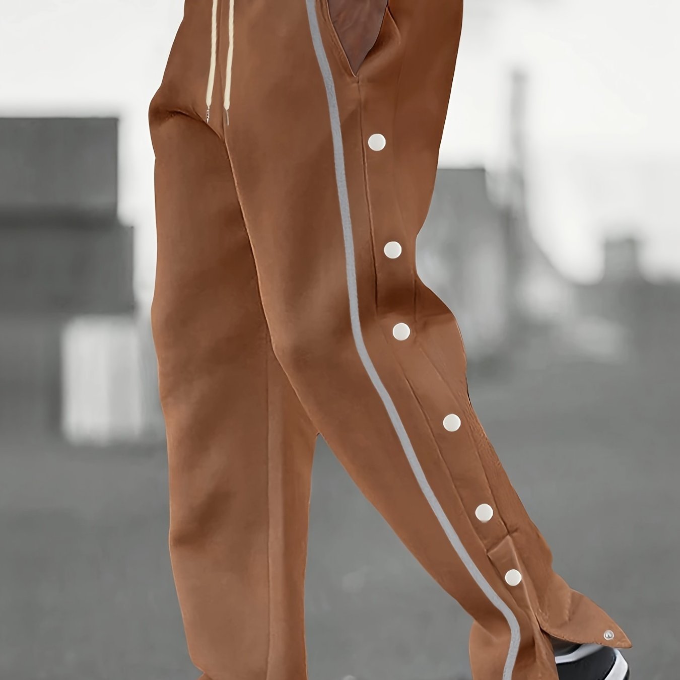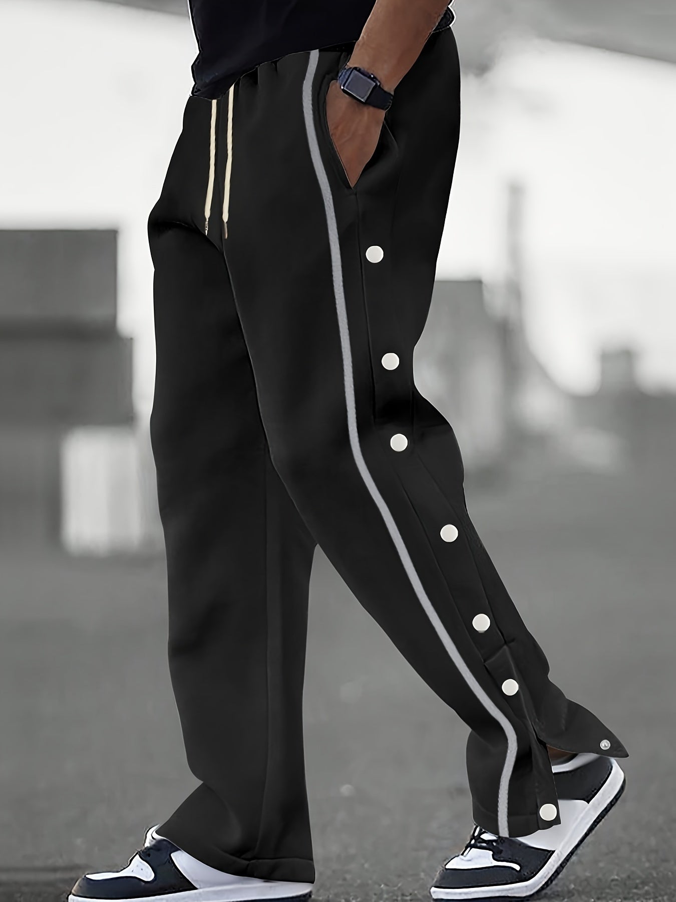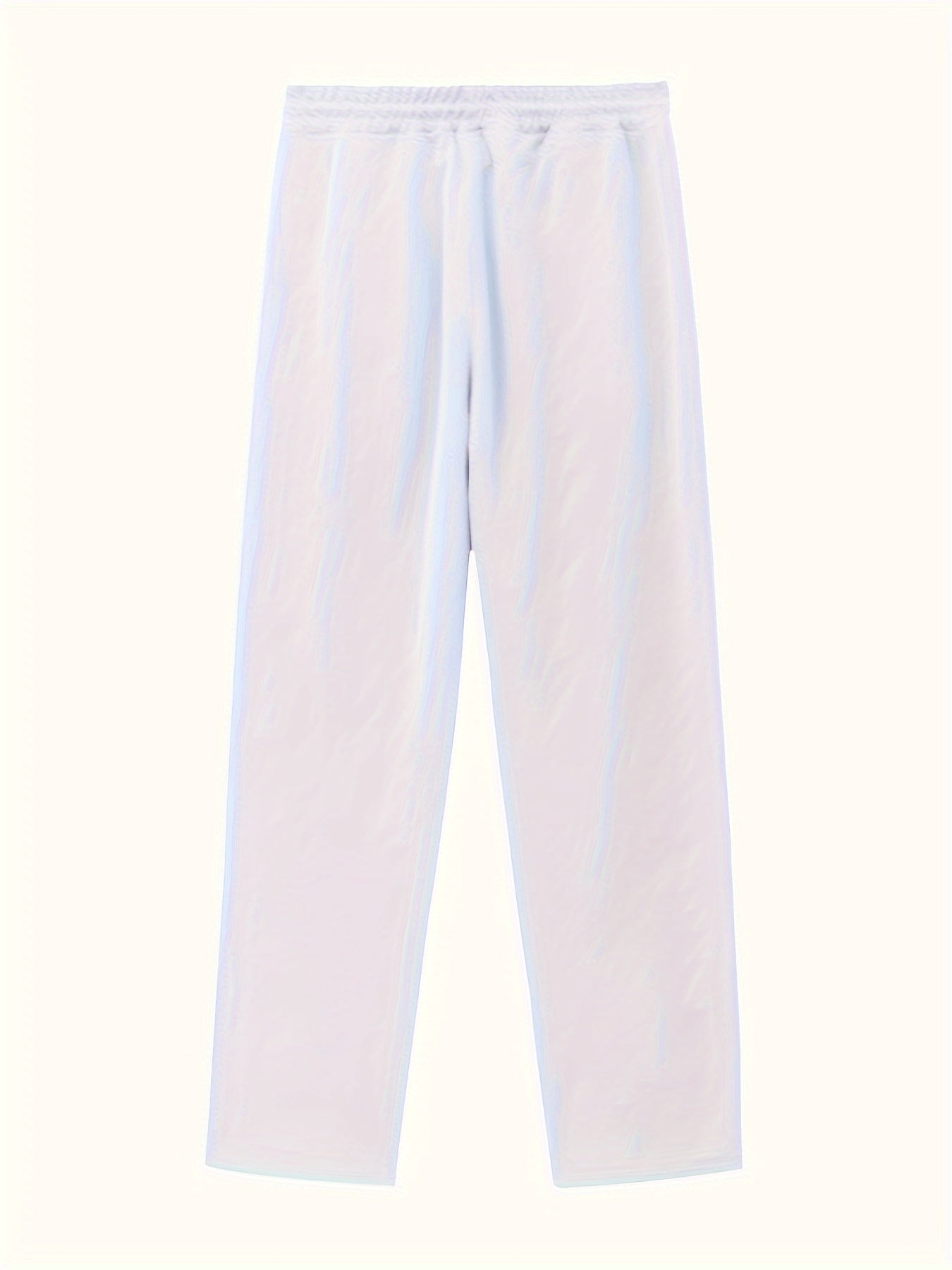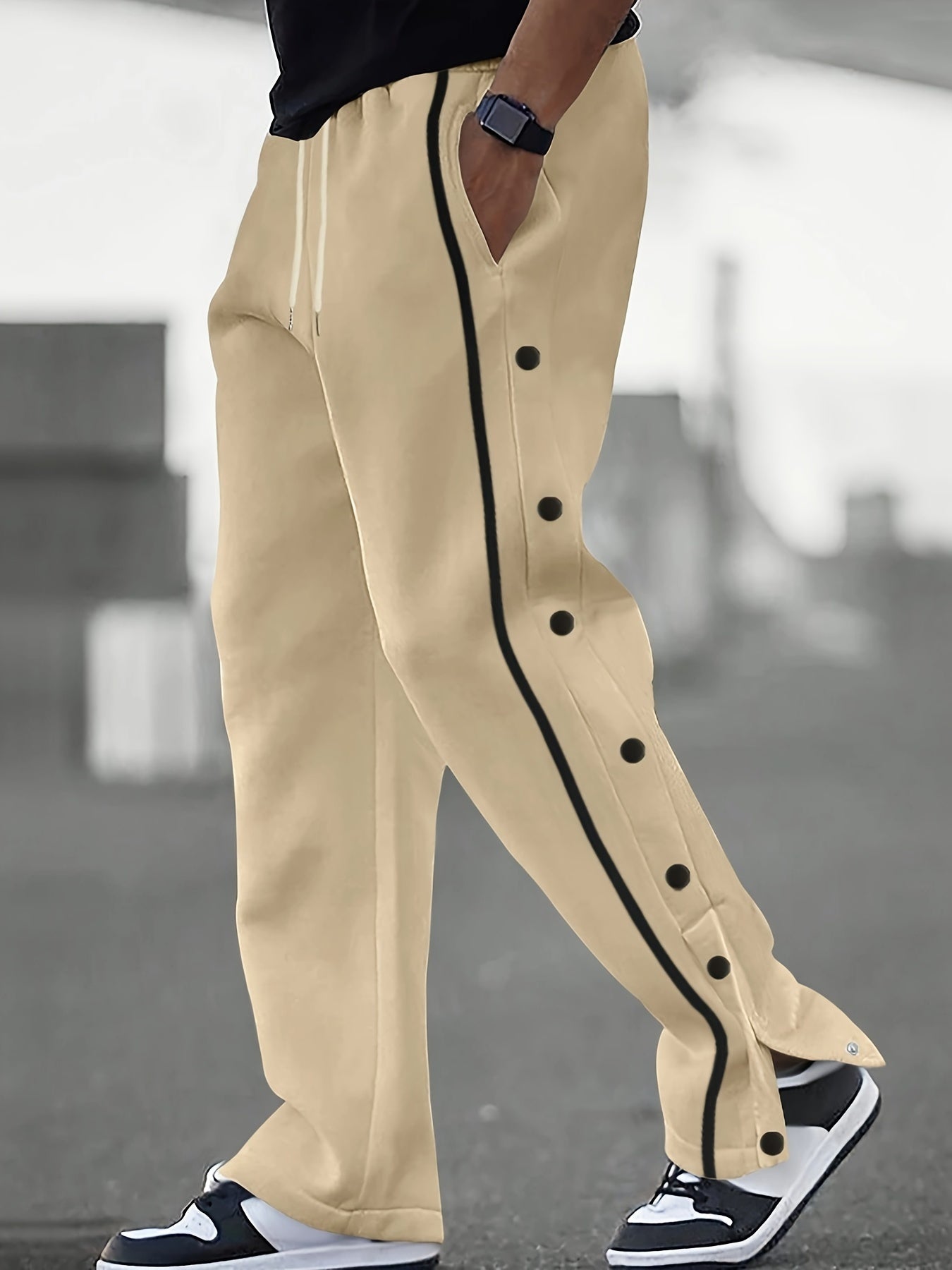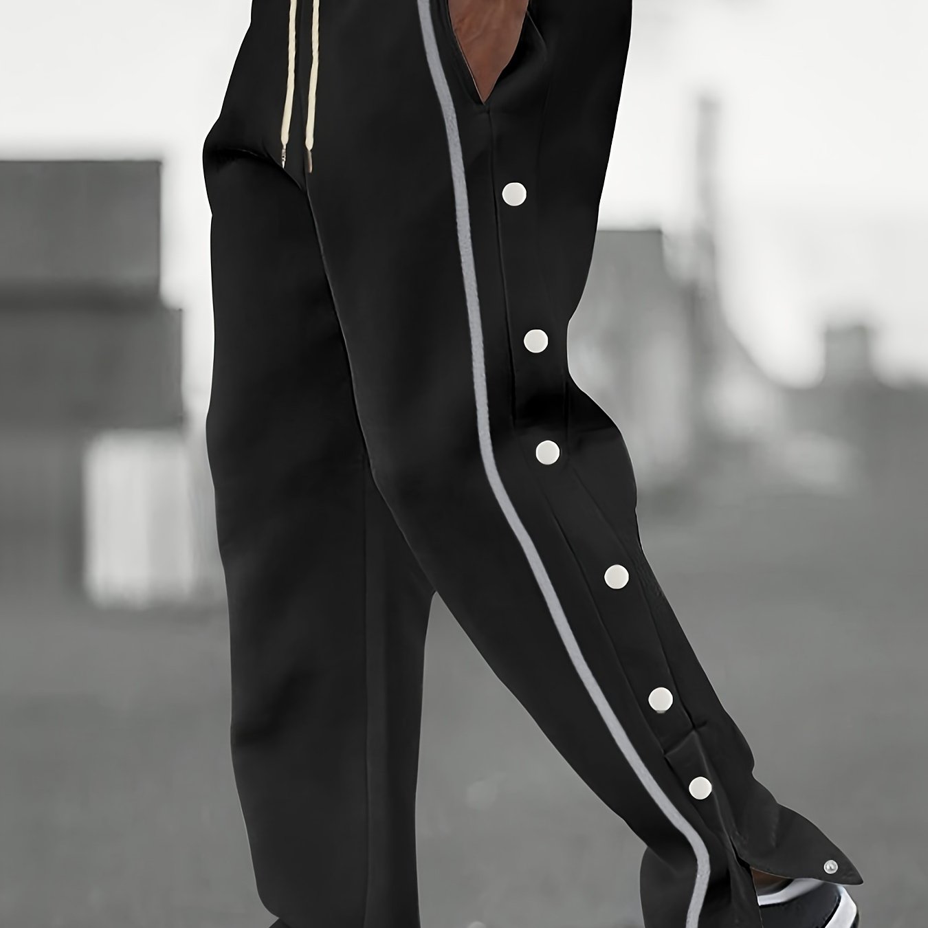 Pantalones deportivos casuales azules para hombre con cintura blanca con cordón ajustable, botones y bolsillos laterales. Pantalones cómodos para todas las estaciones, ideales para uso casual.