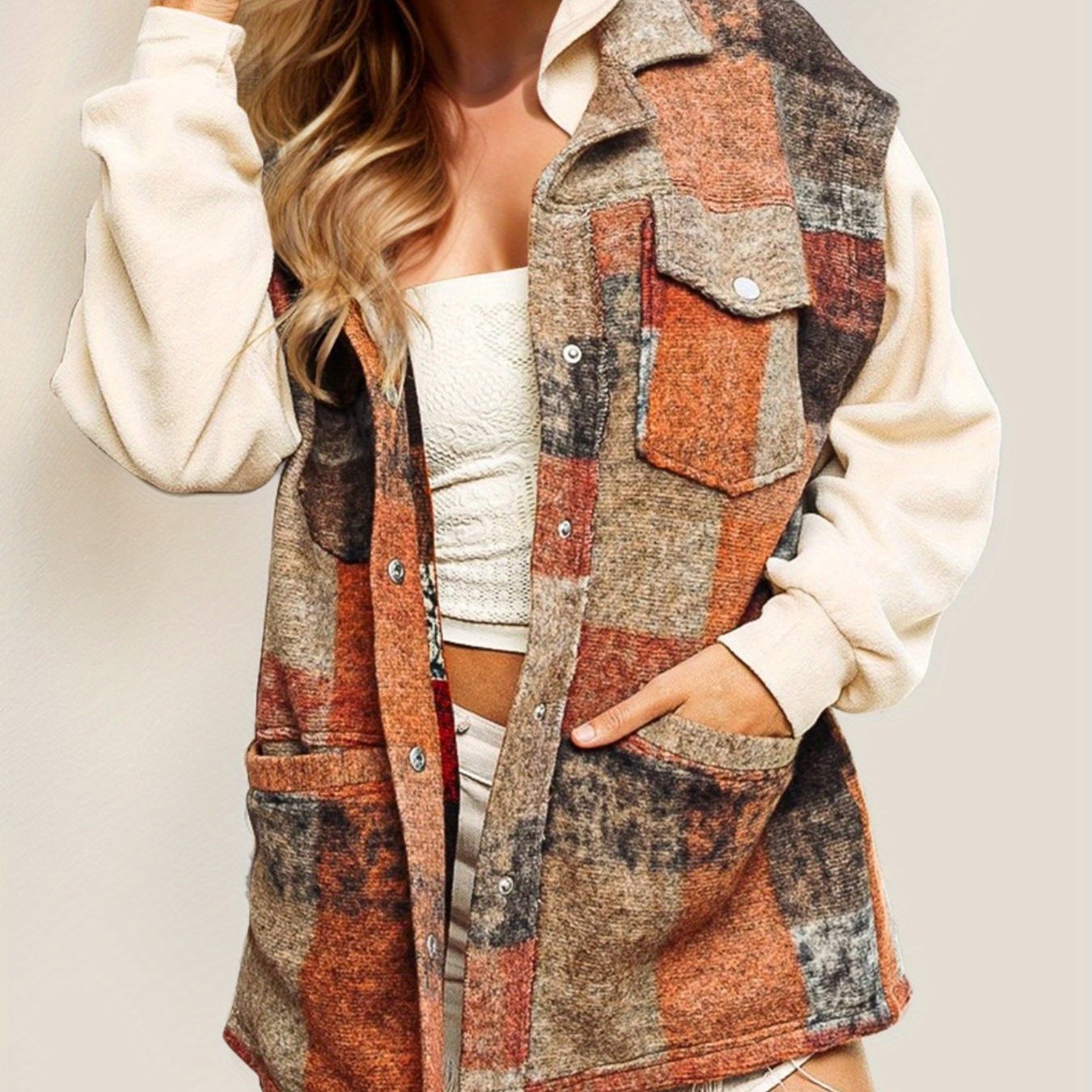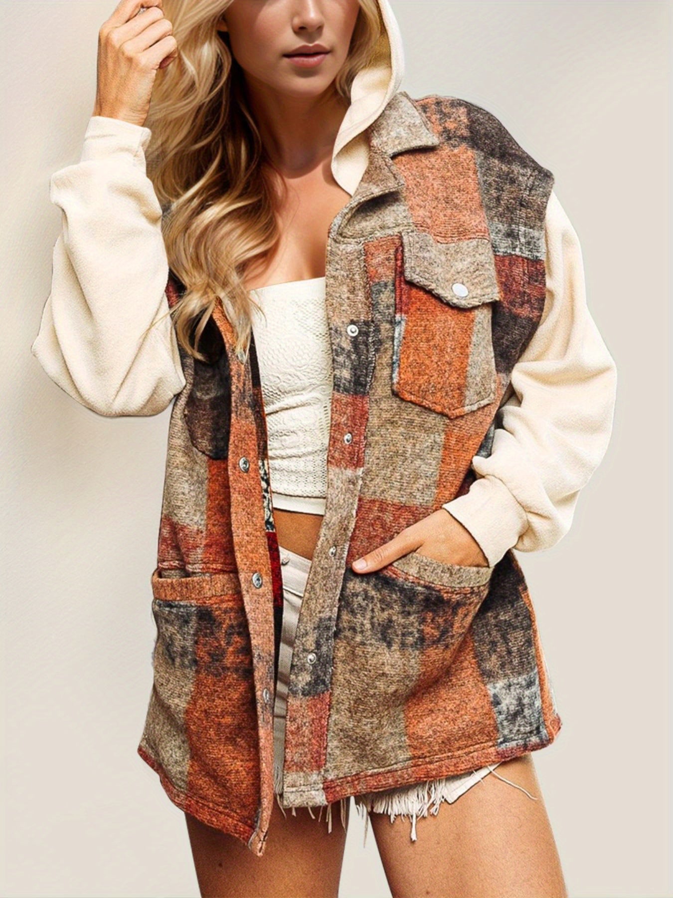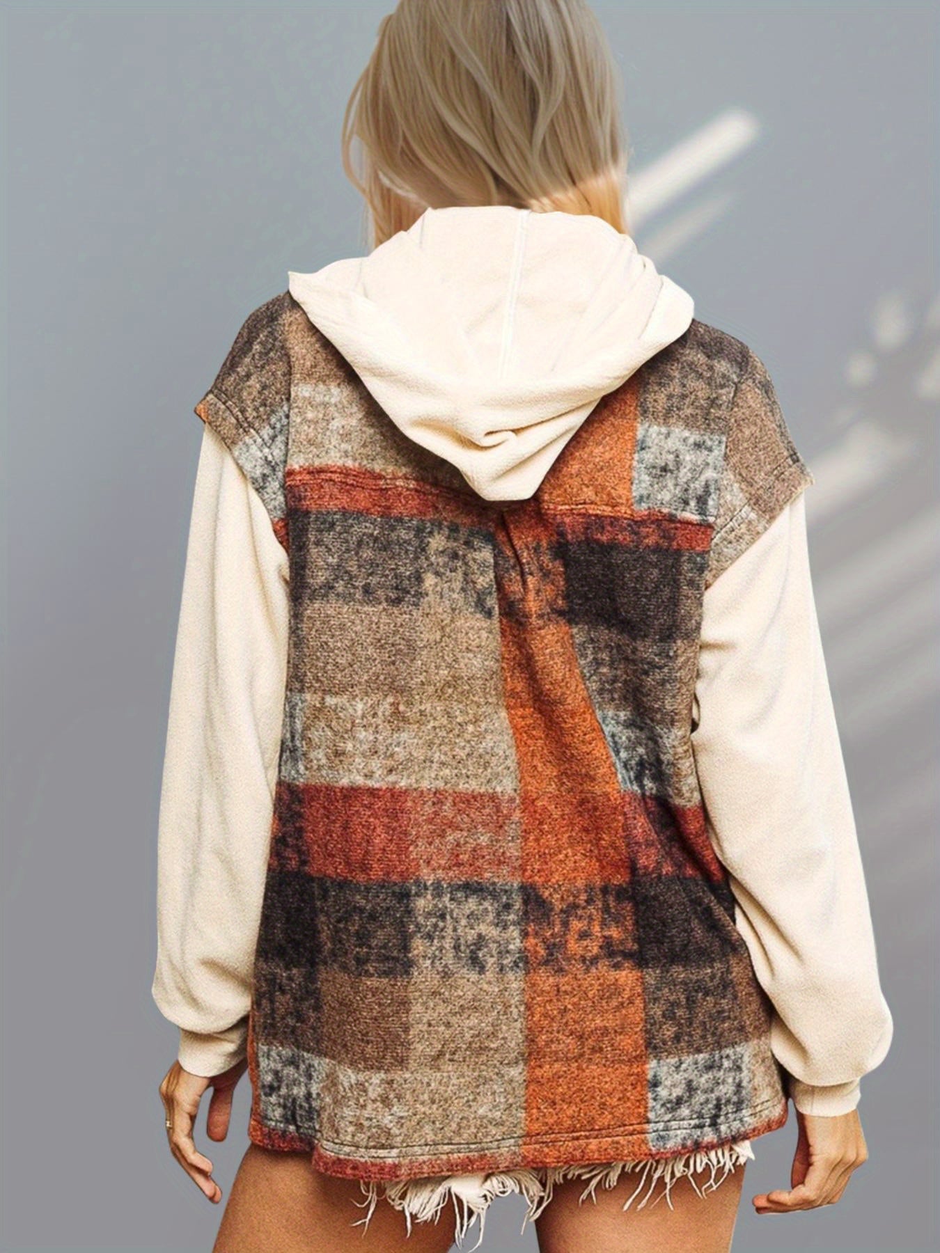 Chaqueta informal con capucha a cuadros - Prenda exterior extragrande con bloques de color para mujer