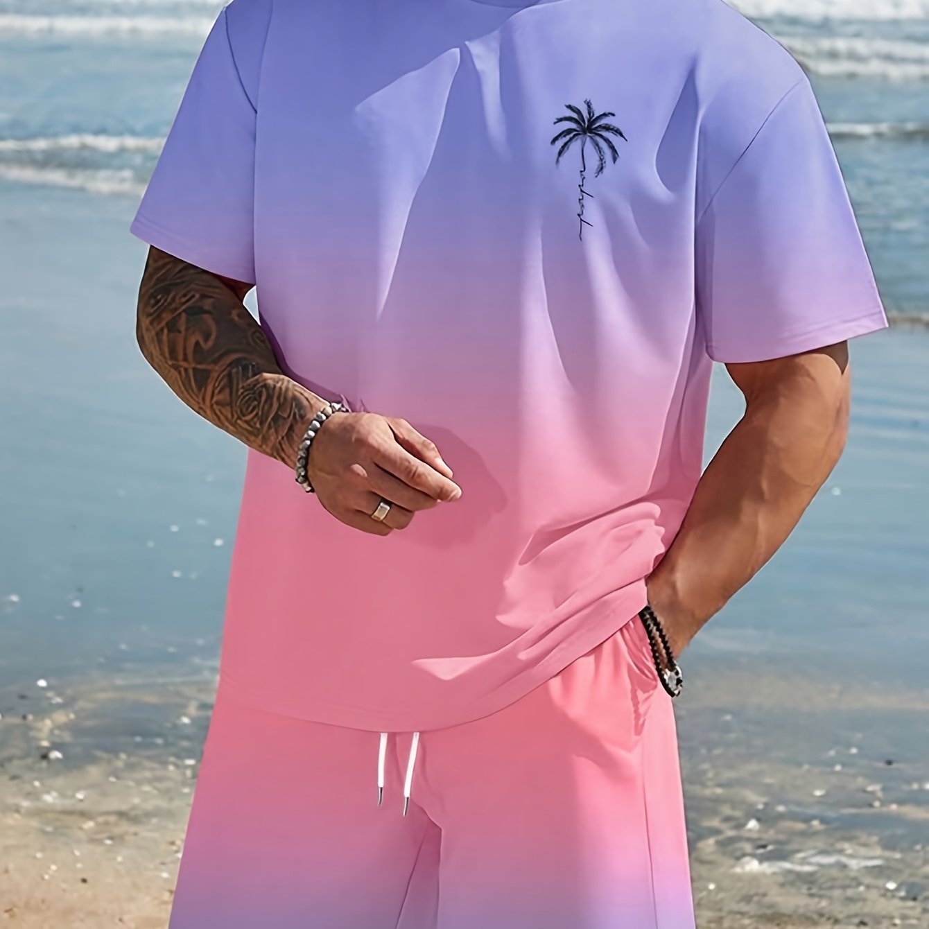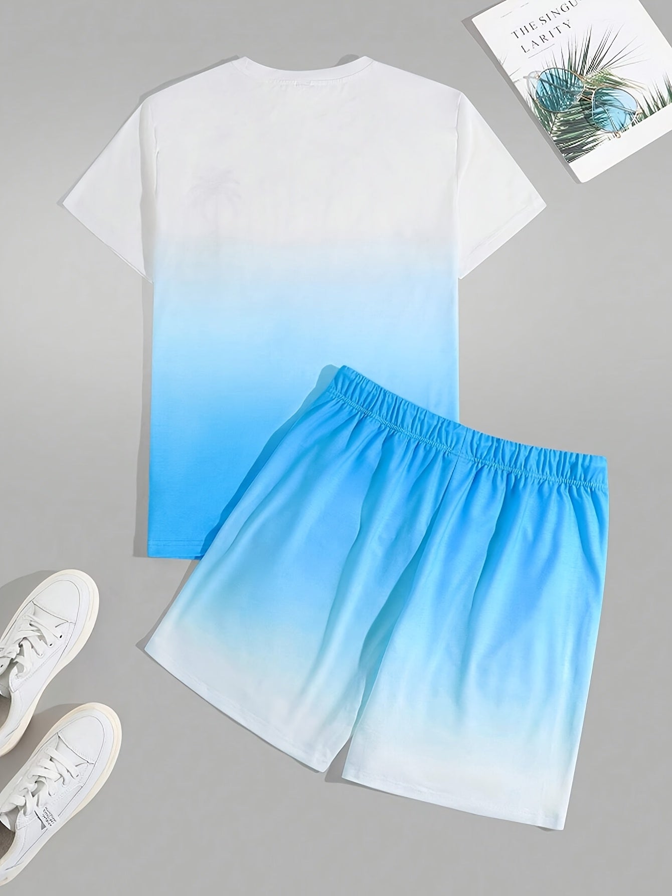 Conjunto informal de 2 piezas para hombre: camiseta de cuello redondo y pantalones cortos, estampado integral.