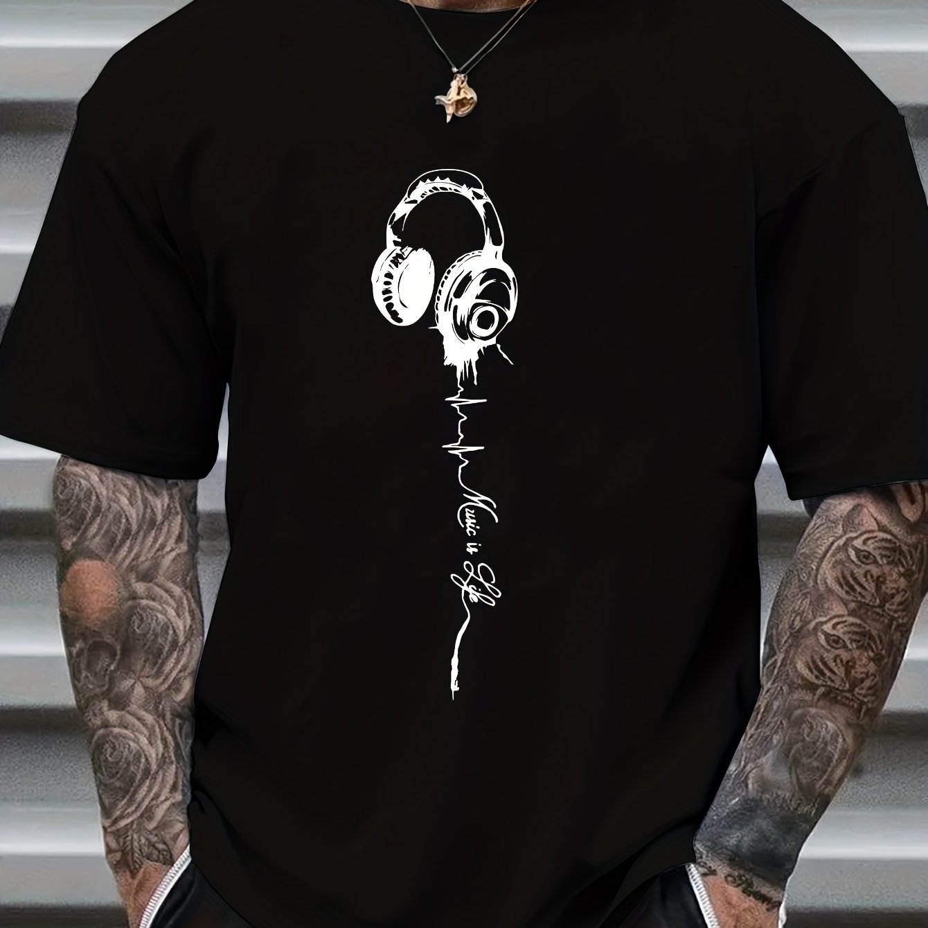 Camiseta de manga corta con estampado musical para hombre - Cuello redondo informal y cómodo