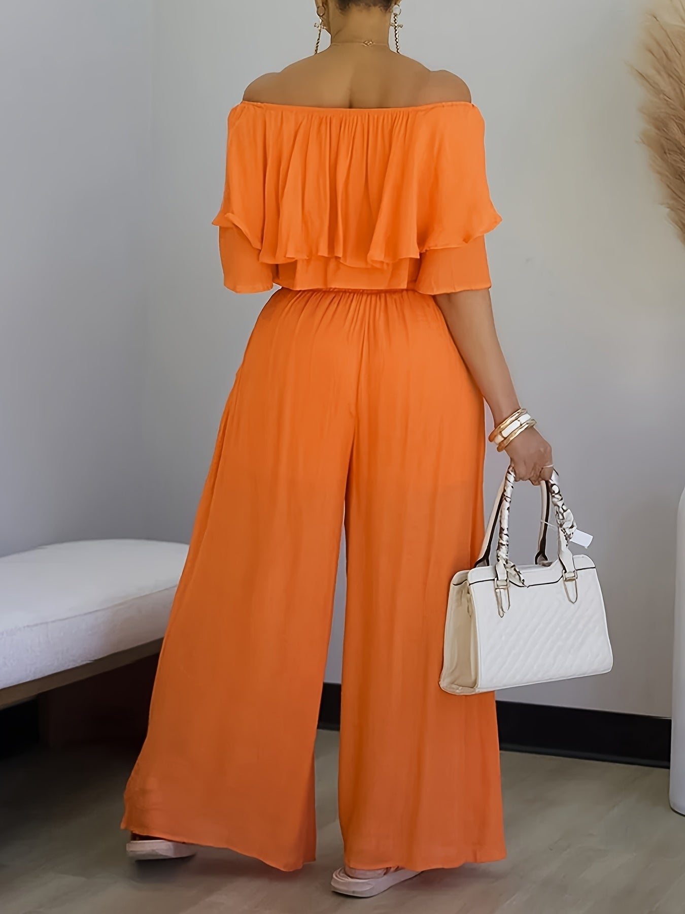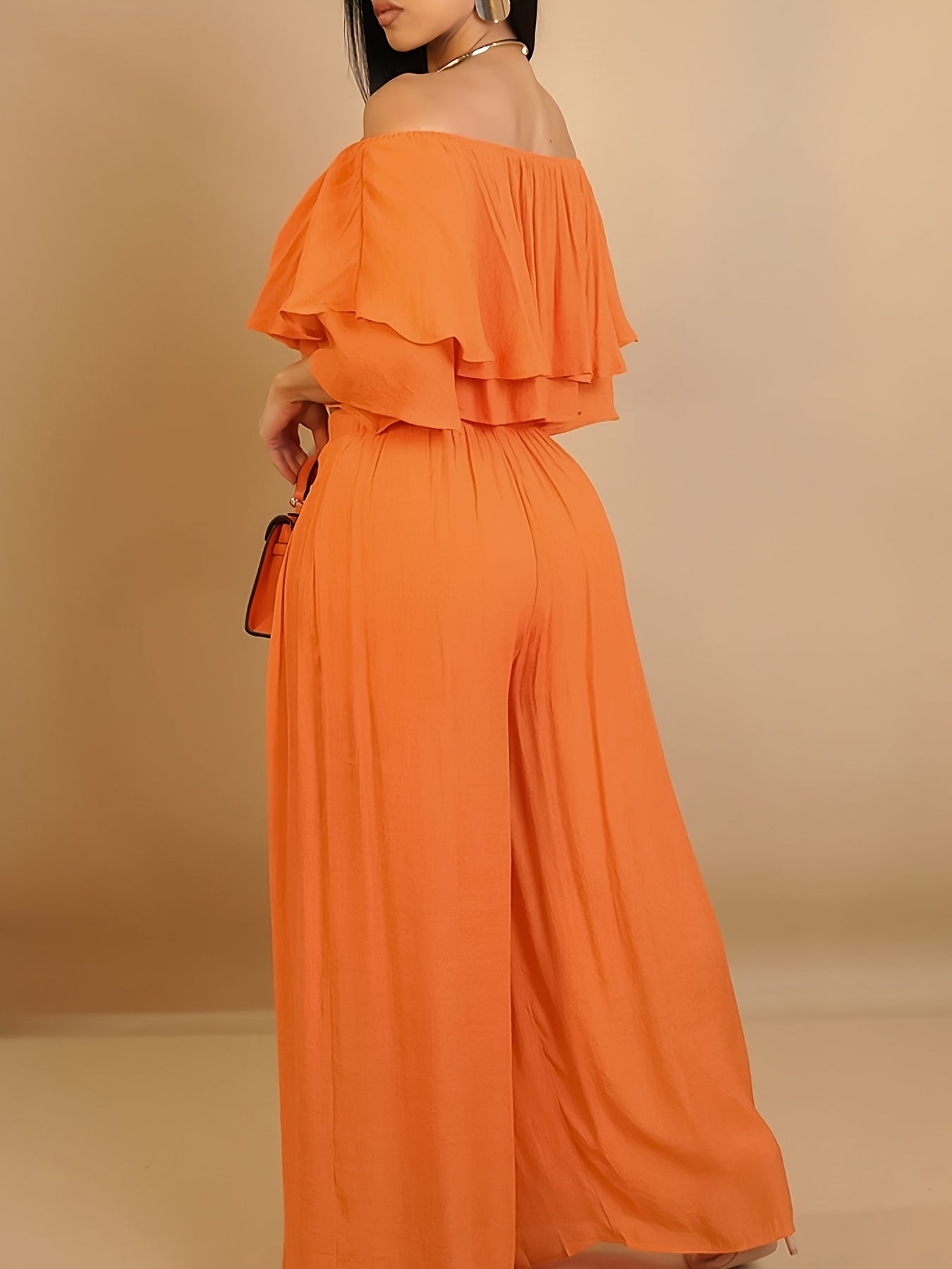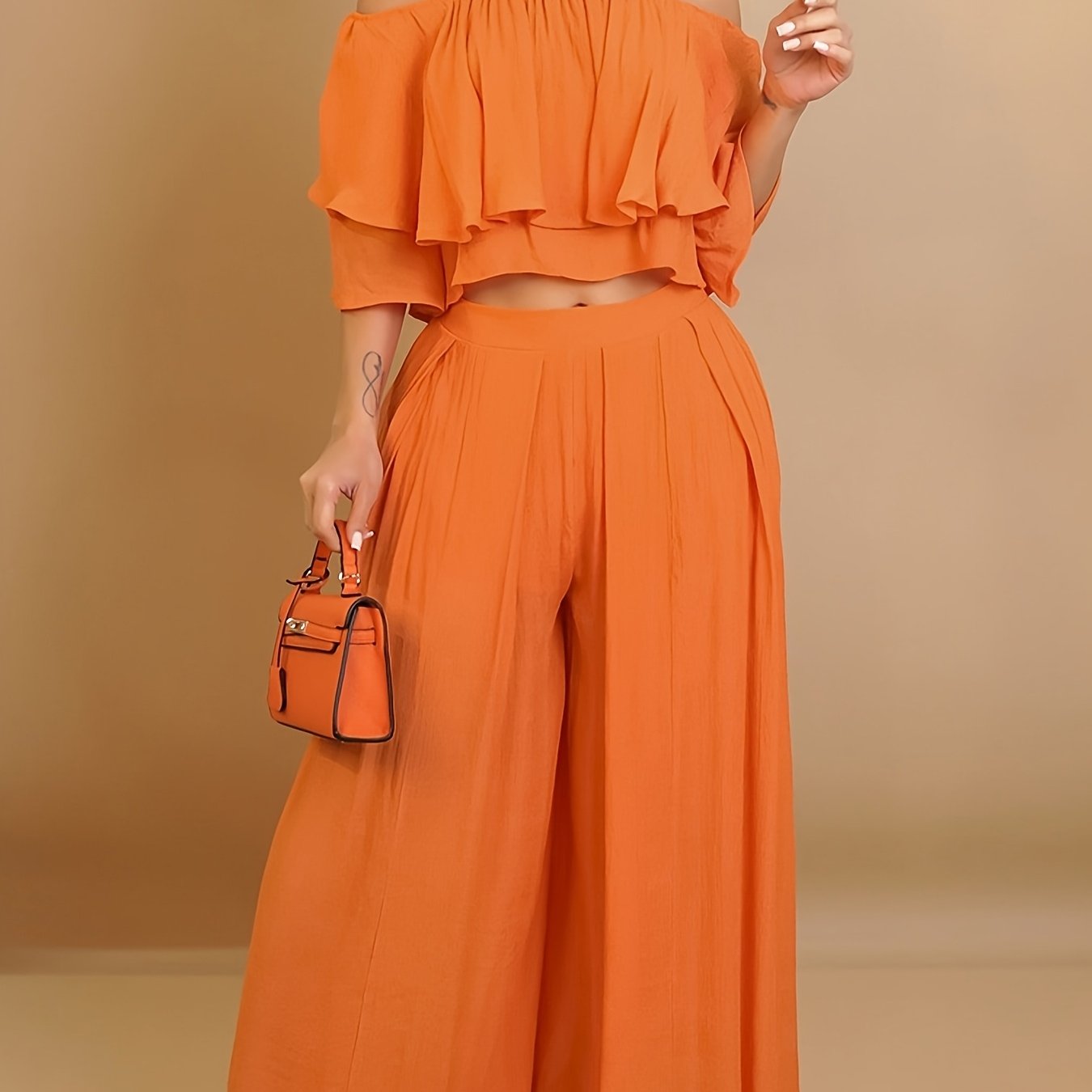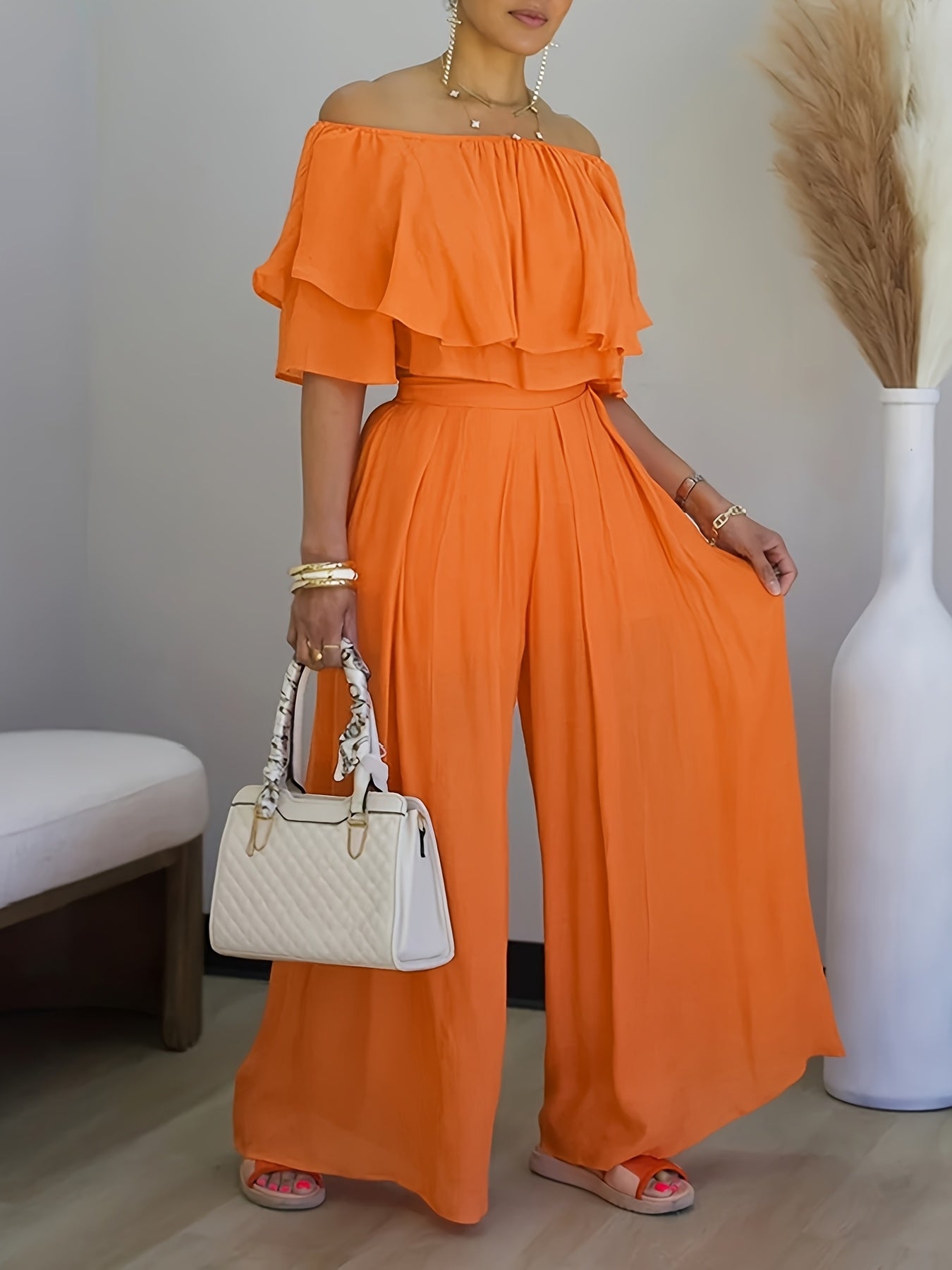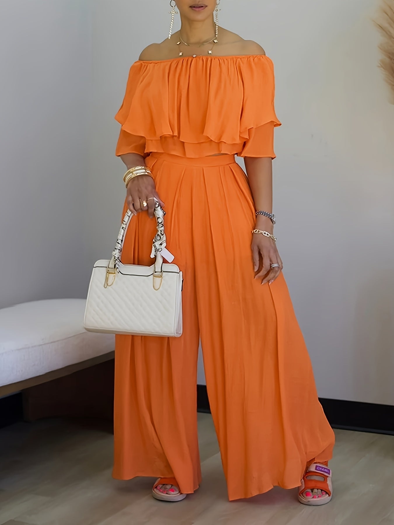 Elegante conjunto de dos piezas con hombros descubiertos y top con volantes en capas