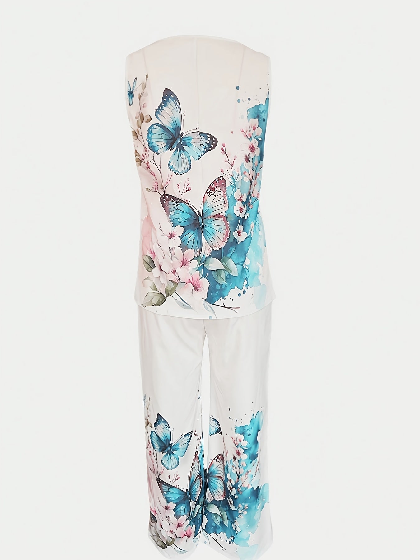 Conjunto de chaleco con estampado de mariposas y pantalones anchos: estilo bohemio y elegante.