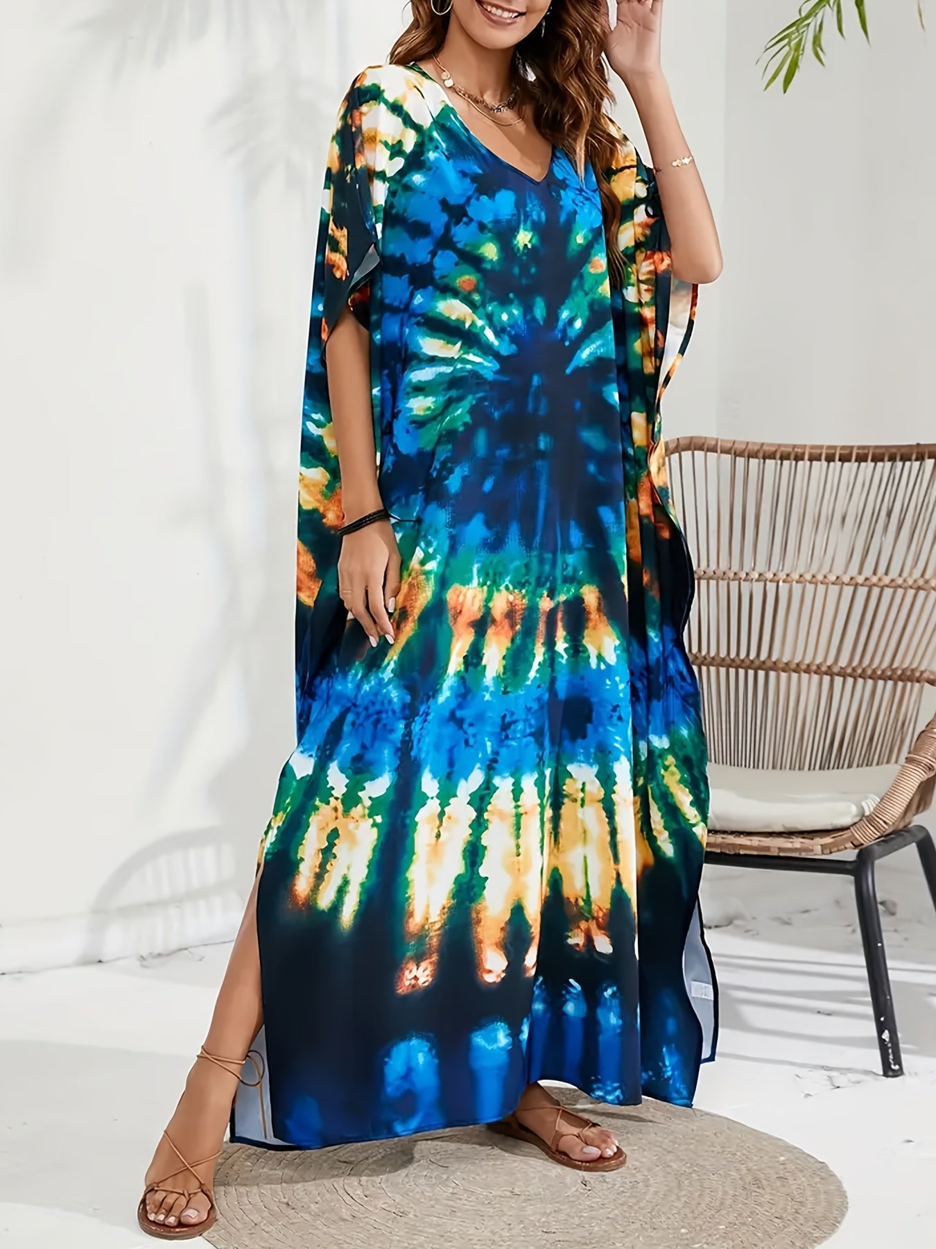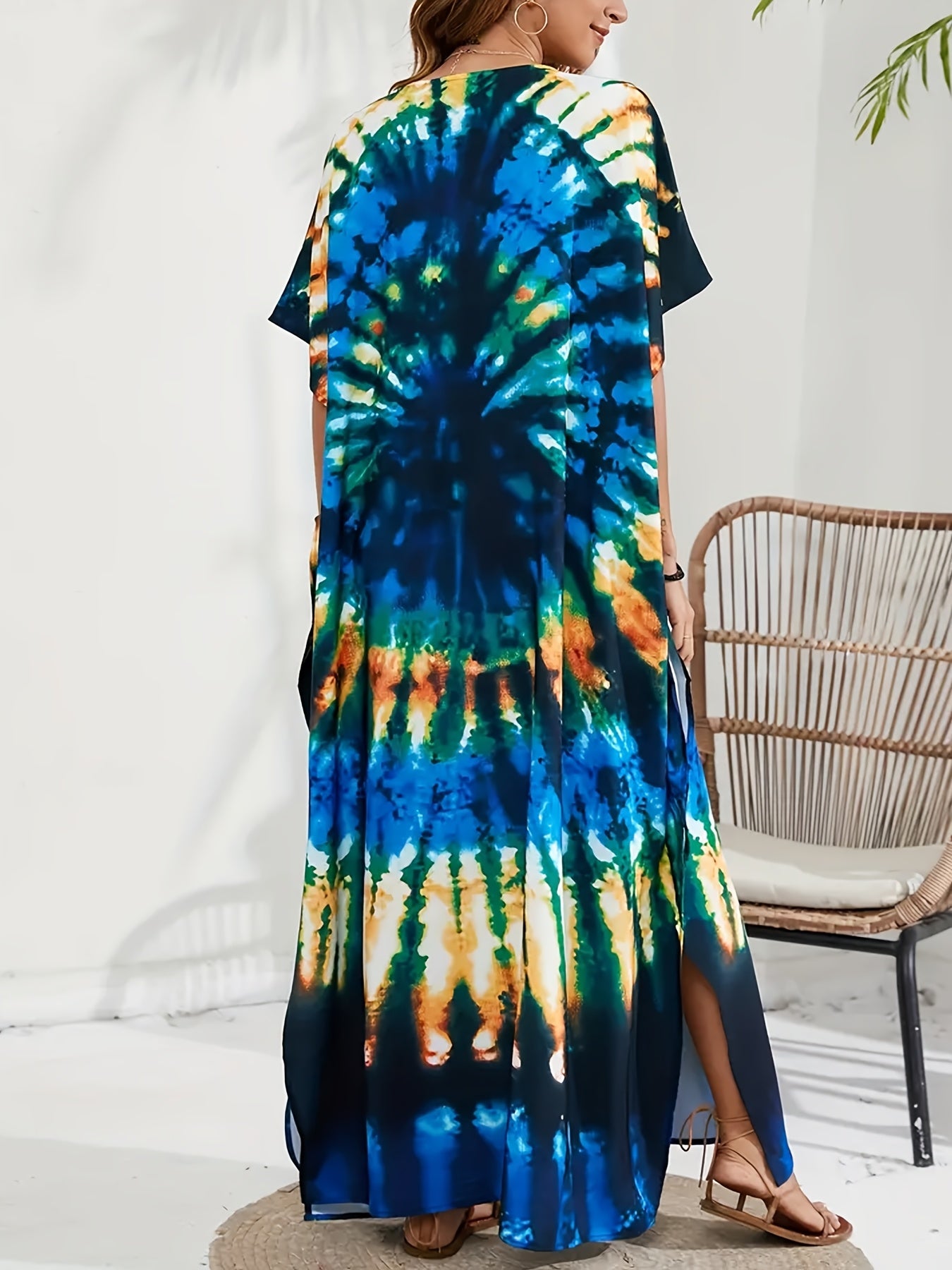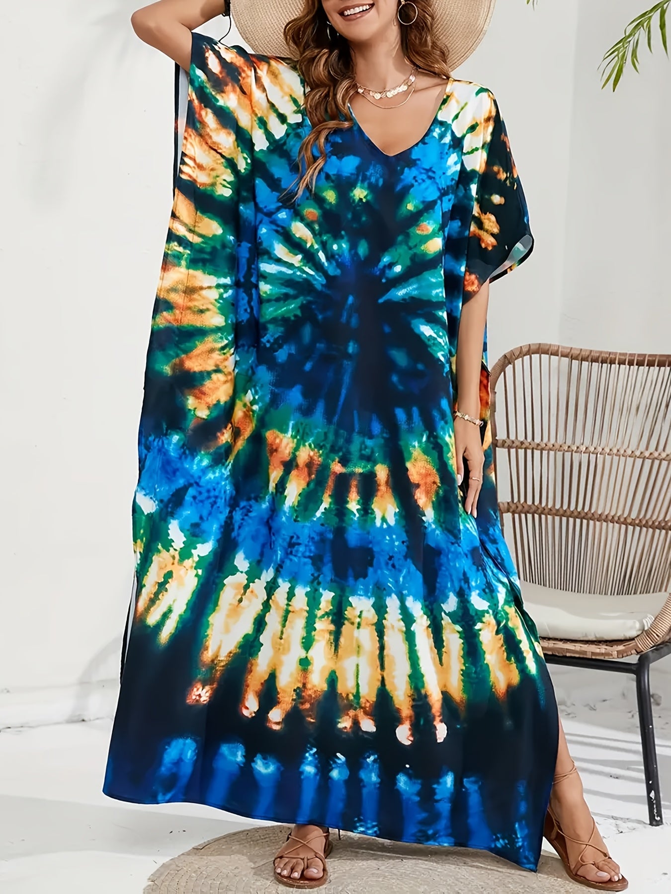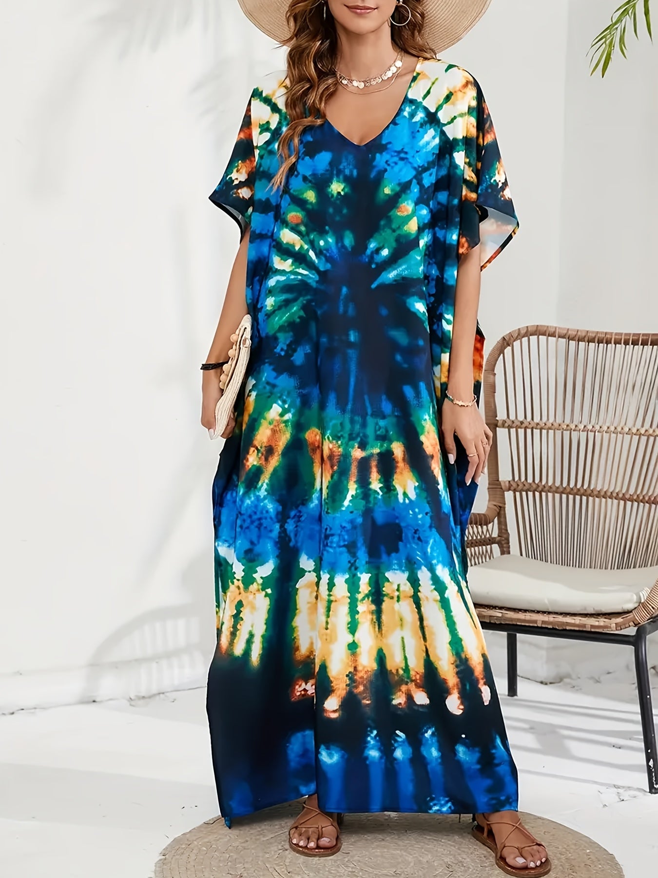 Vestido playero bohemio con escote en V - Corte holgado, estilo geométrico