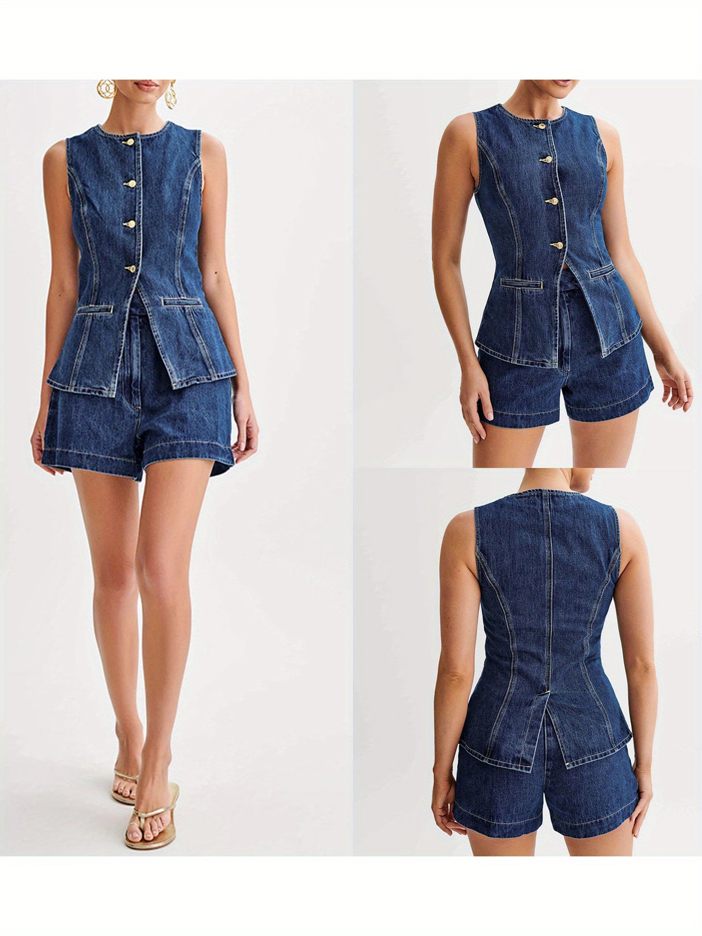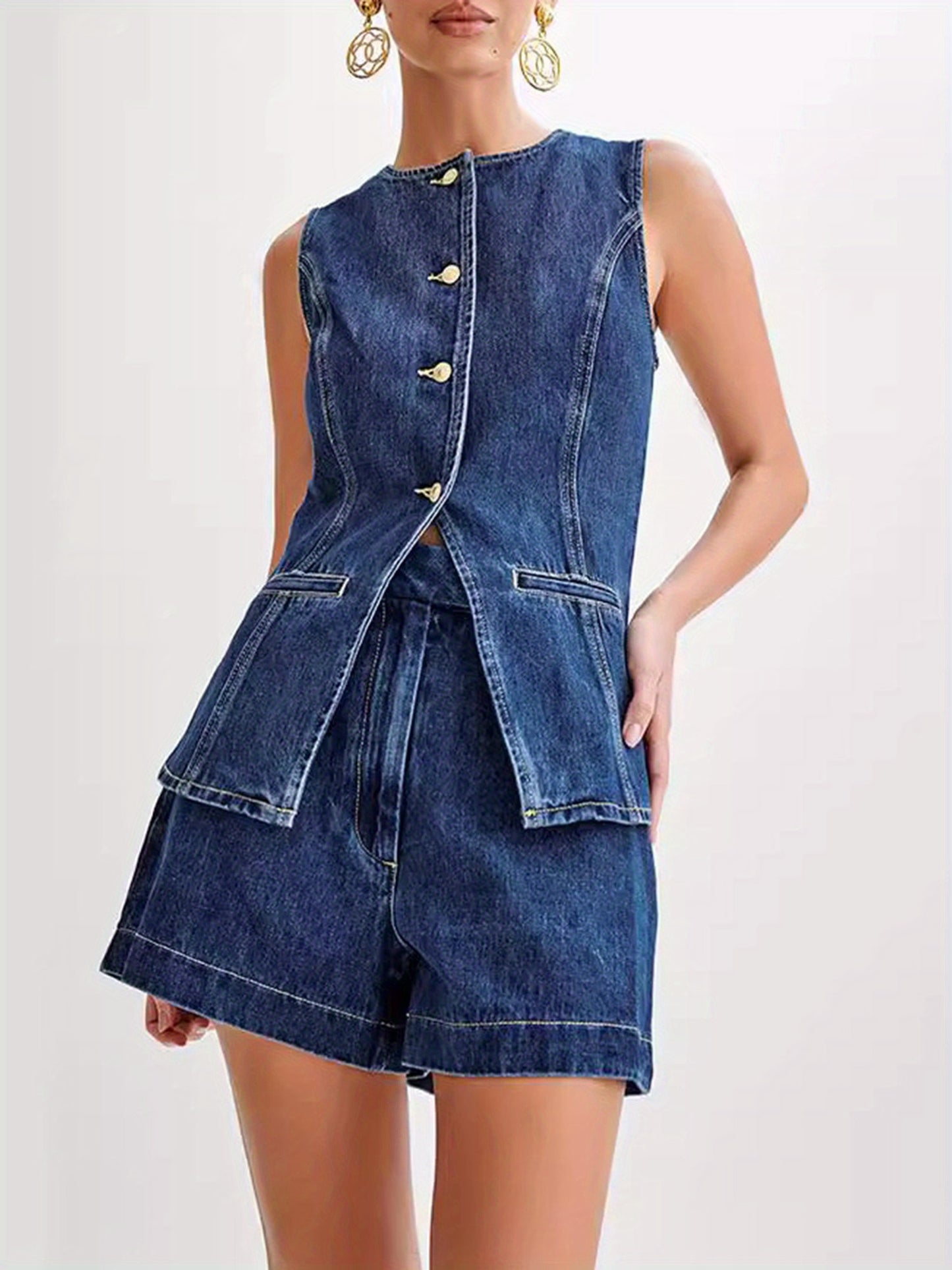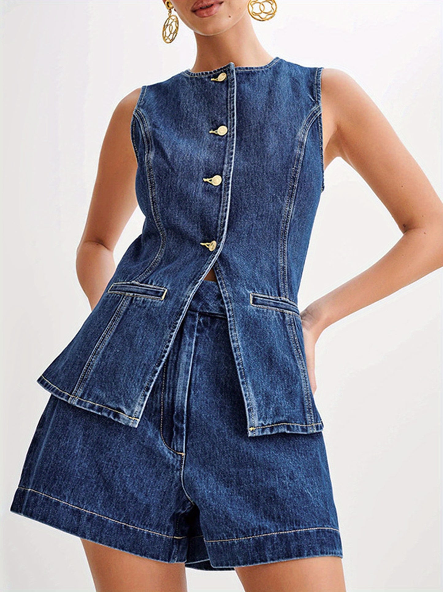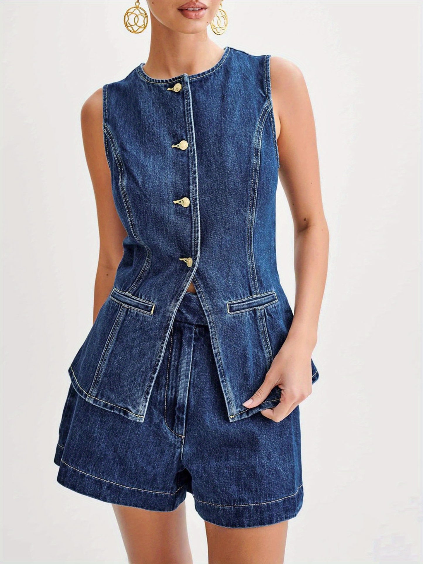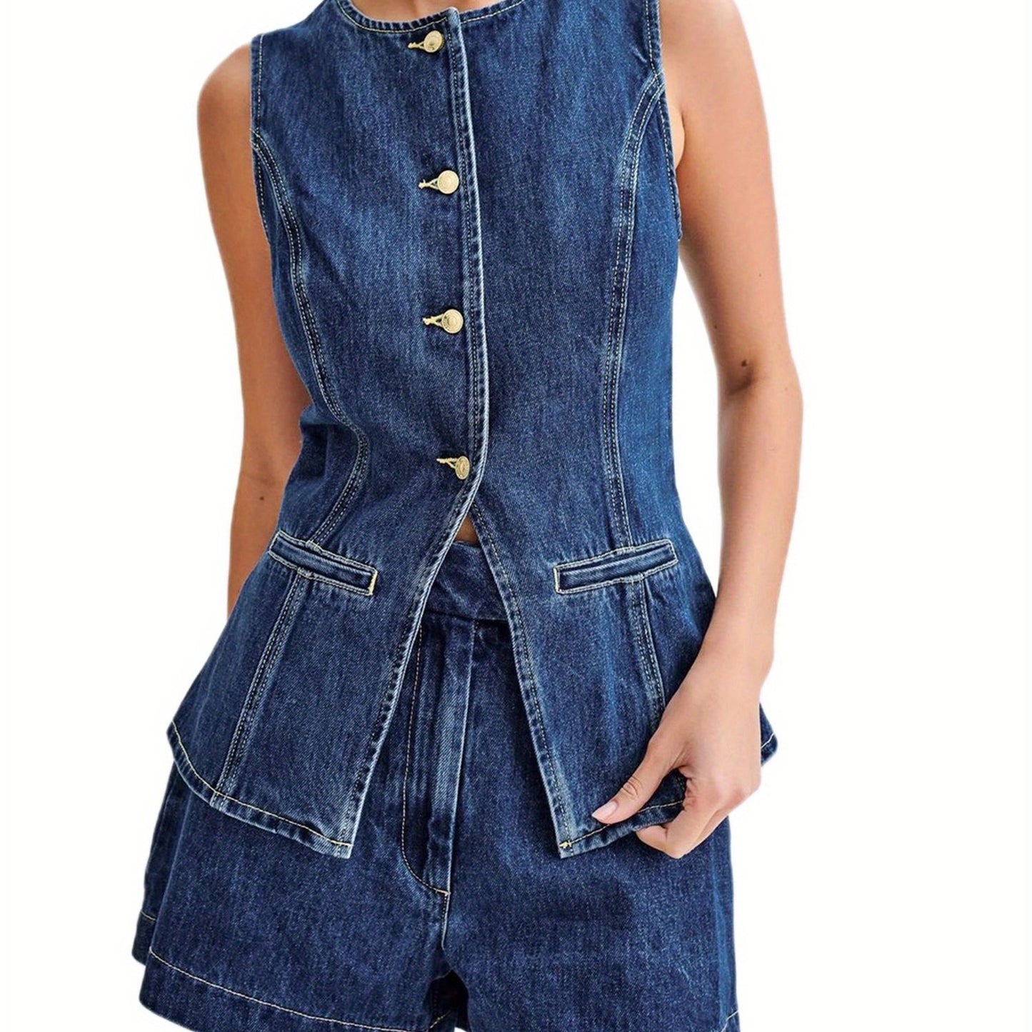Chaleco vaquero sin mangas Y2K para mujer - Azul claro con botones