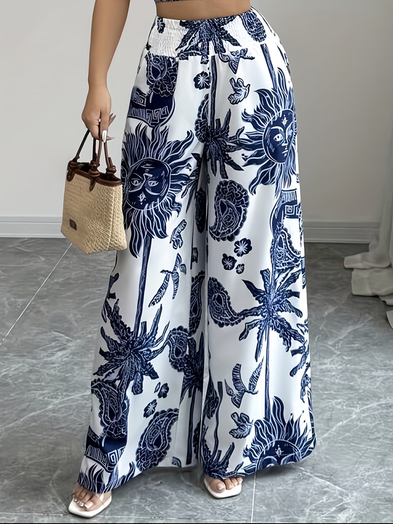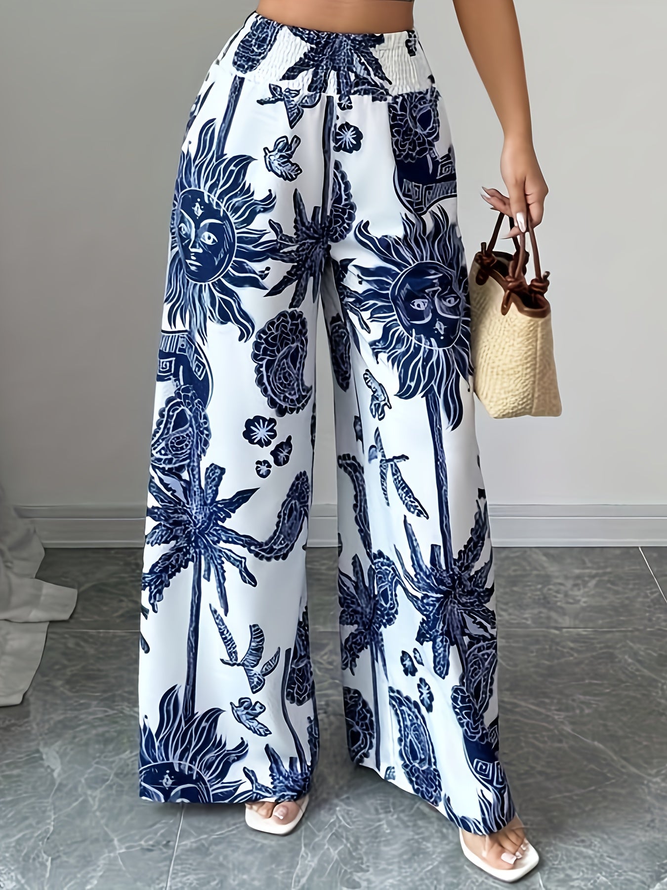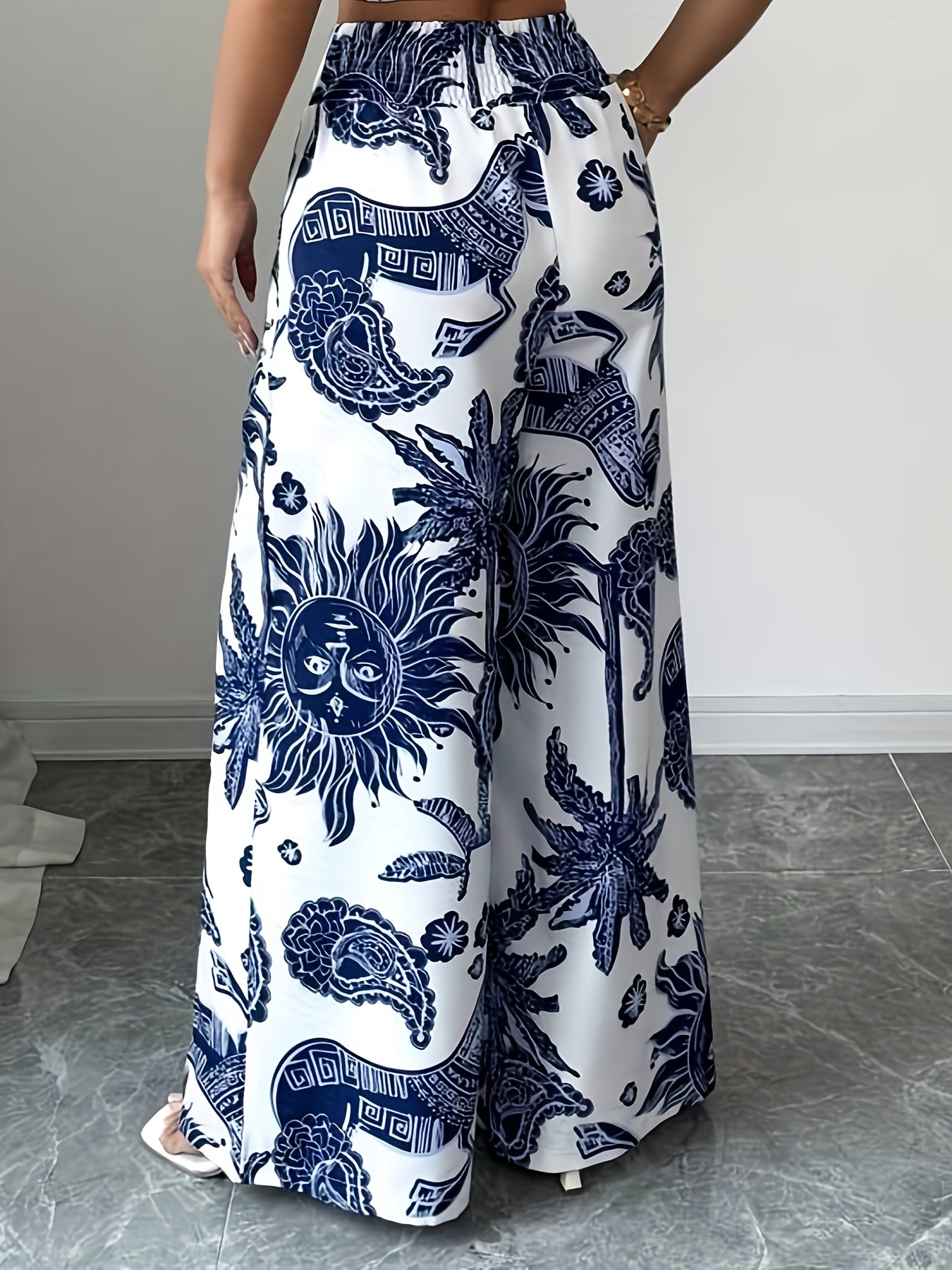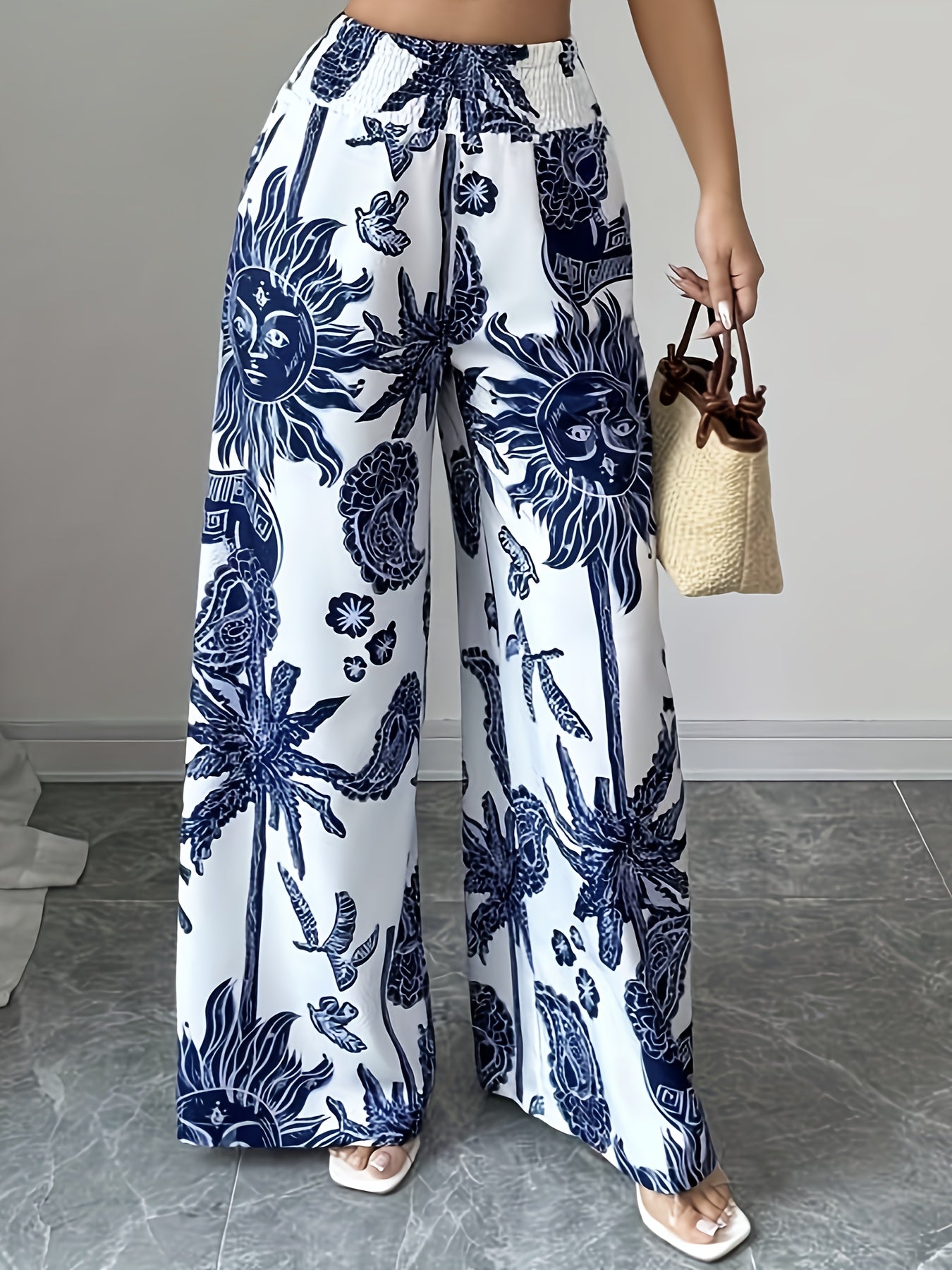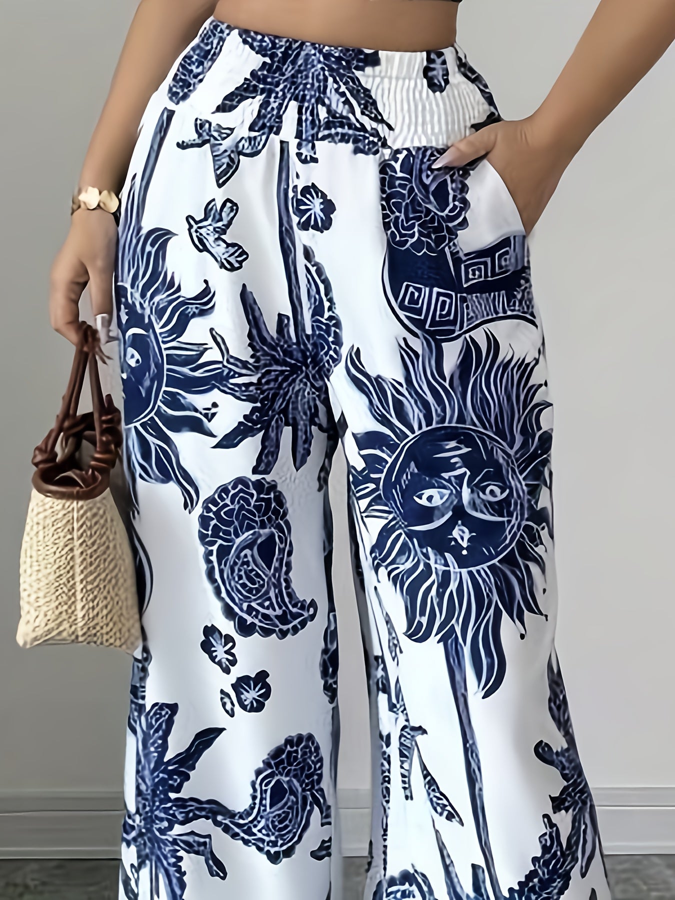 Pantalones anchos con estampado floral elegante, cintura elástica y bolsillos.
