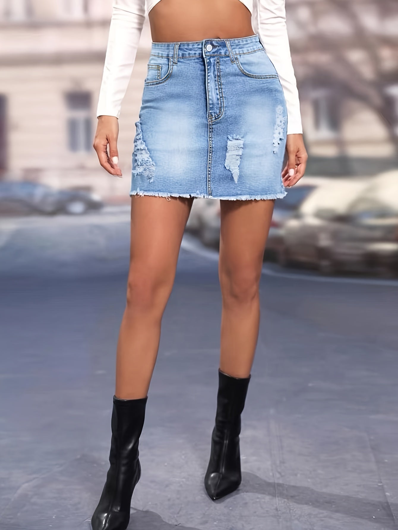 Falda vaquera desgastada de cintura alta para mujer: cómoda y elegante.