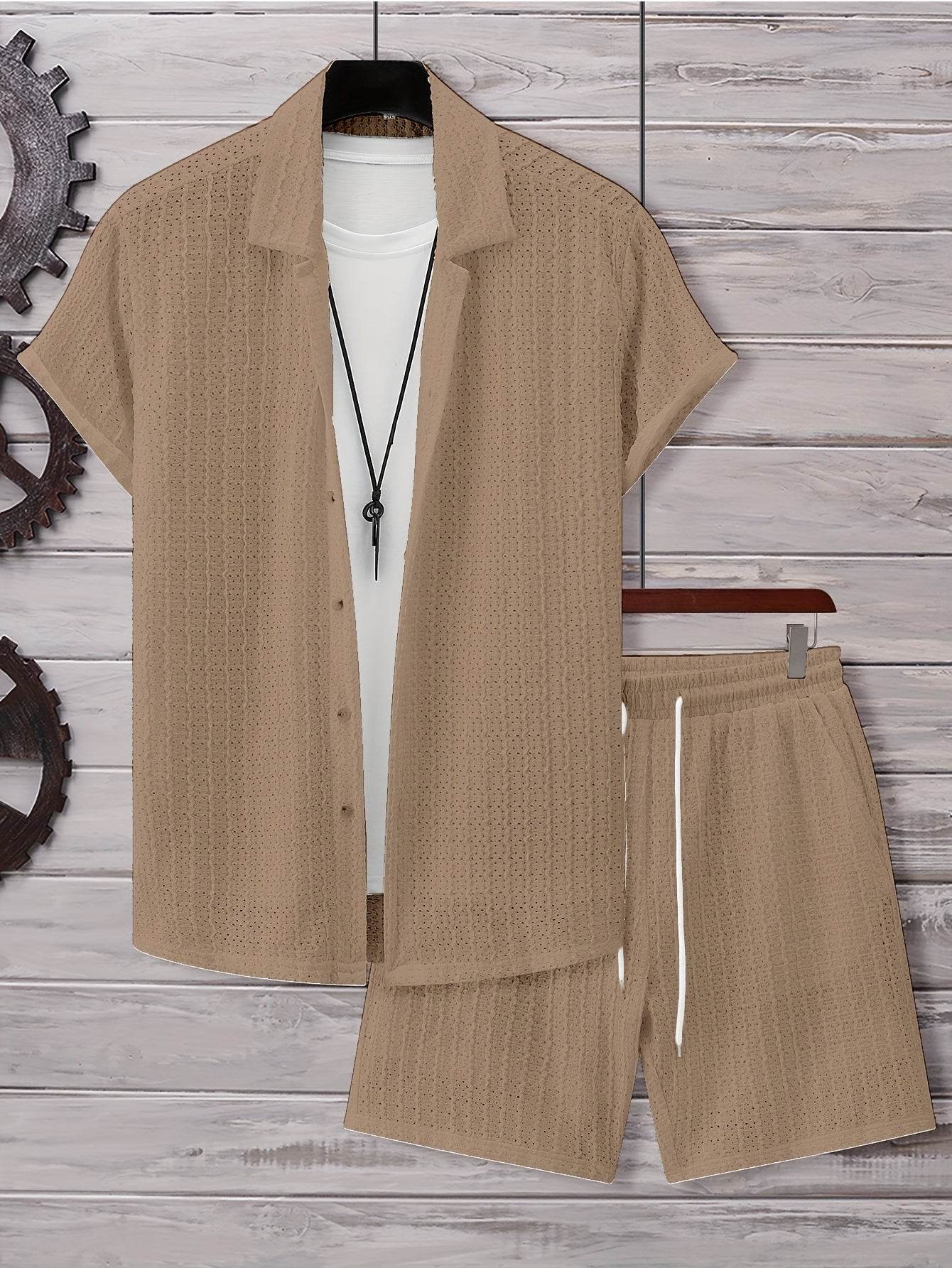 Descubre la máxima comodidad y estilo con nuestro conjunto casual de verano de manga corta para hombre. Confeccionado en una mezcla de poliéster transpirable y de punto calado, este conjunto deportivo incluye elegantes pantalones cortos y está diseñado con un corte regular, perfecto para climas cálidos y estilos de vida activos.