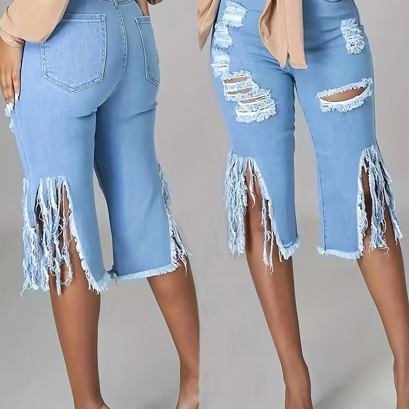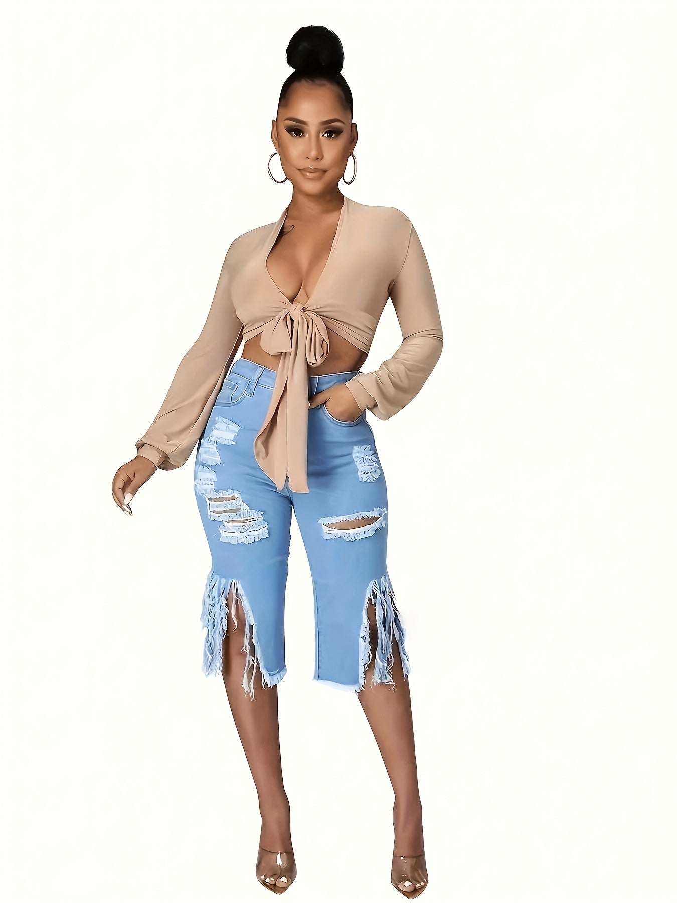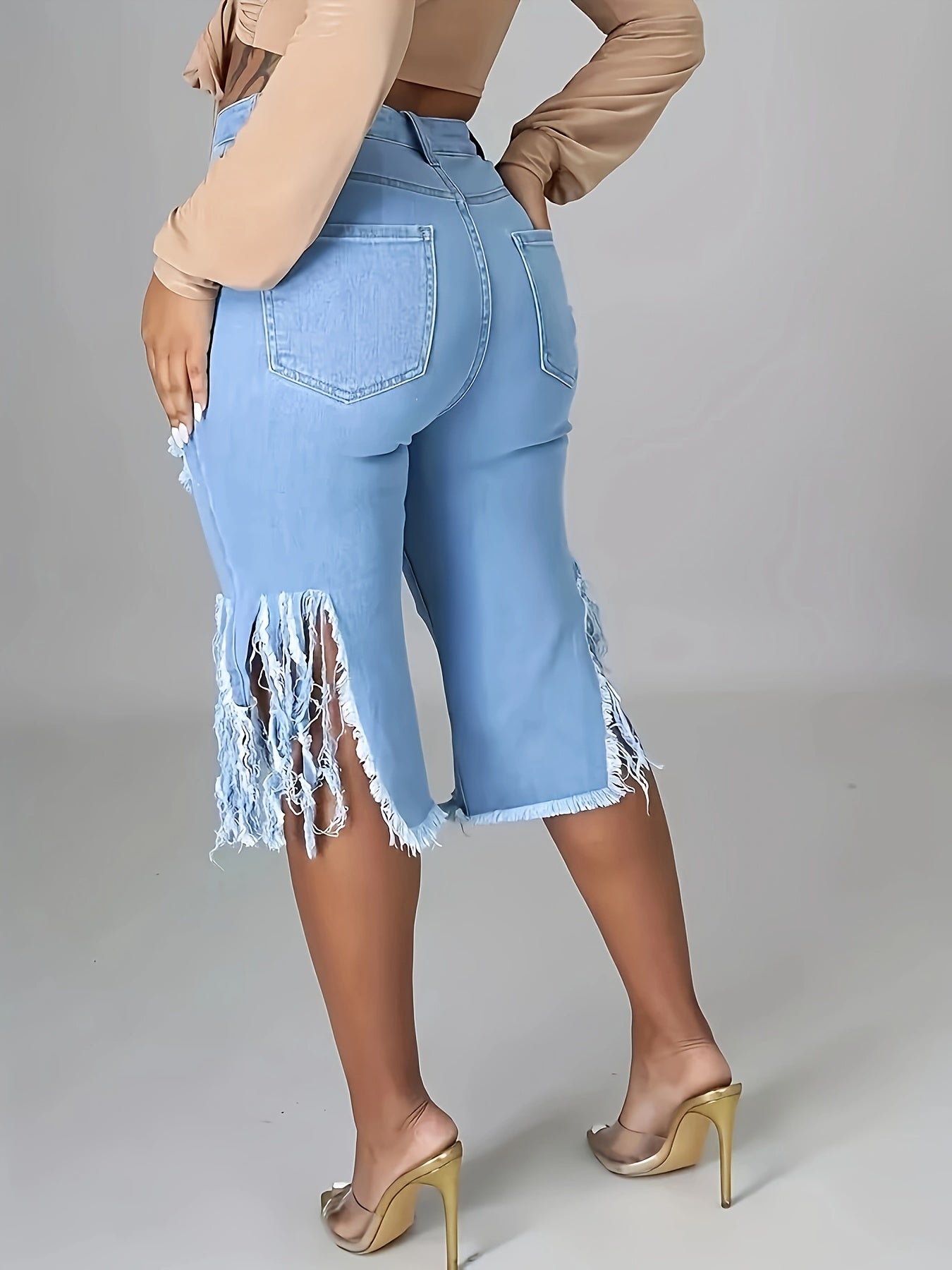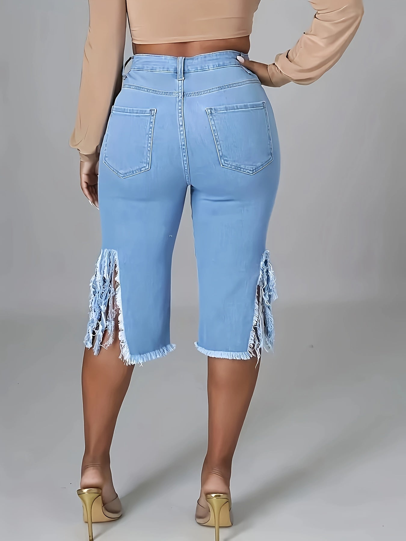 Bermudas casuales para mujer - Denim elástico azul claro con borlas