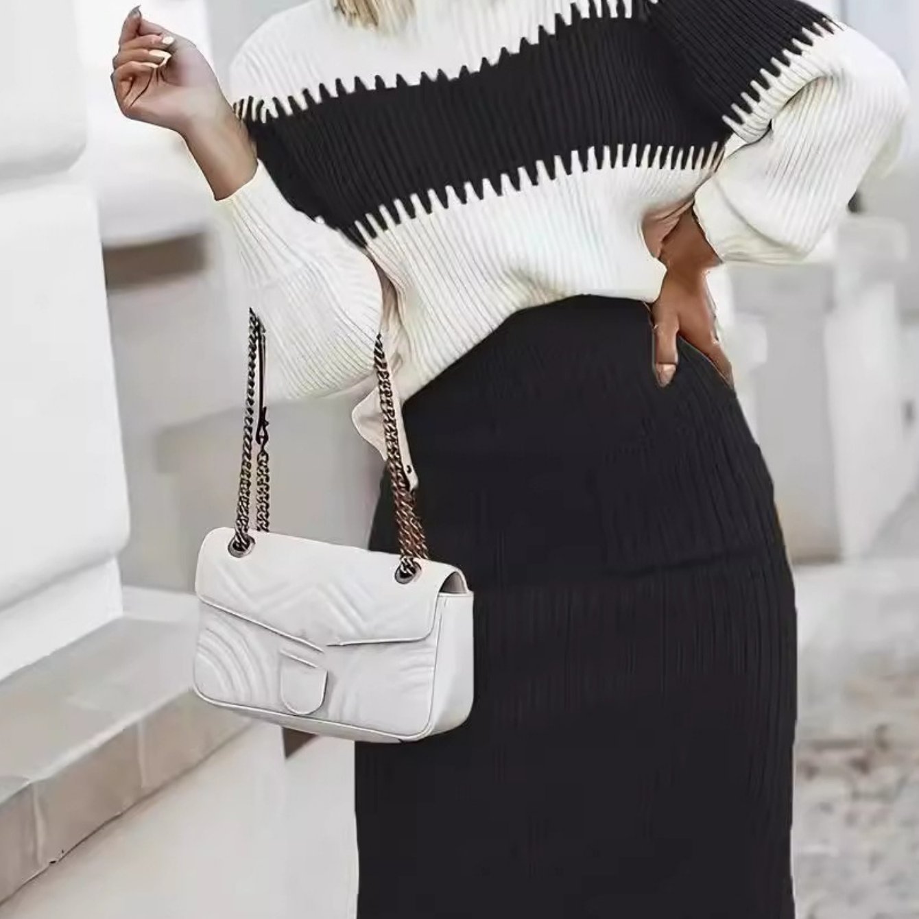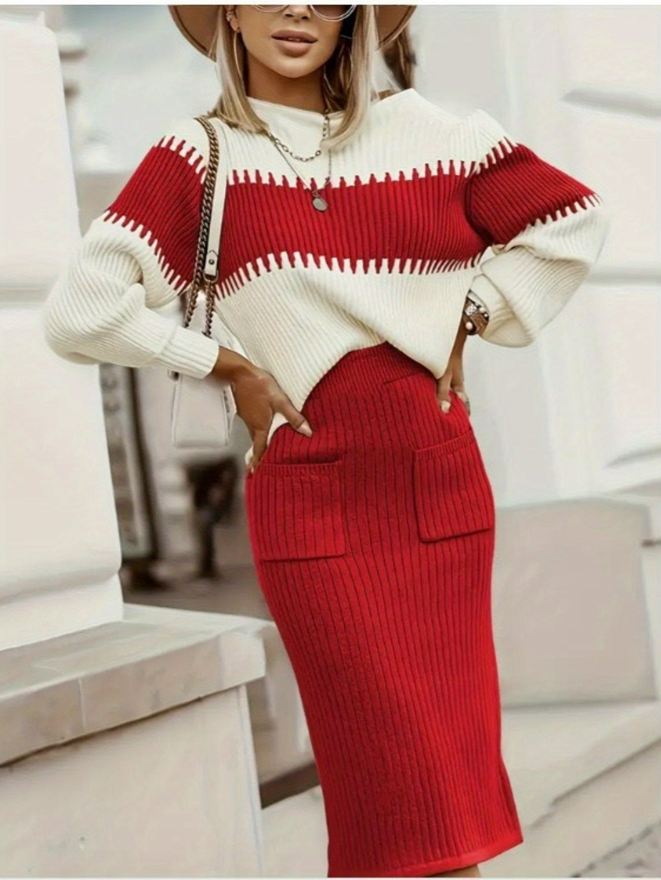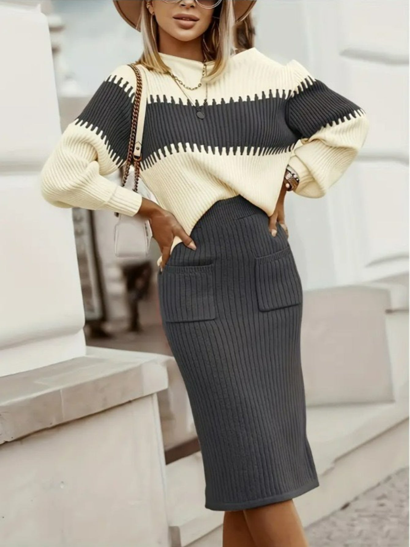 Conjunto de dos piezas de polar para mujer: elegante jersey con cuello en V y falda