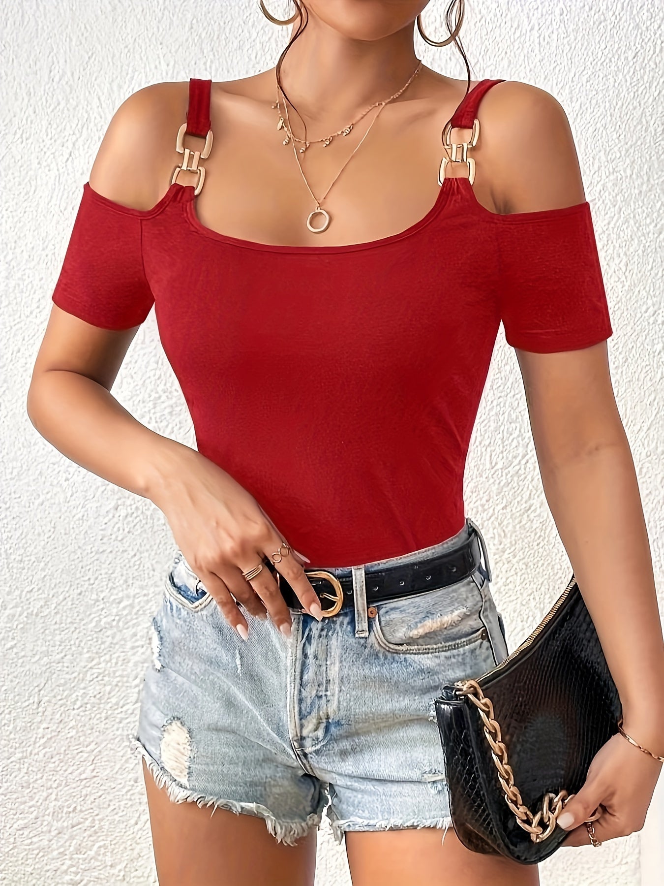 Presentamos nuestra camiseta lisa con tirantes de cadena y hombros descubiertos, una elegante camiseta de manga corta y corte ajustado, perfecta para primavera y verano. Confeccionada en 95 % poliéster, esta elegante camiseta combina comodidad y sofisticación, convirtiéndola en una prenda imprescindible para tu colección de ropa femenina.