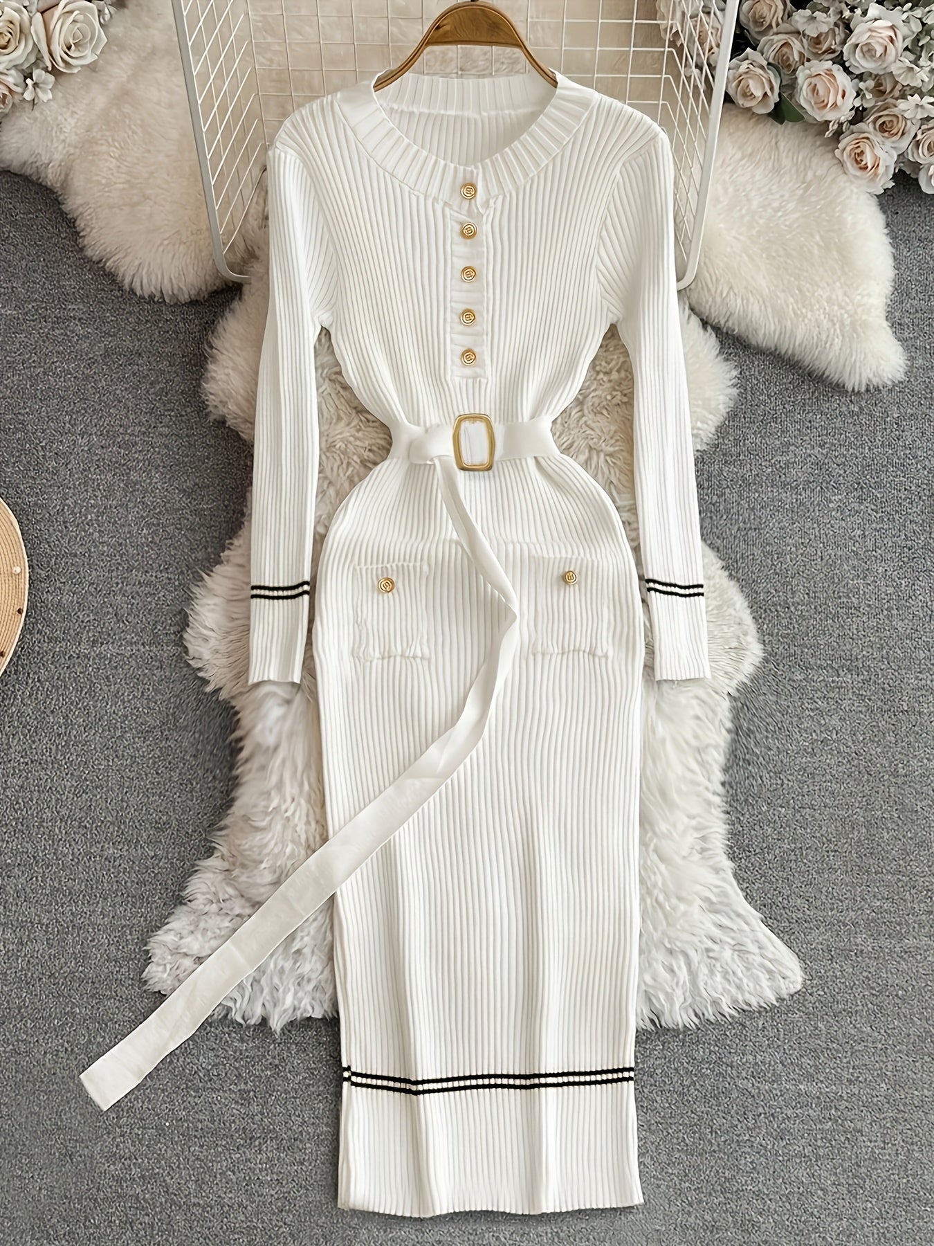 Presentamos nuestro nuevo vestido casual de manga larga para mujer, con rayas blancas y negras en contraste y bolsillos con botones metálicos. Una elegante combinación de comodidad y elegancia. Confeccionado en una mezcla de acrílico y nailon de alta calidad, este vestido estilo suéter es perfecto para cualquier ocasión informal.
