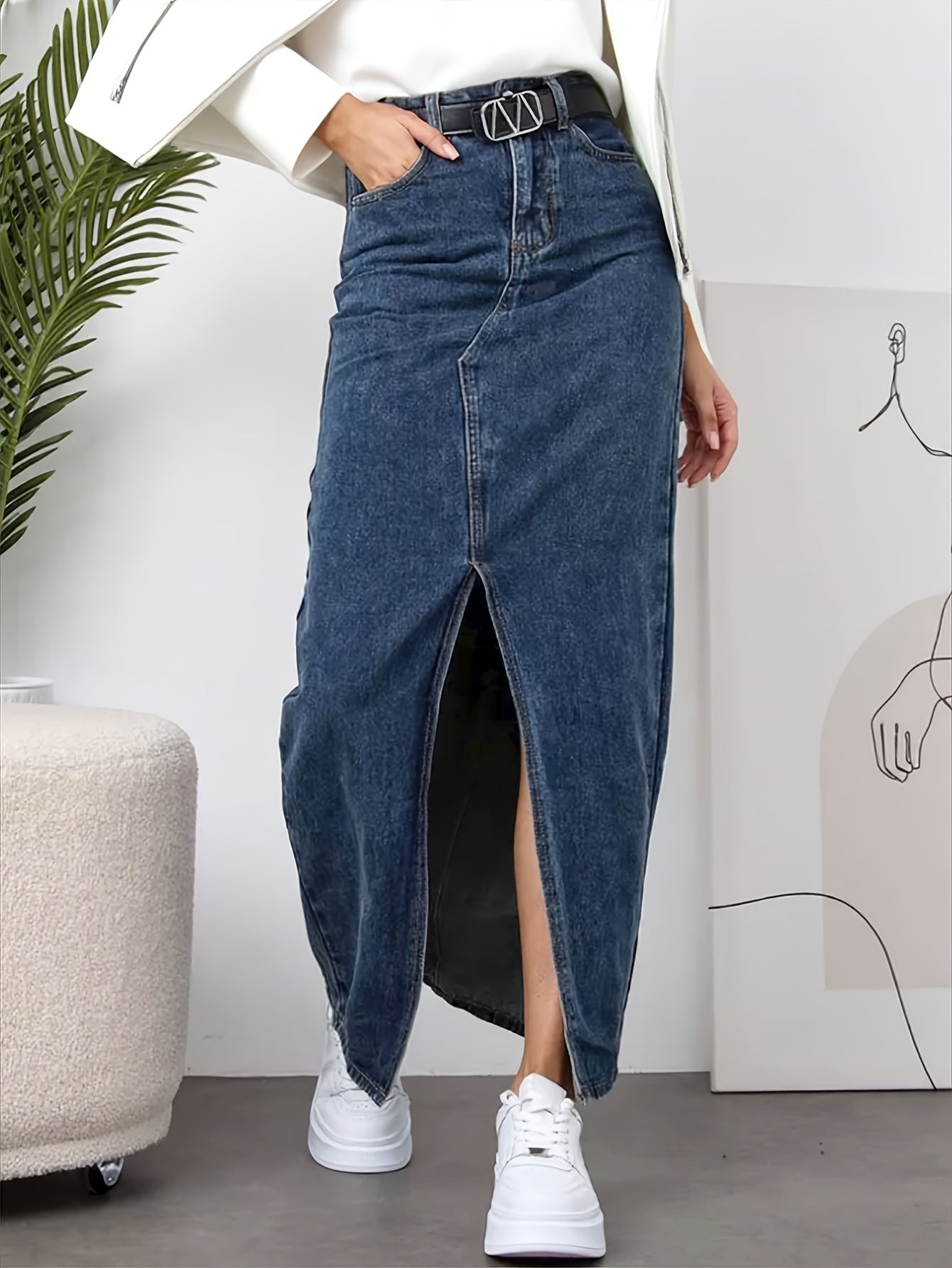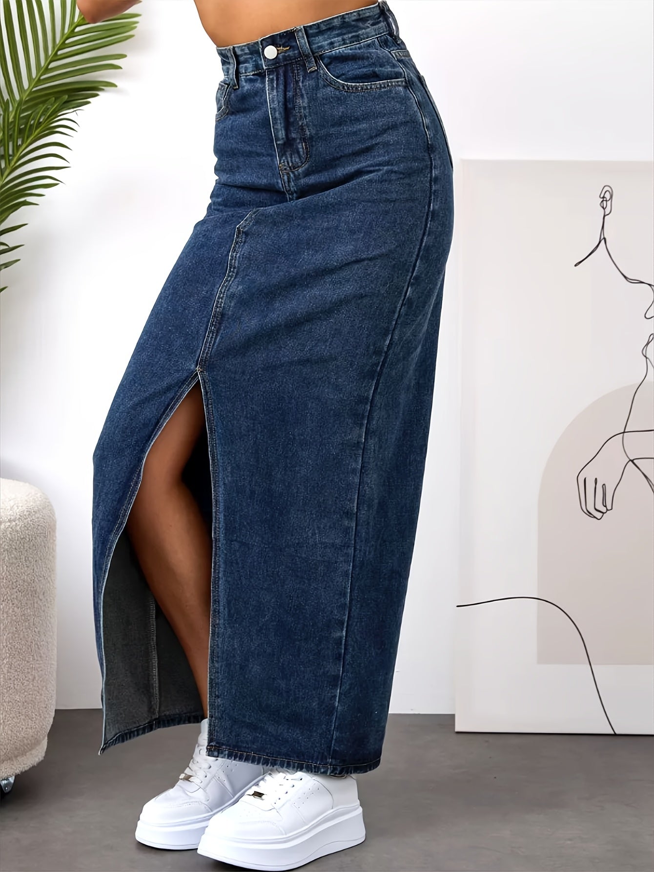 Mejora tu guardarropa con nuestra elegante falda de largo medio para mujer, perfecta tanto para salidas informales como para eventos formales. La elegante abertura lateral le da un toque moderno a un diseño clásico, mientras que la resistente tela vaquera ofrece comodidad y estilo. Combínala con tu top y accesorios favoritos para un look que llame la atención. Esta falda no es solo un conjunto, sino una declaración de estilo.