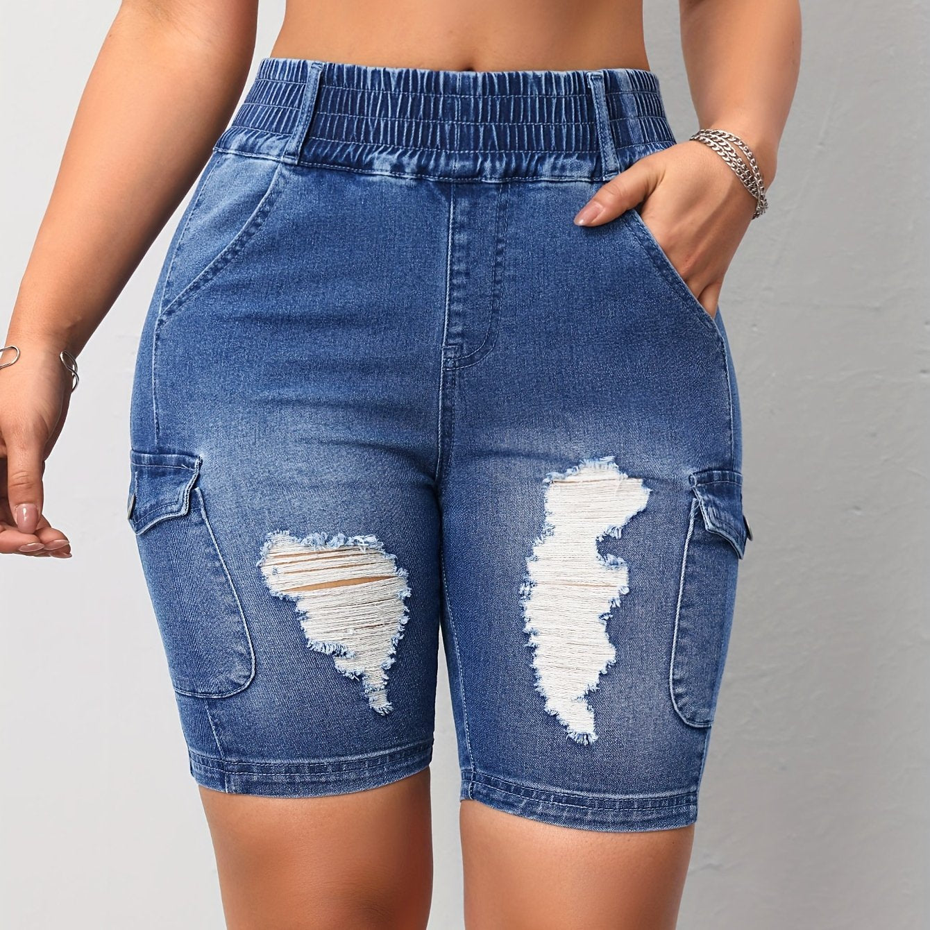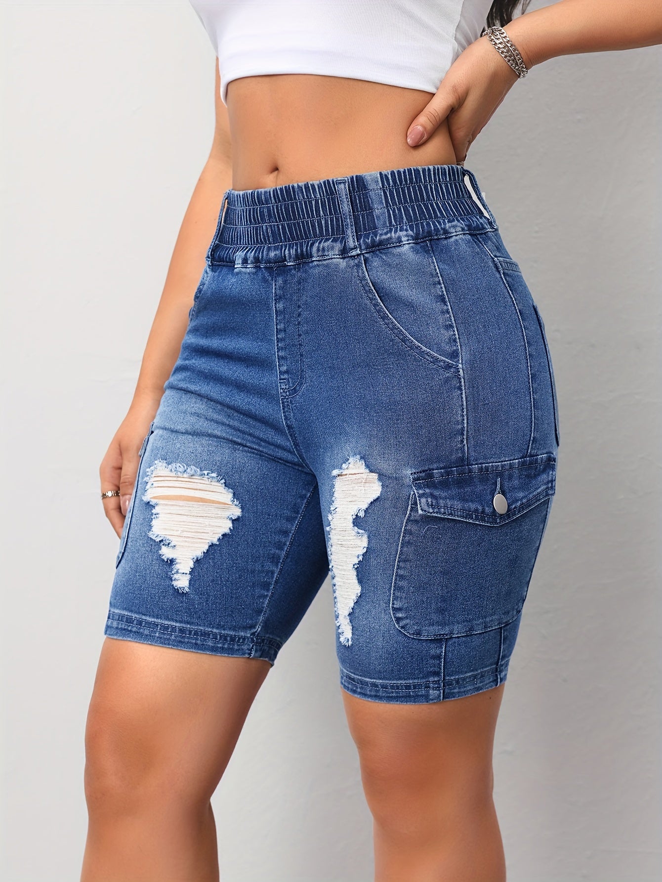 Short en jean taille haute effet usé pour femme - Style décontracté pour l'été