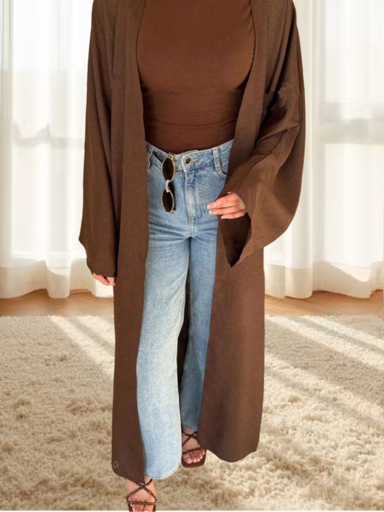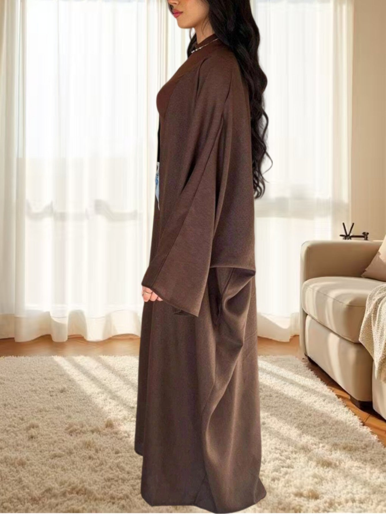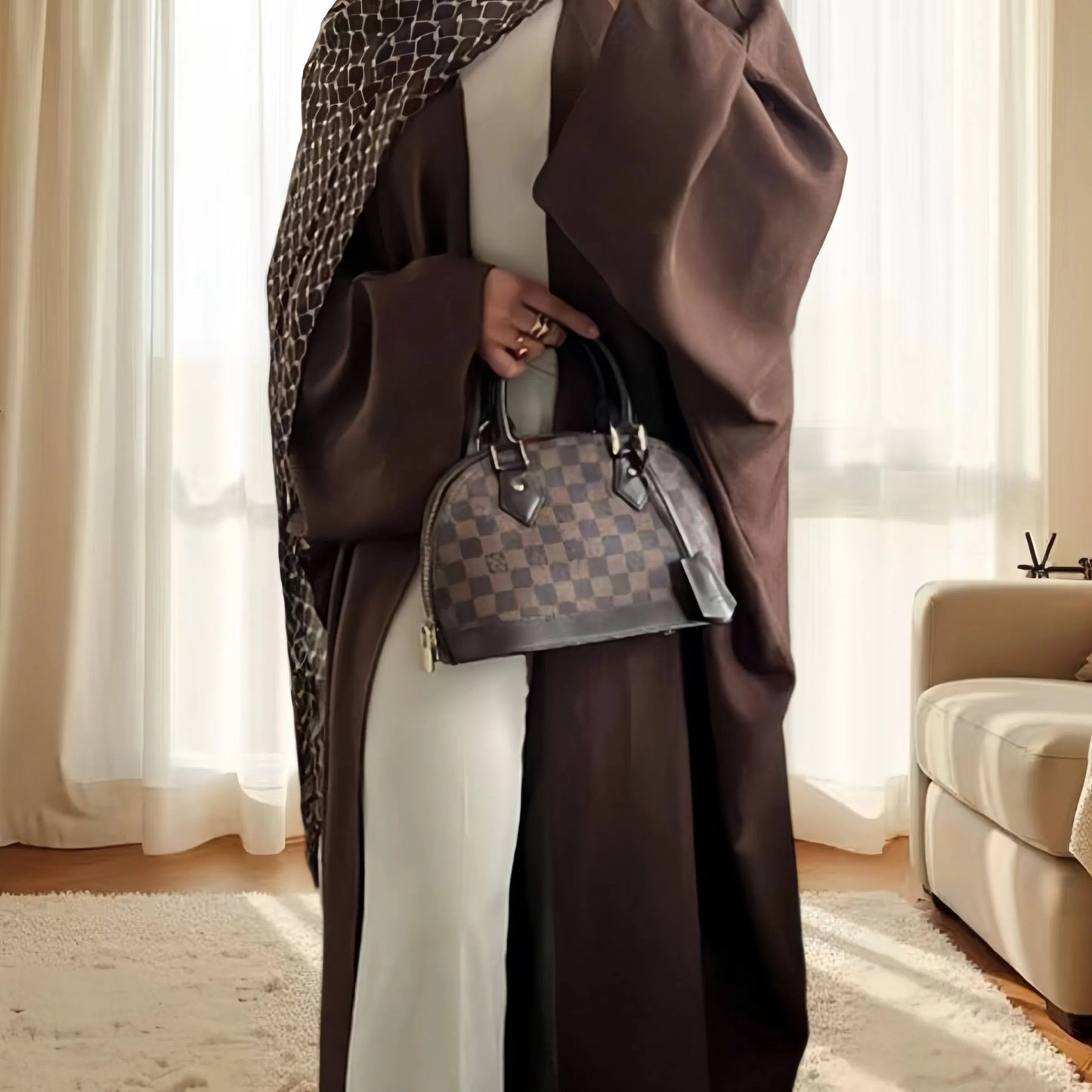 Affirmez votre style avec notre élégante abaya à manches chauve-souris, alliant simplicité et sophistication. Sa couleur unie et sa coupe fluide en font un incontournable de votre garde-robe, facile à assortir en toute occasion. Affirmez votre sens de la mode avec une abaya qui se porte aussi bien le jour que la nuit.