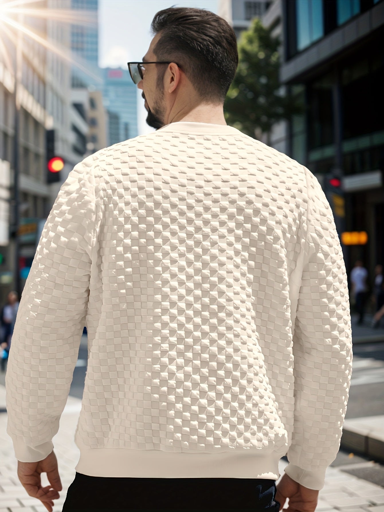 Men'S Fashion Textured Grid Pattern Long Sleeve Crew Neck Sweatshirt, 100% Polyester Knit Fabric, Casual Regular Fit with Medium Stretch, Solid Color Chop Stamping Detail, 240g/m² Weight