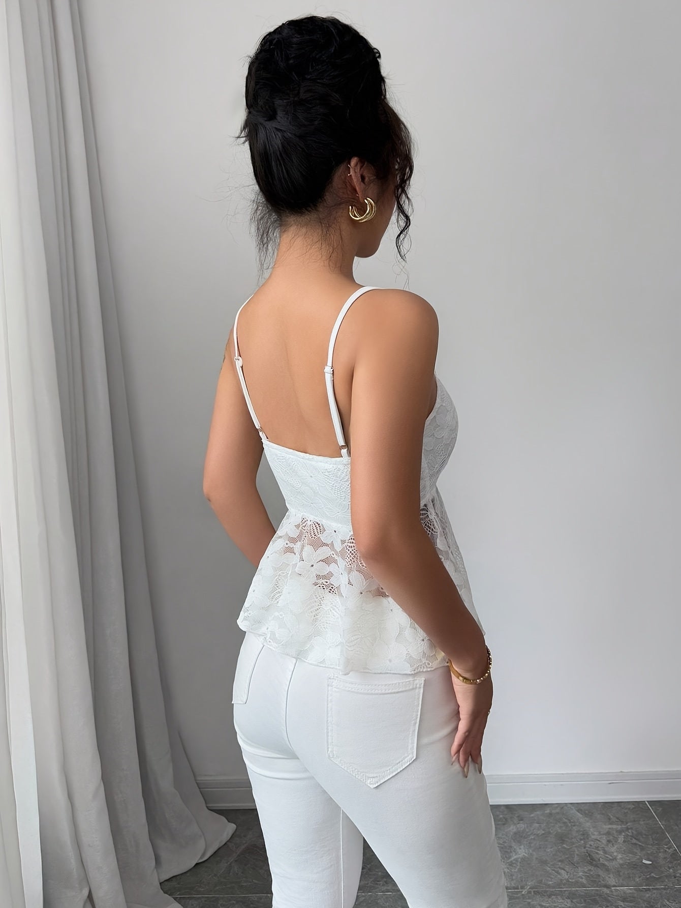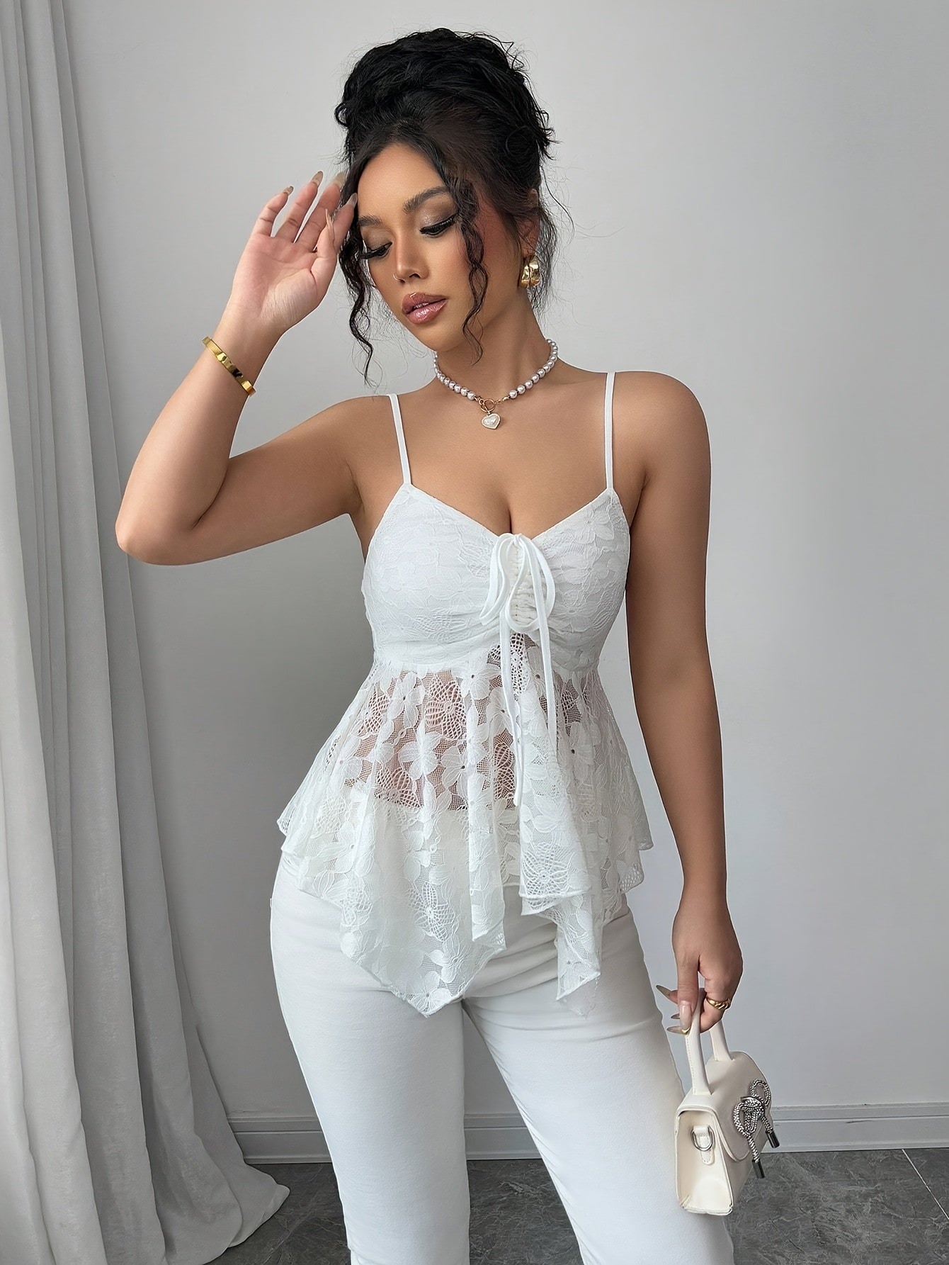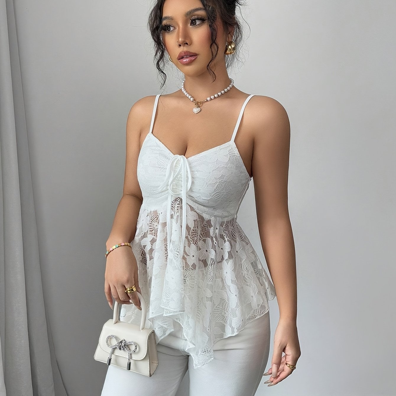 Haut élégant à bretelles fines et bordure en dentelle transparente pour femme - Chemisier léger
