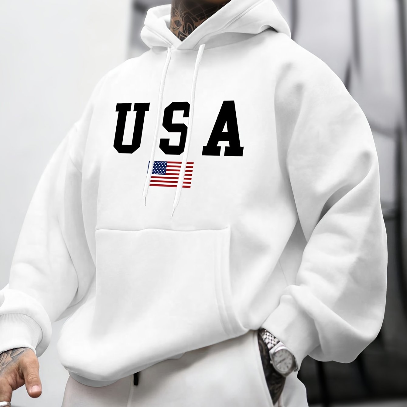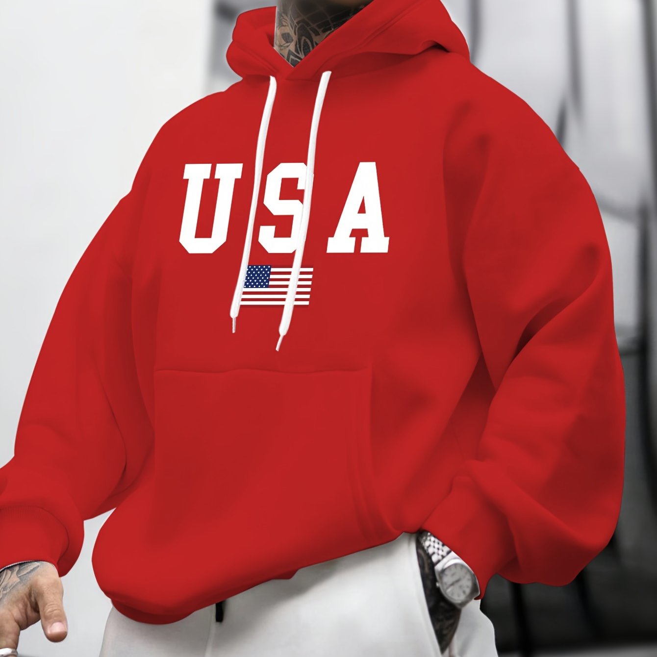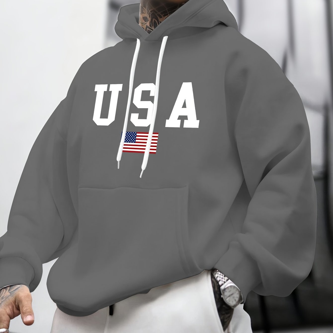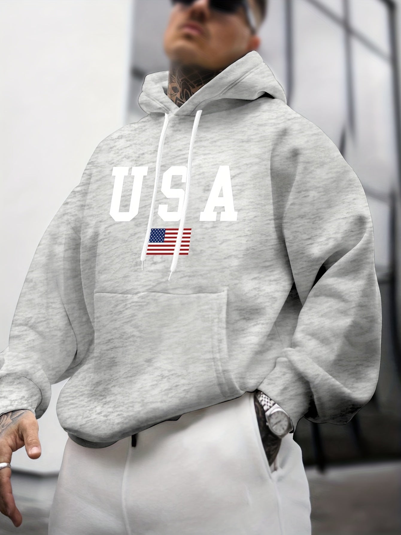 USA Flag Print Men's Long Sleeve Hooded Sweatshirt, Trendy Pullover Hoodie With Kangaroo Pocket, Casual Comfortable Versatile Top For Spring And Autumn