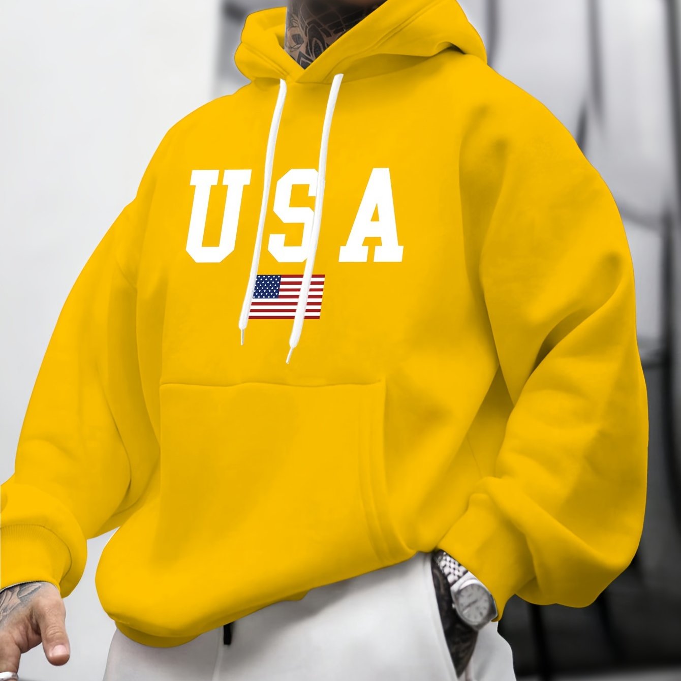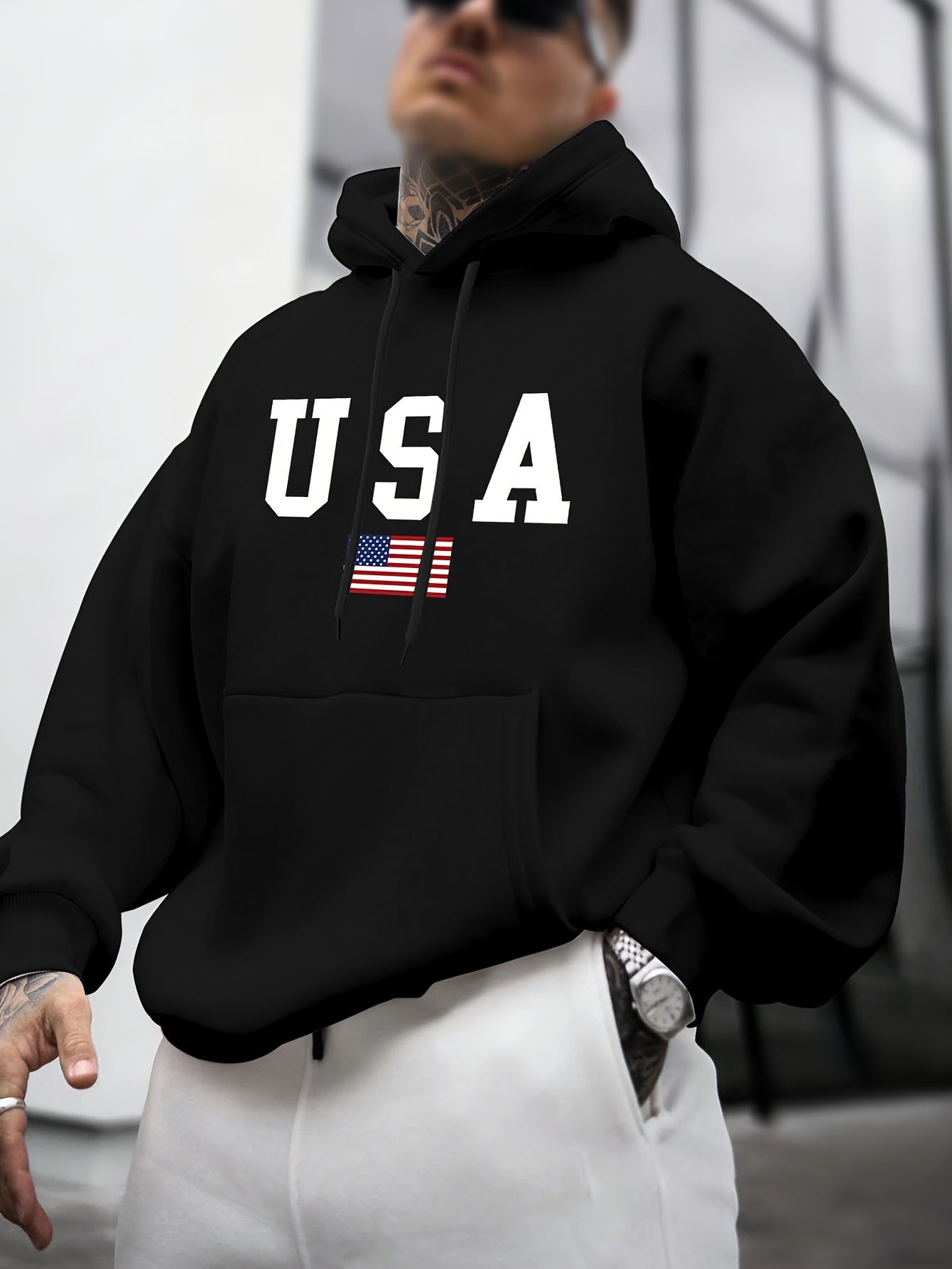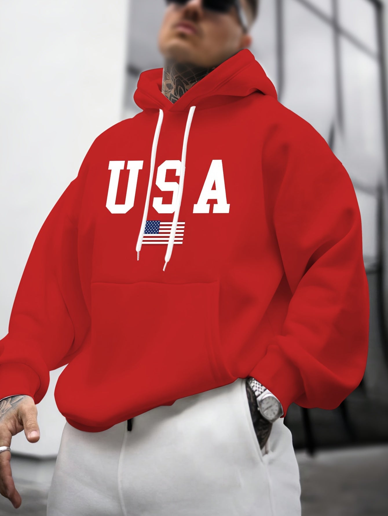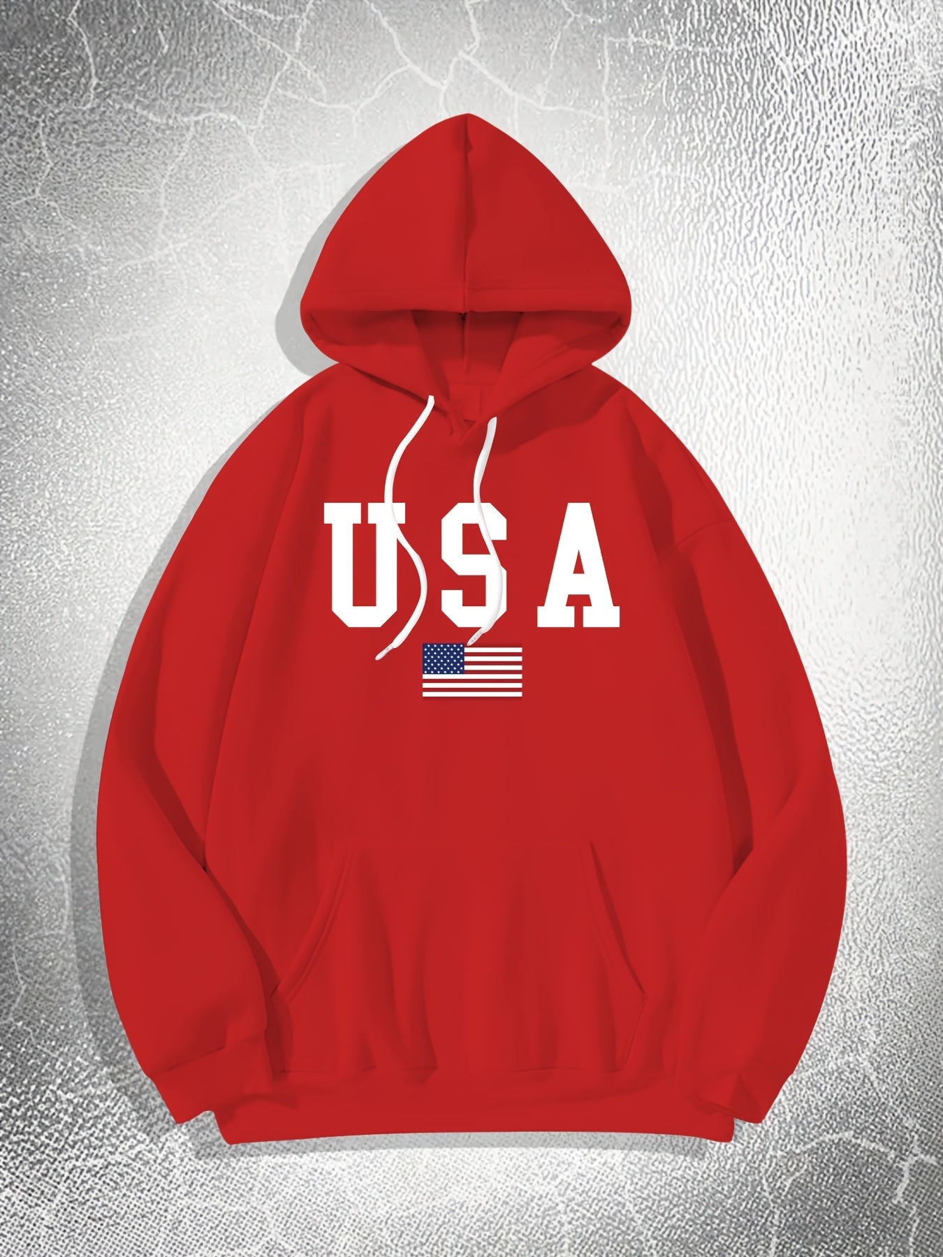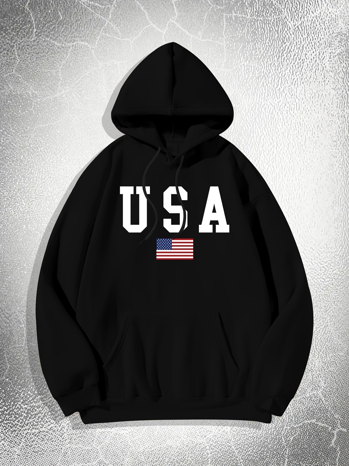 USA Flag Print Men's Long Sleeve Hooded Sweatshirt, Trendy Pullover Hoodie With Kangaroo Pocket, Casual Comfortable Versatile Top For Spring And Autumn