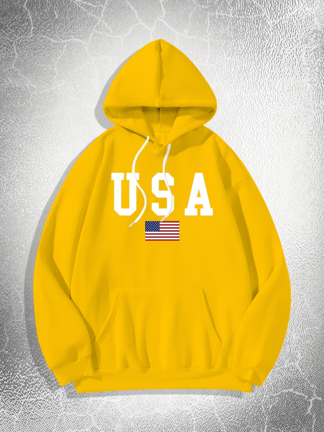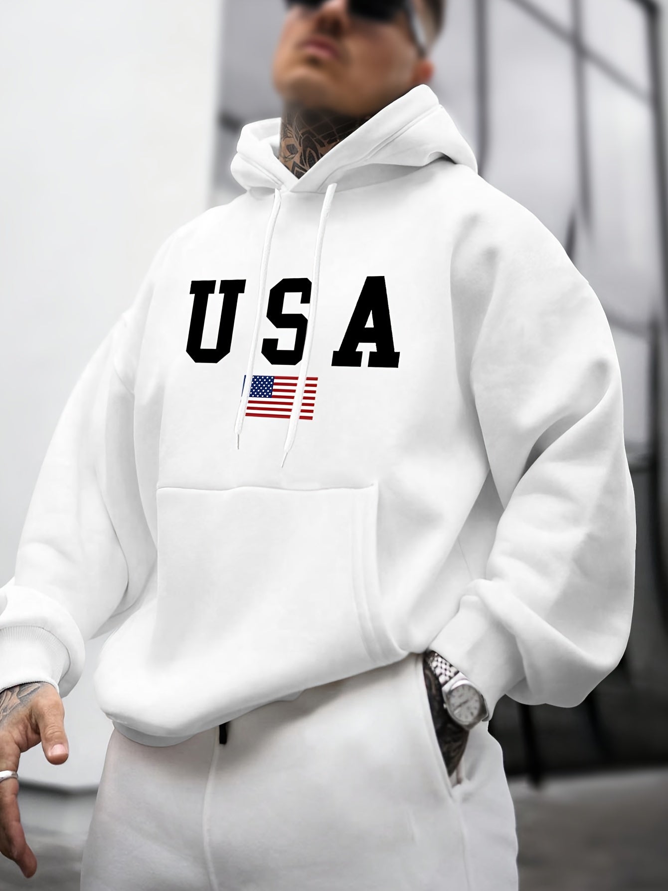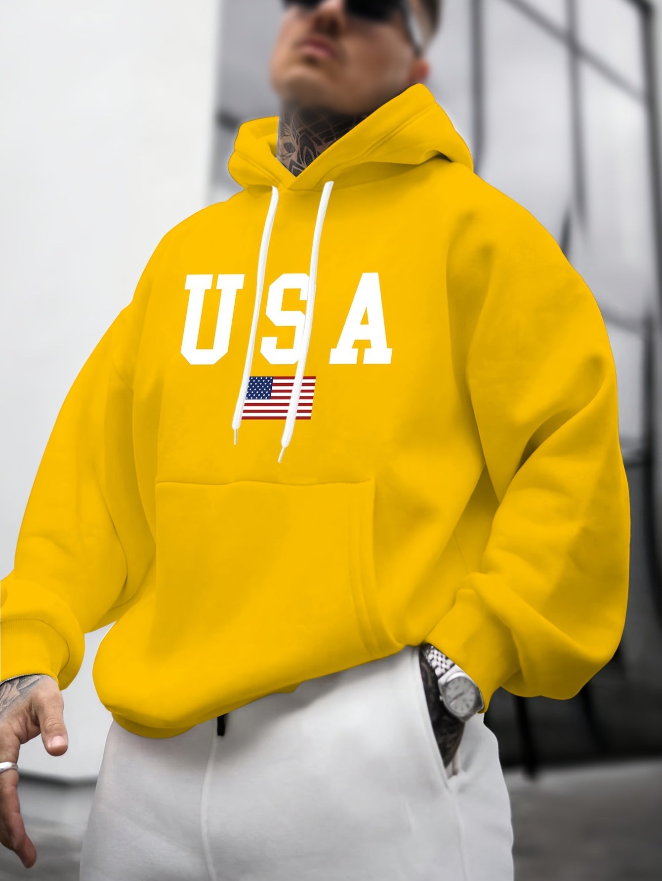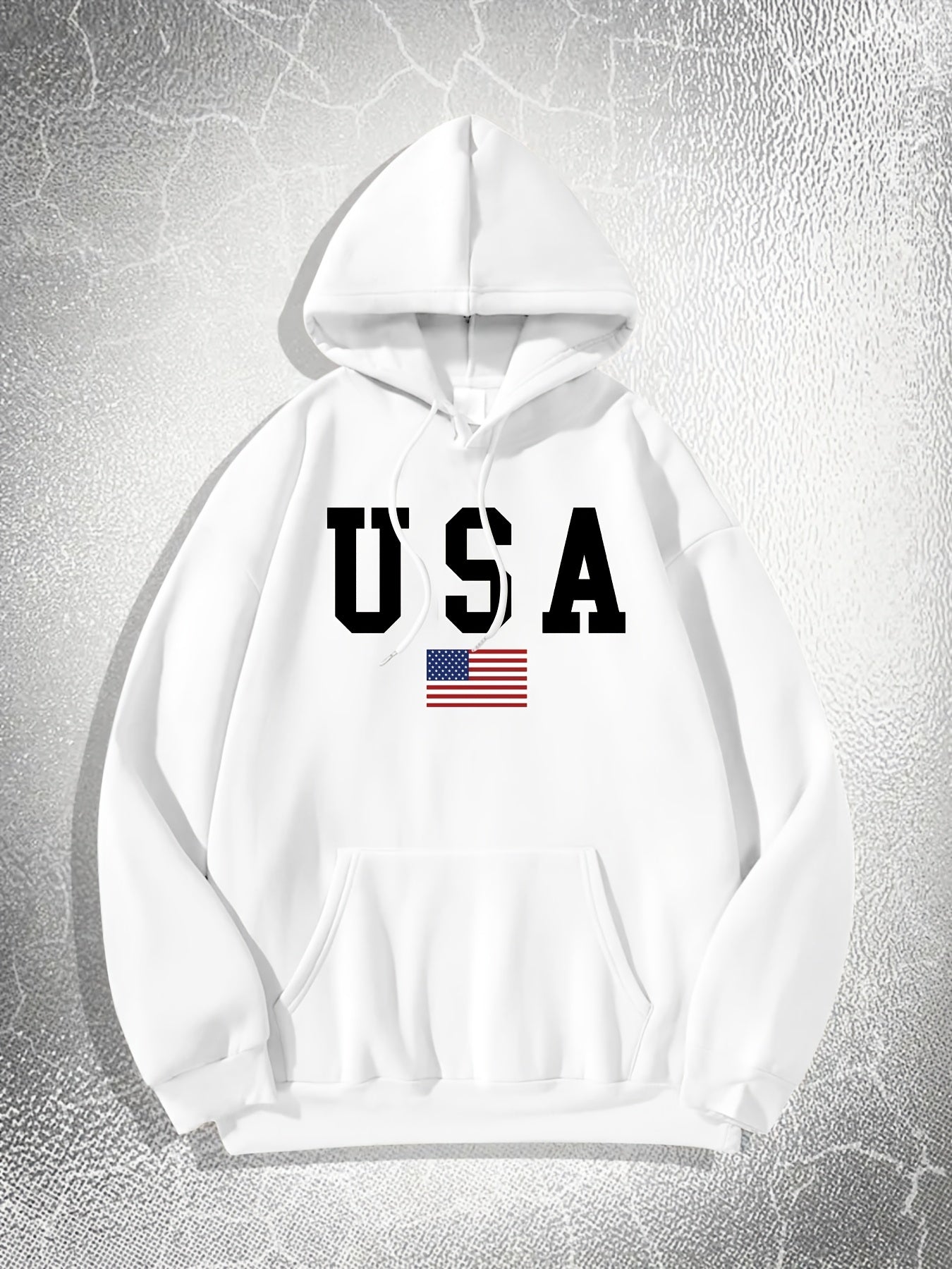 USA Flag Print Men's Long Sleeve Hooded Sweatshirt, Trendy Pullover Hoodie With Kangaroo Pocket, Casual Comfortable Versatile Top For Spring And Autumn