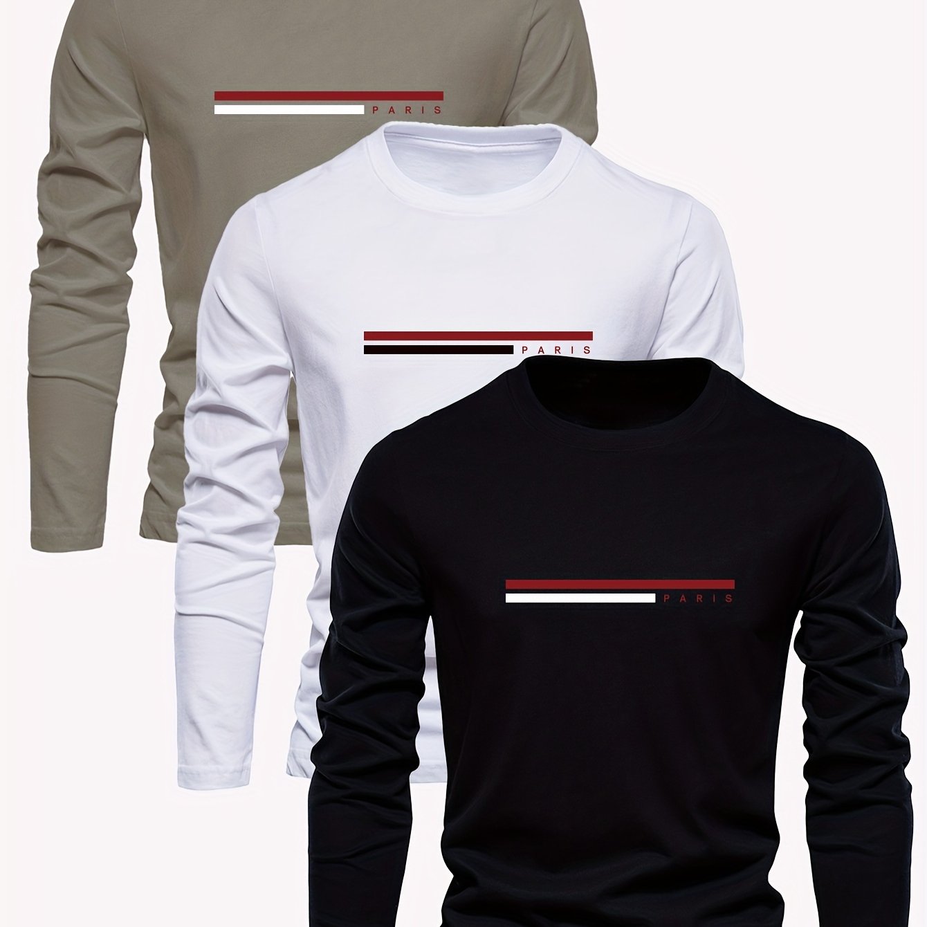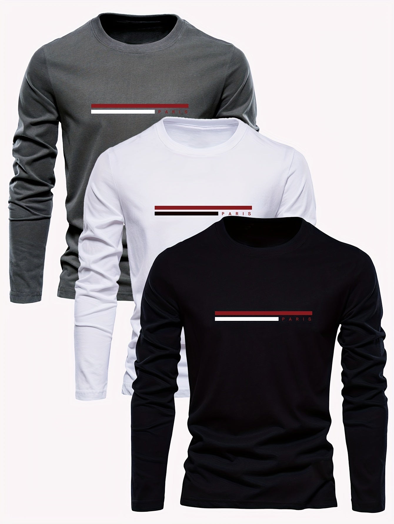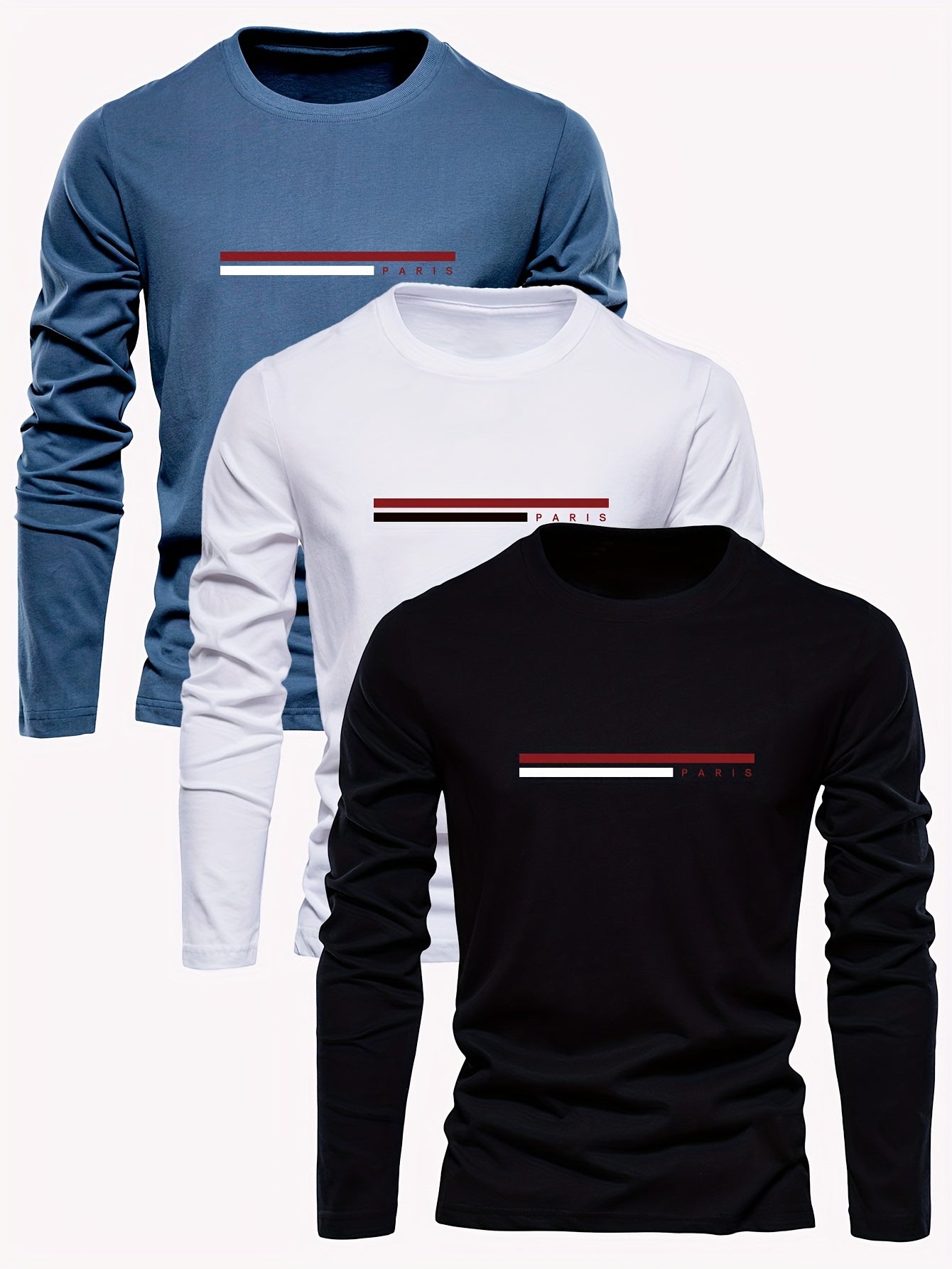 3pcs Men's Cotton Long Sleeve T-Shirts - Casual Round Neck Style
