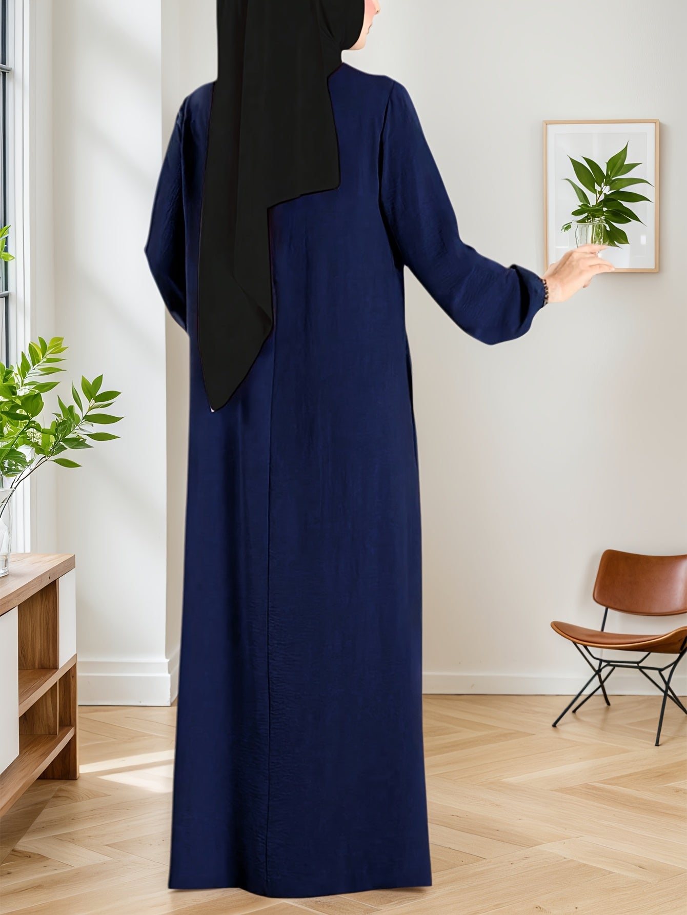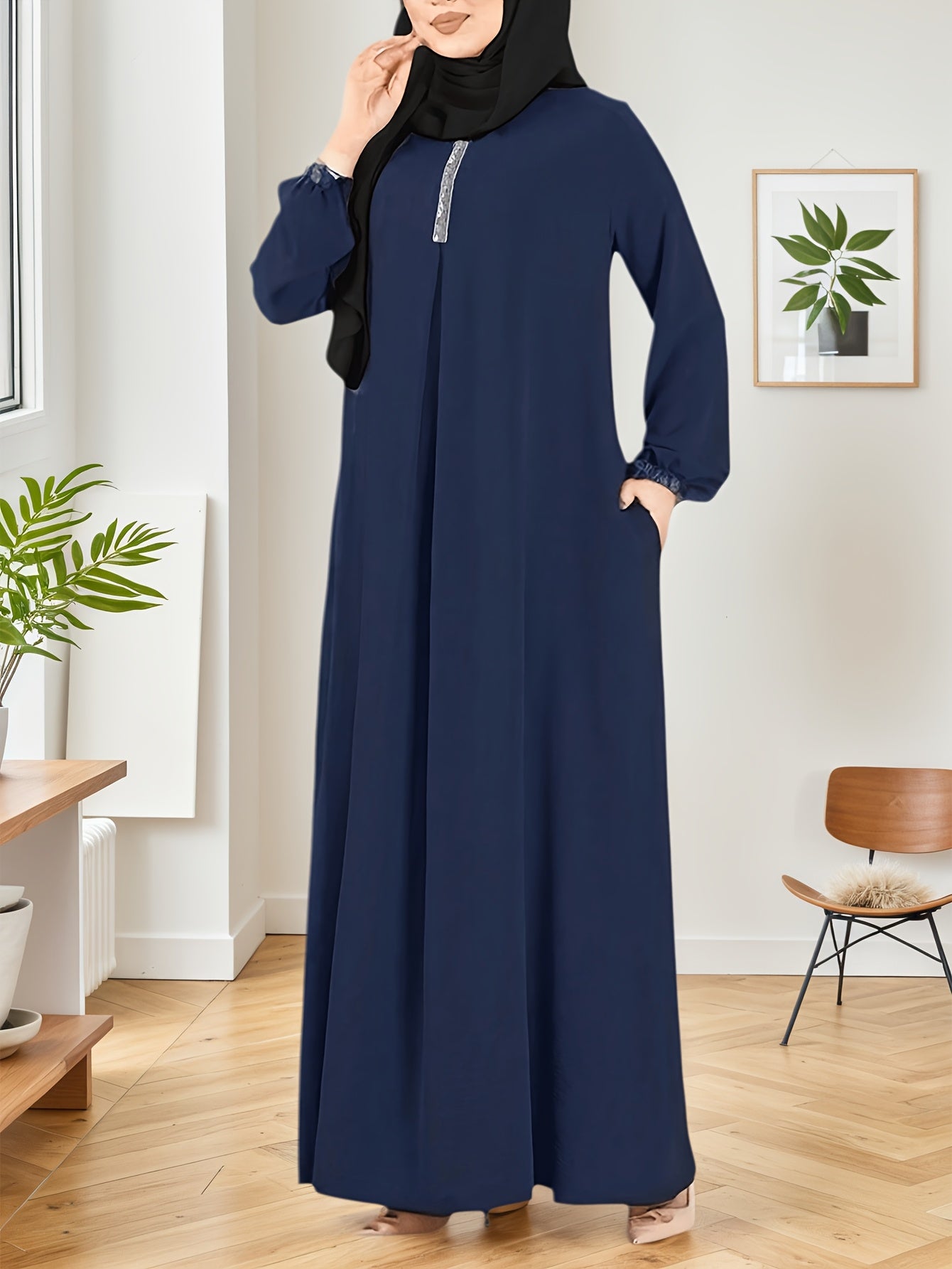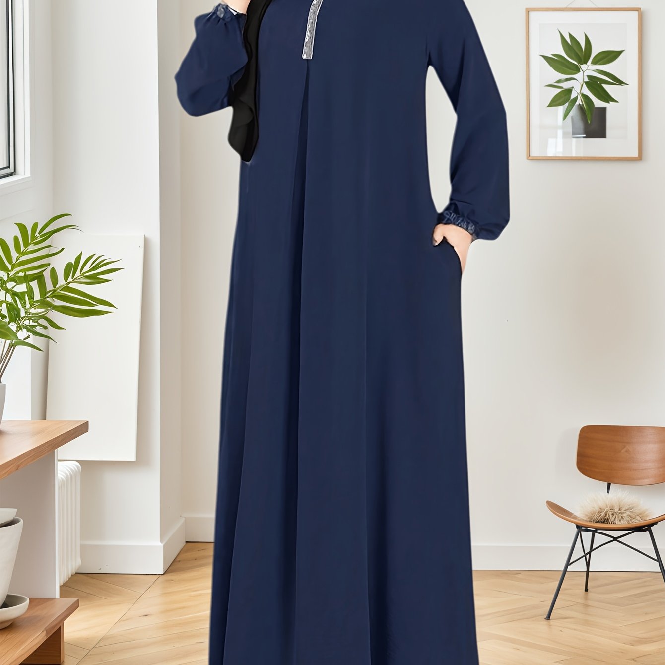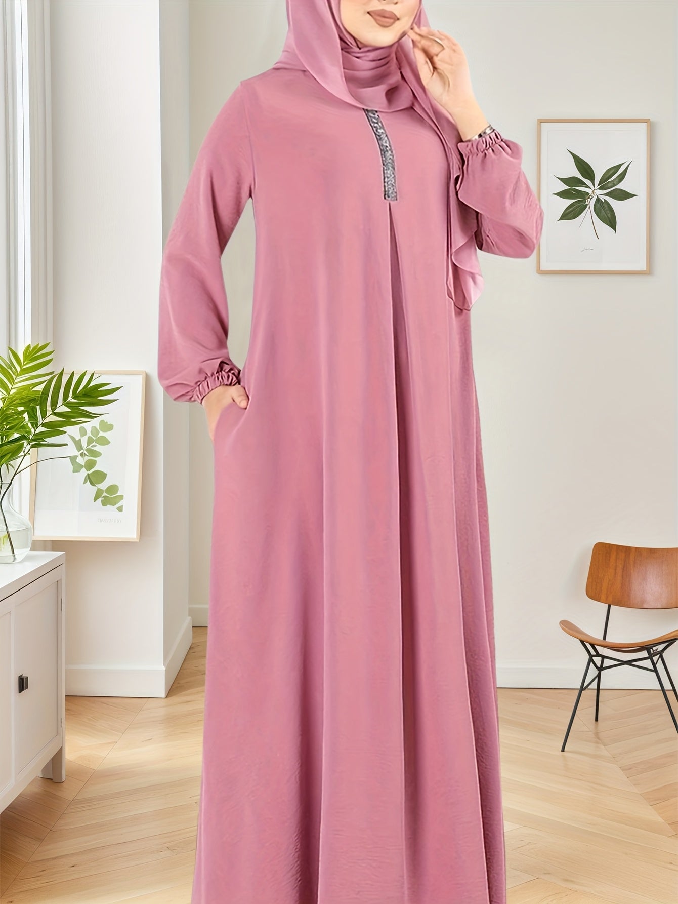 Elegant Women's Long Sleeve Abaya Dress - Solid Color, Side Pockets