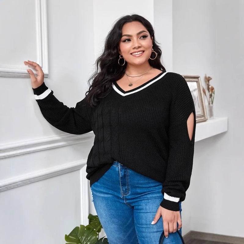 Women's Large Size V-Neck Sweater - Abstract Color Blocking Design