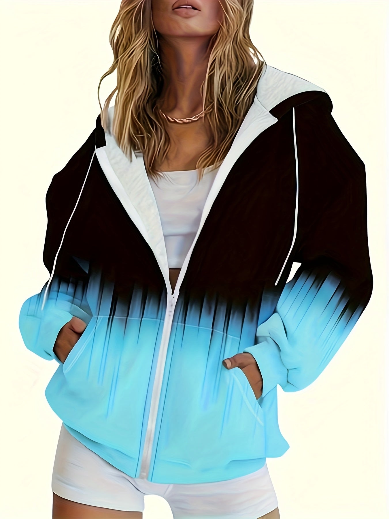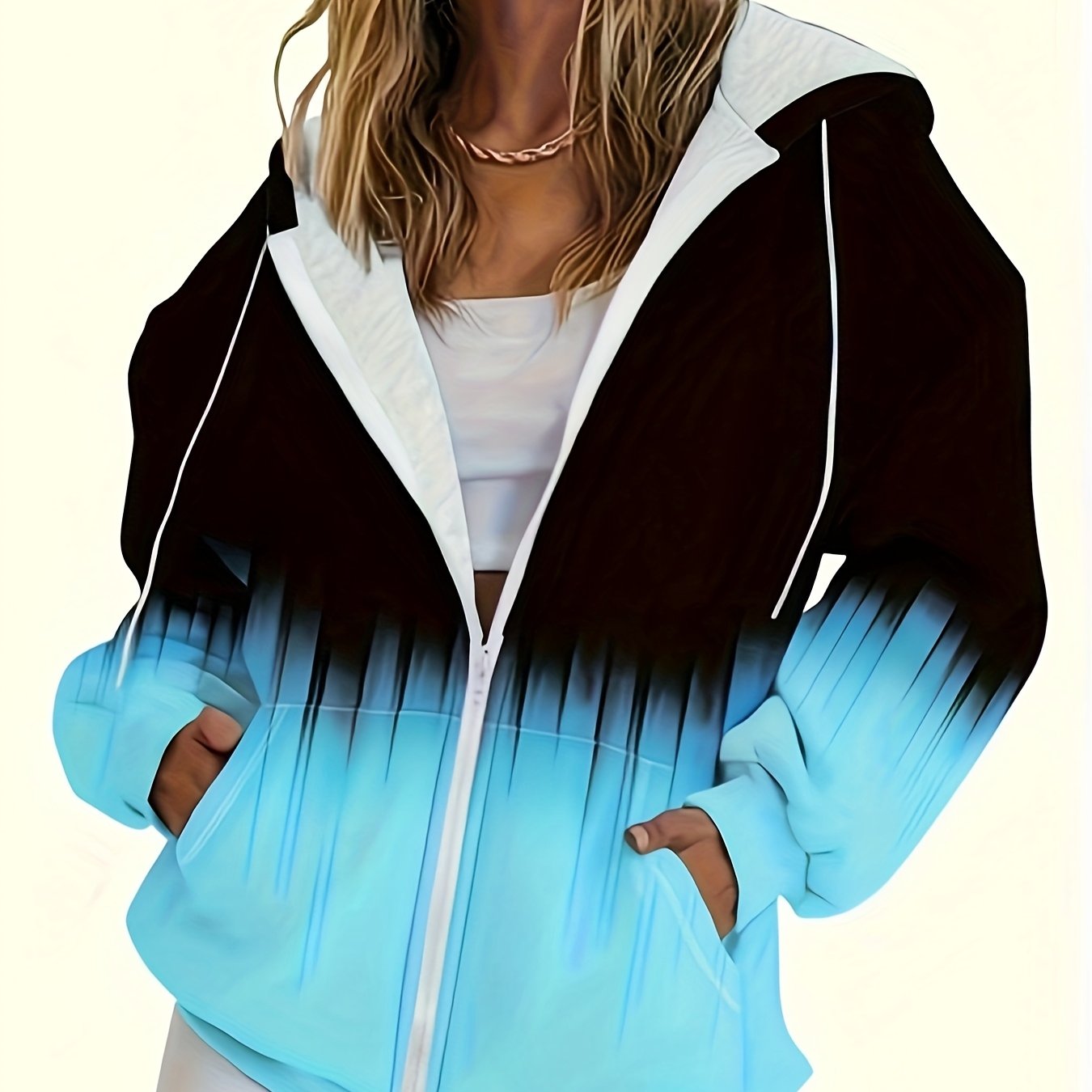 Introducing the Women's Oversized Hoodie in Dark Brown/Blue with Gradient Color Block design, perfect for your casual fall and winter wardrobe. This stylish pullover features an adjustable drawstring hood and a convenient zipper front, combining comfort and trendy aesthetics for everyday formal events.