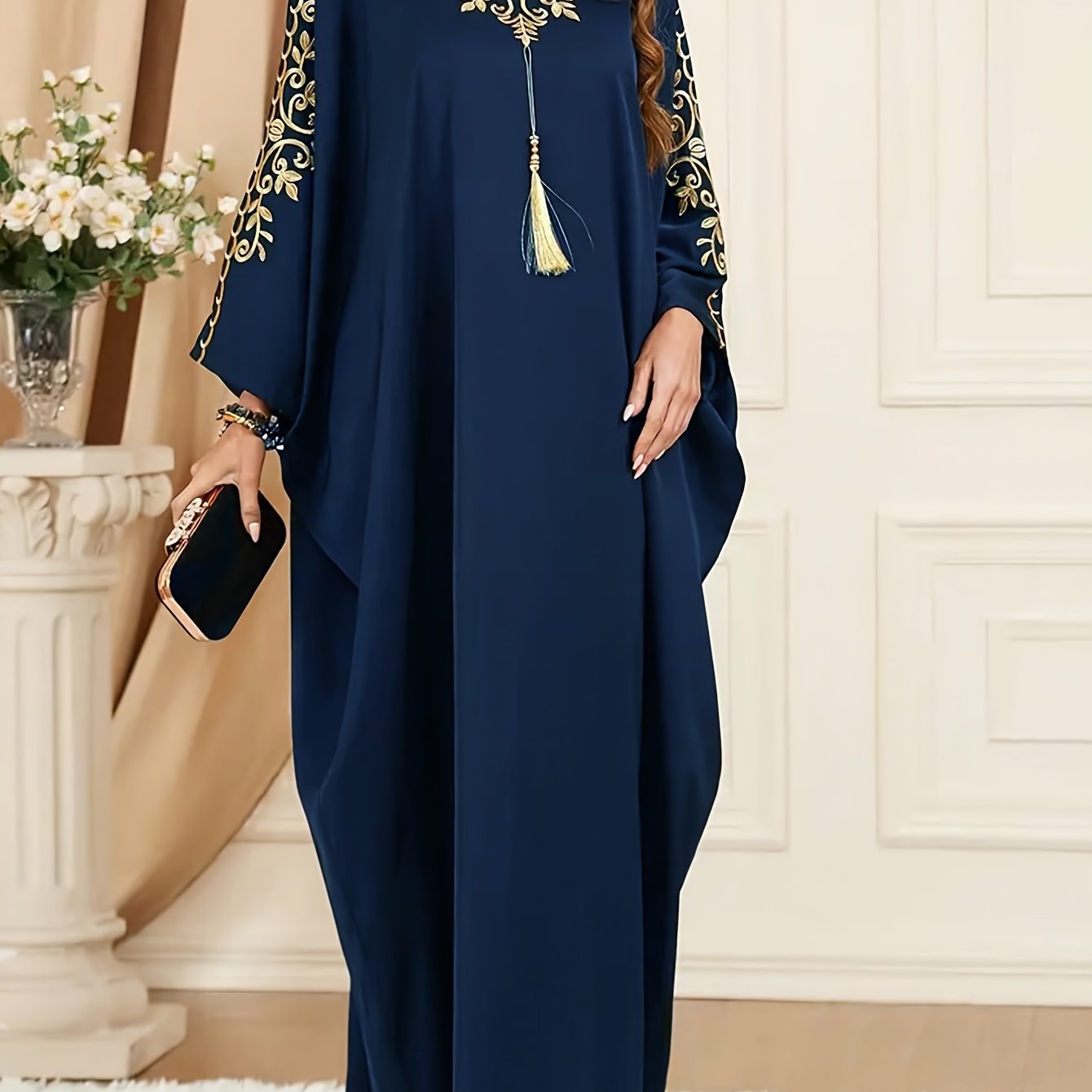 Discover the elegance and sophistication of our Elegant Floral Tassel Kaftan Dress, perfect for all seasons. Made from 100% polyester, this stylish dress features a crew neck and batwing sleeves, offering both comfort and style. Its exquisite floral design and fitted silhouette make it a must-have addition to your wardrobe.
