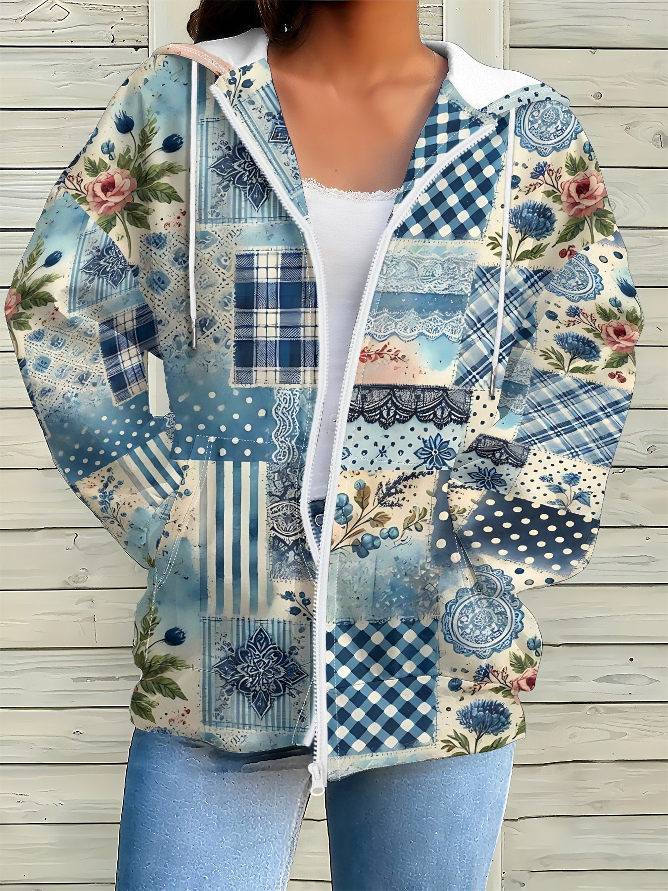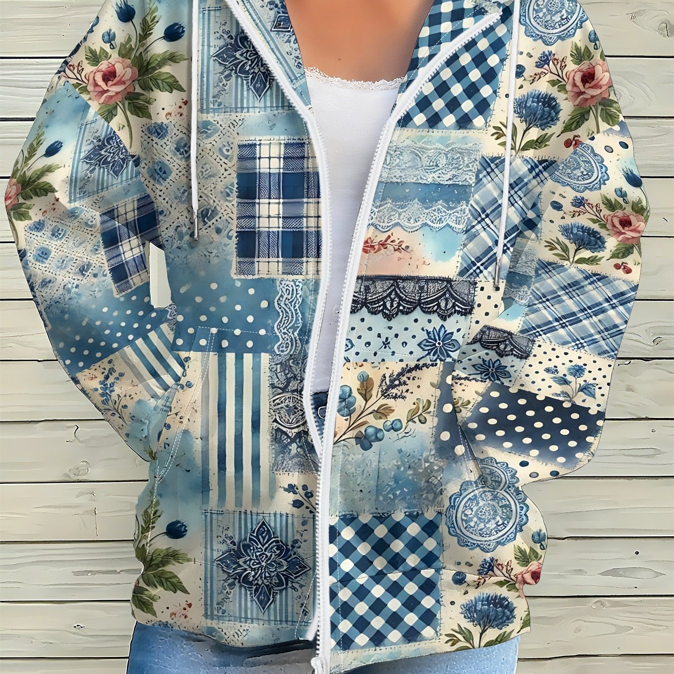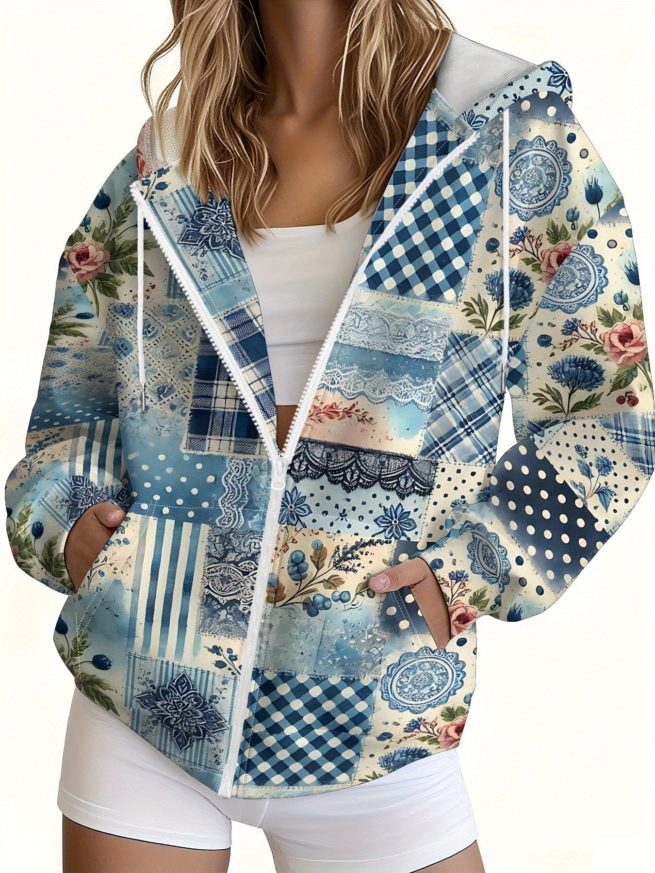 Women's Floral Patchwork Hoodie - Zipper Pullover for Casual Chic