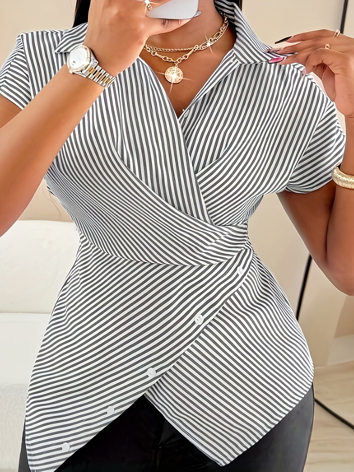 Elevate your casual wardrobe with our Elegant Women's Striped T-Print Button-Front Shirt featuring a chic asymmetrical hem. Crafted from 100% polyester, this shirt combines comfort and style, perfect for weekend outings or casual daywear.