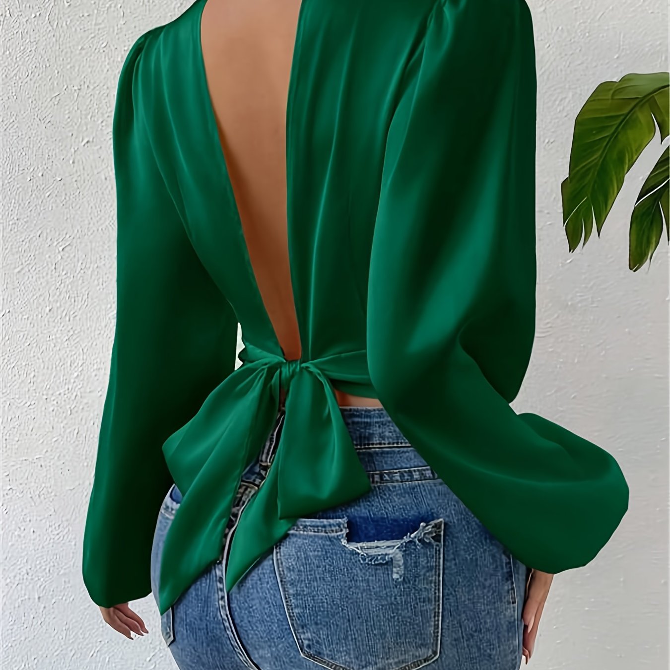 Elevate your wardrobe with our Elegant Backless Mock Neck Blouse, a stylish and sophisticated long sleeve women's top designed for versatile wear across seasons. Made from 100% polyester, this blouse features a chic tie-back detail and elegant high neck, perfect for casual or dressy occasions.