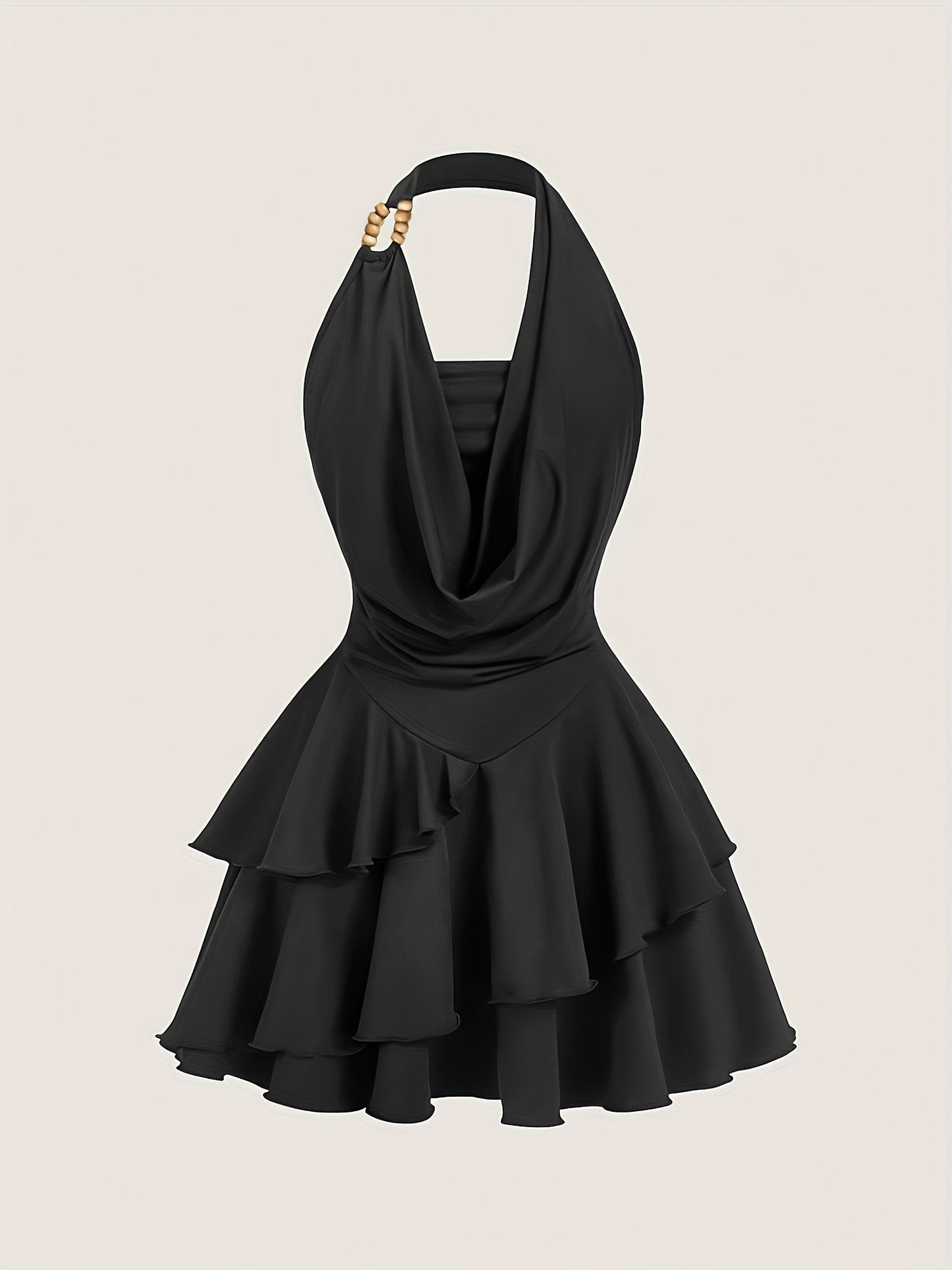Step out in style with the Women's Elegant Black Asymmetrical Mini Dress, designed for sophistication and comfort. Crafted from 100% polyester, this stunning backless halter neck dress is perfect for any occasion, seamlessly blending elegance with a modern twist.